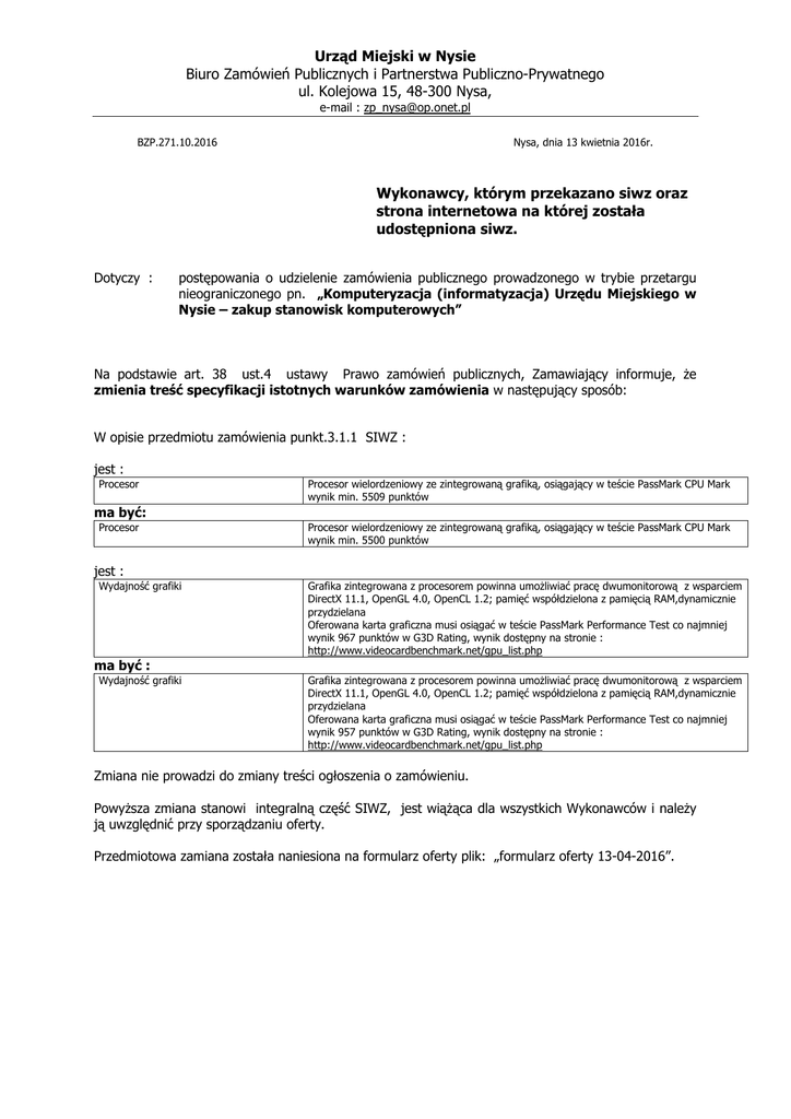 Urząd Miejski w Nysie Biuro Zamówień Publicznych i Partnerstwa Publiczno-Prywatnego ul. Kolejowa 15, 48-300 Nysa, e-mail : [email protected] BZP.271.10.2016 Nysa, dnia 13 kwietnia 2016r. Wykonawcy, którym przekazano siwz oraz strona internetowa na której została udostępniona siwz. Dotyczy : postępowania o udzielenie zamówienia publicznego prowadzonego w trybie przetargu nieograniczonego pn. „Komputeryzacja (informatyzacja) Urzędu Miejskiego w Nysie – zakup stanowisk komputerowych” Na podstawie art. 38 ust.4 ustawy Prawo zamówień publicznych, Zamawiający informuje, że zmienia treść specyfikacji istotnych warunków zamówienia w następujący sposób: W opisie przedmiotu zamówienia punkt.3.1.1 SIWZ : jest : Procesor Procesor wielordzeniowy ze zintegrowaną grafiką, osiągający w teście PassMark CPU Mark wynik min. 5509 punktów ma być: Procesor Procesor wielordzeniowy ze zintegrowaną grafiką, osiągający w teście PassMark CPU Mark wynik min. 5500 punktów jest : Wydajność grafiki Grafika zintegrowana z procesorem powinna umożliwiać pracę dwumonitorową z wsparciem DirectX 11.1, OpenGL 4.0, OpenCL 1.2; pamięć współdzielona z pamięcią RAM,dynamicznie przydzielana Oferowana karta graficzna musi osiągać w teście PassMark Performance Test co najmniej wynik 967 punktów w G3D Rating, wynik dostępny na stronie : http://www.videocardbenchmark.net/gpu_list.php ma być : Wydajność grafiki Grafika zintegrowana z procesorem powinna umożliwiać pracę dwumonitorową z wsparciem DirectX 11.1, OpenGL 4.0, OpenCL 1.2; pamięć współdzielona z pamięcią RAM,dynamicznie przydzielana Oferowana karta graficzna musi osiągać w teście PassMark Performance Test co najmniej wynik 957 punktów w G3D Rating, wynik dostępny na stronie : http://www.videocardbenchmark.net/gpu_list.php Zmiana nie prowadzi do zmiany treści ogłoszenia o zamówieniu. Powyższa zmiana stanowi integralną część SIWZ, jest wiążąca dla wszystkich Wykonawców i należy ją uwzględnić przy sporządzaniu oferty. Przedmiotowa zamiana została naniesiona na formularz oferty plik: „formularz oferty 13-04-2016”.