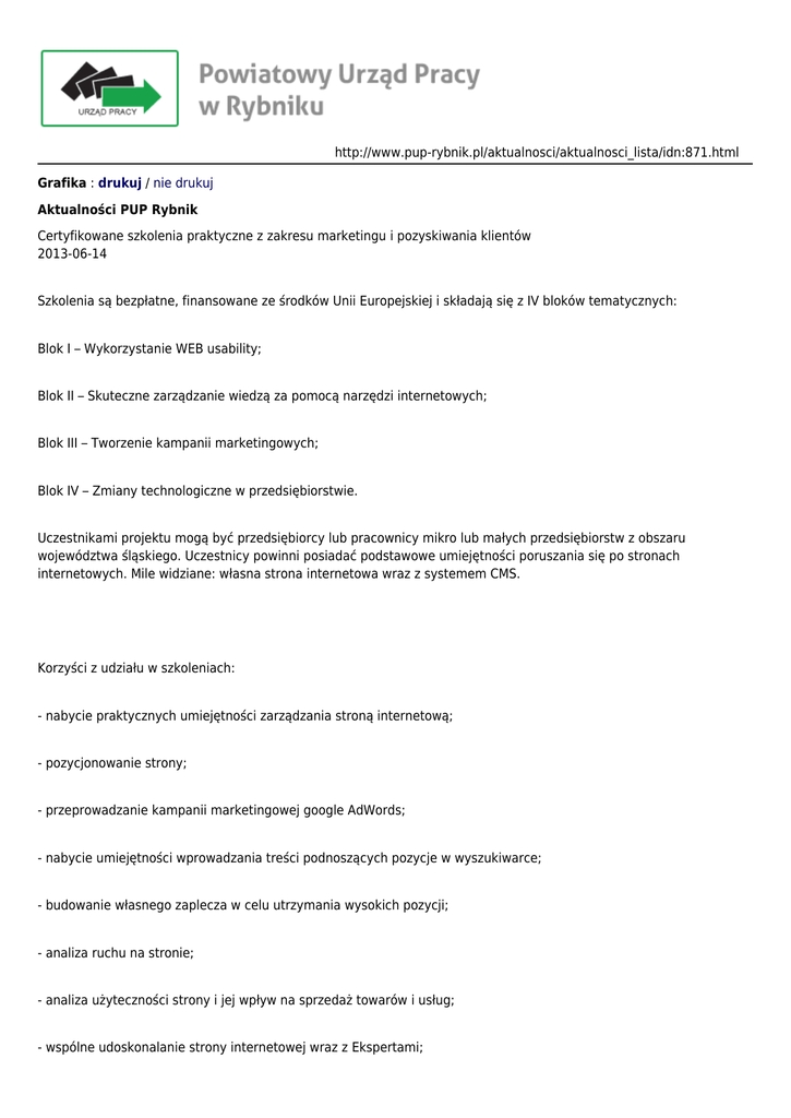 http://www.pup-rybnik.pl/aktualnosci/aktualnosci_lista/idn:871.html Grafika : drukuj / nie drukuj Aktualności PUP Rybnik Certyfikowane szkolenia praktyczne z zakresu marketingu i pozyskiwania klientów 2013-06-14 Szkolenia są bezpłatne, finansowane ze środków Unii Europejskiej i składają się z IV bloków tematycznych: Blok I – Wykorzystanie WEB usability; Blok II – Skuteczne zarządzanie wiedzą za pomocą narzędzi internetowych; Blok III – Tworzenie kampanii marketingowych; Blok IV – Zmiany technologiczne w przedsiębiorstwie. Uczestnikami projektu mogą być przedsiębiorcy lub pracownicy mikro lub małych przedsiębiorstw z obszaru województwa śląskiego. Uczestnicy powinni posiadać podstawowe umiejętności poruszania się po stronach internetowych. Mile widziane: własna strona internetowa wraz z systemem CMS. Korzyści z udziału w szkoleniach: - nabycie praktycznych umiejętności zarządzania stroną internetową; - pozycjonowanie strony; - przeprowadzanie kampanii marketingowej google AdWords; - nabycie umiejętności wprowadzania treści podnoszących pozycje w wyszukiwarce; - budowanie własnego zaplecza w celu utrzymania wysokich pozycji; - analiza ruchu na stronie; - analiza użyteczności strony i jej wpływ na sprzedaż towarów i usług; - wspólne udoskonalanie strony internetowej wraz z Ekspertami; (dla każdego Uczestnika przewidziane są indywidualne sesje doradcze). Szkolenia odbywają się w Bielsku – Białej w systemie: 4 dwudniowe spotkania, po jednym zjeździe w miesiącu. Więcej informacji na stronie projektu: www.timmp.pl lub pod numerem telefonu: 516979988. wszystkie wiadomości ›