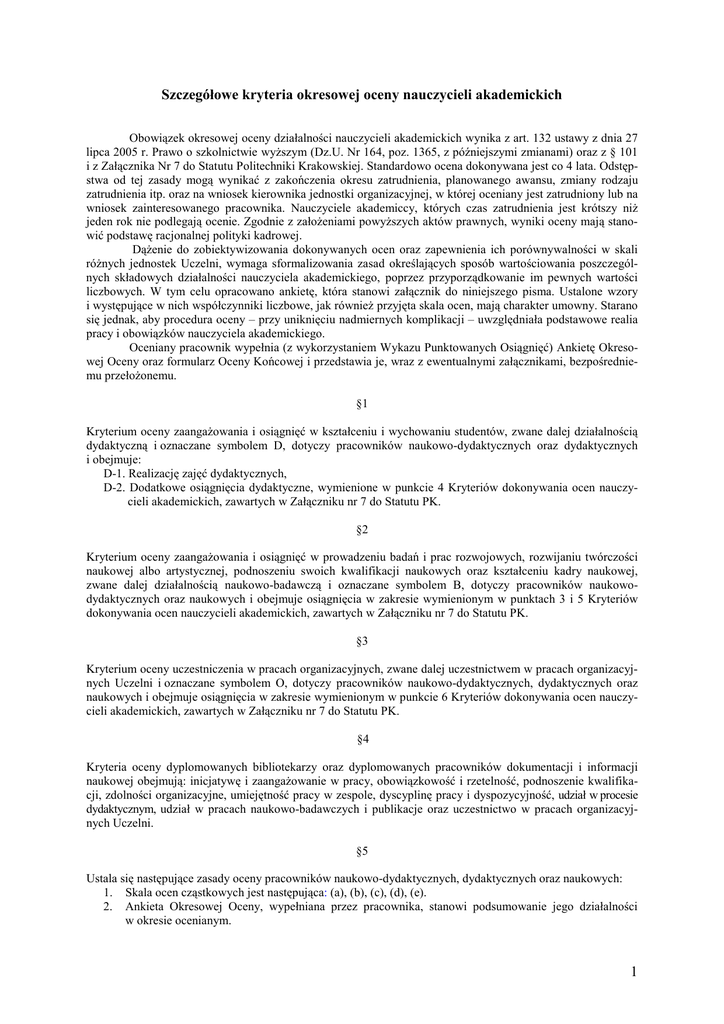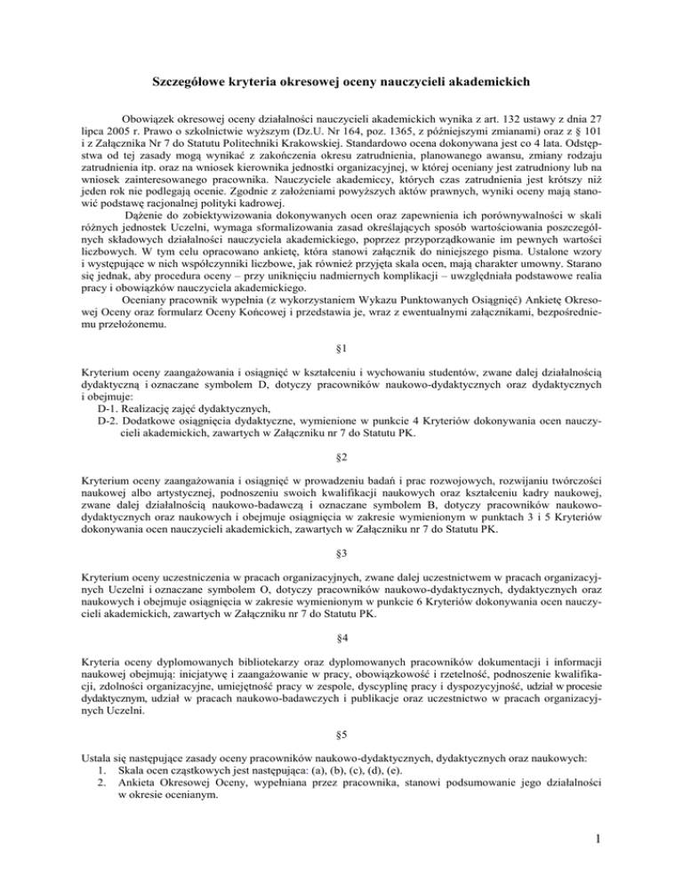Szczegółowe kryteria okresowej oceny nauczycieli akademickich Obowiązek okresowej oceny działalności nauczycieli akademickich wynika z art. 132 ustawy z dnia 27 lipca 2005 r. Prawo o szkolnictwie wyŜszym (Dz.U. Nr 164, poz. 1365, z późniejszymi zmianami) oraz z § 101 i z Załącznika Nr 7 do Statutu Politechniki Krakowskiej. Standardowo ocena dokonywana jest co 4 lata. Odstępstwa od tej zasady mogą wynikać z zakończenia okresu zatrudnienia, planowanego awansu, zmiany rodzaju zatrudnienia itp. oraz na wniosek kierownika jednostki organizacyjnej, w której oceniany jest zatrudniony lub na wniosek zainteresowanego pracownika. Nauczyciele akademiccy, których czas zatrudnienia jest krótszy niŜ jeden rok nie podlegają ocenie. Zgodnie z załoŜeniami powyŜszych aktów prawnych, wyniki oceny mają stanowić podstawę racjonalnej polityki kadrowej. DąŜenie do zobiektywizowania dokonywanych ocen oraz zapewnienia ich porównywalności w skali róŜnych jednostek Uczelni, wymaga sformalizowania zasad określających sposób wartościowania poszczególnych składowych działalności nauczyciela akademickiego, poprzez przyporządkowanie im pewnych wartości liczbowych. W tym celu opracowano ankietę, która stanowi załącznik do niniejszego pisma. Ustalone wzory i występujące w nich współczynniki liczbowe, jak równieŜ przyjęta skala ocen, mają charakter umowny. Starano się jednak, aby procedura oceny – przy uniknięciu nadmiernych komplikacji – uwzględniała podstawowe realia pracy i obowiązków nauczyciela akademickiego. Oceniany pracownik wypełnia (z wykorzystaniem Wykazu Punktowanych Osiągnięć) Ankietę Okresowej Oceny oraz formularz Oceny Końcowej i przedstawia je, wraz z ewentualnymi załącznikami, bezpośredniemu przełoŜonemu. §1 Kryterium oceny zaangaŜowania i osiągnięć w kształceniu i wychowaniu studentów, zwane dalej działalnością dydaktyczną i oznaczane symbolem D, dotyczy pracowników naukowo-dydaktycznych oraz dydaktycznych i obejmuje: D-1. Realizację zajęć dydaktycznych, D-2. Dodatkowe osiągnięcia dydaktyczne, wymienione w punkcie 4 Kryteriów dokonywania ocen nauczycieli akademickich, zawartych w Załączniku nr 7 do Statutu PK. §2 Kryterium oceny zaangaŜowania i osiągnięć w prowadzeniu badań i prac rozwojowych, rozwijaniu twórczości naukowej albo artystycznej, podnoszeniu swoich kwalifikacji naukowych oraz kształceniu kadry naukowej, zwane dalej działalnością naukowo-badawczą i oznaczane symbolem B, dotyczy pracowników naukowodydaktycznych oraz naukowych i obejmuje osiągnięcia w zakresie wymienionym w punktach 3 i 5 Kryteriów dokonywania ocen nauczycieli akademickich, zawartych w Załączniku nr 7 do Statutu PK. §3 Kryterium oceny uczestniczenia w pracach organizacyjnych, zwane dalej uczestnictwem w pracach organizacyjnych Uczelni i oznaczane symbolem O, dotyczy pracowników naukowo-dydaktycznych, dydaktycznych oraz naukowych i obejmuje osiągnięcia w zakresie wymienionym w punkcie 6 Kryteriów dokonywania ocen nauczycieli akademickich, zawartych w Załączniku nr 7 do Statutu PK. §4 Kryteria oceny dyplomowanych bibliotekarzy oraz dyplomowanych pracowników dokumentacji i informacji naukowej obejmują: inicjatywę i zaangaŜowanie w pracy, obowiązkowość i rzetelność, podnoszenie kwalifikacji, zdolności organizacyjne, umiejętność pracy w zespole, dyscyplinę pracy i dyspozycyjność, udział w procesie dydaktycznym, udział w pracach naukowo-badawczych i publikacje oraz uczestnictwo w pracach organizacyjnych Uczelni. §5 Ustala się następujące zasady oceny pracowników naukowo-dydaktycznych, dydaktycznych oraz naukowych: 1. Skala ocen cząstkowych jest następująca: (a), (b), (c), (d), (e). 2. Ankieta Okresowej Oceny, wypełniana przez pracownika, stanowi podsumowanie jego działalności w okresie ocenianym. 1 3. 4. 5. 6. 7. W ocenie bezpośredniego przełoŜonego naleŜy uwzględnić dane zawarte w ankiecie pracownika, a ponadto wyniki hospitacji zajęć i wyniki ankiet studenckich (jeŜeli ankietyzacja była przeprowadzana). Oceniający moŜe przy formułowaniu oceny uwzględnić osiągnięcia i okoliczności nie przewidziane w ankiecie. Za pozytywne oceny uznaje się: (a), (b), (c) i (d), przy czym ocena (d) jest sygnałem ostrzegawczym i mobilizującym, wskazującym na potrzebę poprawienia wyników pracy. Ocena (e) jest oceną negatywną. W przypadku otrzymania przez nauczyciela akademickiego oceny „negatywna”, dodatkową ocenę przeprowadza się po upływie roku. Ocena ta obejmuje równieŜ okres czteroletni. Jeśli którakolwiek ocena oceniającego róŜni się od oceny wynikającej z informacji własnej ocenianego obowiązkowe jest pisemne uzasadnienie tej oceny. §6 Ustala się następujące zasady oceny dyplomowanych bibliotekarzy oraz dyplomowanych pracowników dokumentacji i informacji naukowej. 1. Ankieta Okresowej Oceny wypełniana przez pracownika, stanowi podsumowanie jego działalności w okresie ocenianym. 2. W ocenie bezpośredniego przełoŜonego naleŜy uwzględnić dane zawarte w ankiecie pracownika. Oceniający moŜe przy formułowaniu oceny uwzględnić osiągnięcia i okoliczności nie przewidziane w ankiecie. 3. Ustala się następującą skalę ocen końcowych: (a), (b), (c), (d), (e). 4. Za pozytywne oceny uznaje się: (a), (b), (c) i (d), przy czym ocena (d) jest sygnałem ostrzegawczym i mobilizującym, wskazującym na potrzebę poprawienia wyników pracy. 5. Ocena (e) jest oceną negatywną. 6. W przypadku otrzymania oceny końcowej „negatywna”, dodatkową ocenę przeprowadza się po upływie roku. Ocena ta obejmuje równieŜ okres czteroletni. 7. W przypadku wystawienia przez przełoŜonego oceny „negatywna” obowiązkowe jest pisemne uzasadnienie tej oceny. §7 1. 2. Ustala się wzór Ankiety Okresowej Oceny Nauczyciela Akademickiego PK, podany w Załączniku Nr 1, oraz formularz Oceny Końcowej do Ankiety Okresowej Oceny Nauczyciela Akademickiego PK, p