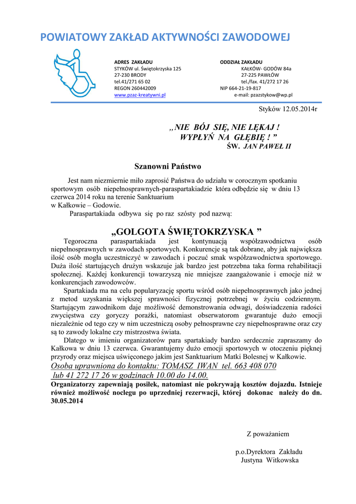 POWIATOWY ZAKŁAD AKTYWNOŚCI ZAWODOWEJ ADRES ZAKŁADU STYKÓW ul. Świętokrzyska 125 27-230 BRODY tel.41/271 65 02 REGON 260442009 www.pzaz-kreatywni.pl ODDZIAŁ ZAKŁADU KAŁKÓW- GODÓW 84a 27-225 PAWŁÓW tel./fax. 41/272 17 26 NIP 664-21-19-817 e-mail: [email protected] Styków 12.05.2014r „NIE BÓJ SIĘ, NIE LĘKAJ ! WYPŁYŃ NA GŁĘBIĘ ! ” ŚW. JAN PAWEŁ II Szanowni Państwo Jest nam niezmiernie miło zaprosić Państwa do udziału w corocznym spotkaniu sportowym osób niepełnosprawnych-paraspartakiadzie która odbędzie się w dniu 13 czerwca 2014 roku na terenie Sanktuarium w Kałkowie – Godowie. Paraspartakiada odbywa się po raz szósty pod nazwą: „GOLGOTA ŚWIĘTOKRZYSKA ” Tegoroczna paraspartakiada jest kontynuacją współzawodnictwa osób niepełnosprawnych w zawodach sportowych. Konkurencje są tak dobrane, aby jak największa ilość osób mogła uczestniczyć w zawodach i poczuć smak współzawodnictwa sportowego. Duża ilość startujących drużyn wskazuje jak bardzo jest potrzebna taka forma rehabilitacji społecznej. Każdej konkurencji towarzyszą nie mniejsze zaangażowanie i emocje niż w konkurencjach zawodowców. Spartakiada ma na celu popularyzację sportu wśród osób niepełnosprawnych jako jednej z metod uzyskania większej sprawności fizycznej potrzebnej w życiu codziennym. Startującym zawodnikom daje możliwość demonstrowania odwagi, doświadczenia radości zwycięstwa czy goryczy porażki, natomiast obserwatorom gwarantuje dużo emocji niezależnie od tego czy w nim uczestniczą osoby pełnosprawne czy niepełnosprawne oraz czy są to zawody lokalne czy mistrzostwa świata. Dlatego w imieniu organizatorów para spartakiady bardzo serdecznie zapraszamy do Kałkowa w dniu 13 czerwca. Gwarantujemy dużo emocji sportowych w otoczeniu pięknej przyrody oraz miejsca uświęconego jakim jest Sanktuarium Matki Bolesnej w Kałkowie. Osoba uprawniona do kontaktu: TOMASZ IWAN tel. 663 408 070 lub 41 272 17 26 w godzinach 10.00 do 14.00. Organizatorzy zapewniają posiłek, natomiast nie pokrywają kosztów dojazdu. Istnieje również możliwość noclegu po uprzedniej rezerwacji, której dokonac należy do dn. 30.05.2014 Z poważaniem p.o.Dyrektora Zakładu Justyna Witkowska PARASPARTAKIADA W KAŁKOWIE - GODOWIE „ GOLGOTA ŚWIĘTOKRZYSKA 2014” GOLGOTA 2014 RAMOWY PROGRAM PARASPARTAKIADY Spartakiada odbywa się pod patronatem honorowym Marszałka Województwa Świętokrzyskiego Data: Godzina rozpoczęcia Msza Święta Godzina zakończenia: Miejsce: Organizator: 13 czerwiec 2014 9.30 rejestracja uczestników 10.00 16.00 Teren Sanktuarium w Kałkowie- Godowie Powiatowy Zakład Aktywności Zawodowej Parafia Rzymsko-Katolicka w Kałkowie-Godowie, Stowarzyszenie „Przyjacielska Dłoń”, Zrzeszenie Sportu i Rehabilitacji „ Start” w Kielcach Biuro Organizatora: PZAZ, Tel/fax: 41 272 17 26, [email protected] Osoba odpowiedzialna: Tomasz Iwan tel. 663 408 070 lub 41 272 17 26 Klasyfikacje: Prowadzona jest klasyfikacja indywidualna, pierwsze trzy miejsca nagrodzone są medalami (złoty, srebrny, brązowy),w konkurencjach zespołowych medale otrzymują zawodnicy, których drużyny zajęły pierwsze trzy miejsca, W klasyfikacji ogólnej zwycięski zespół otrzymuje „ PUCHAR PRZECHODNI ” Marszałka Województwa Konkurencje sportowe: 1. RZUT LOTKĄ DO TARCZY Konkurencja ogólnodostępna, mogą uczestniczyć wszyscy uczestnicy zawodów. Odległość do tarczy 2 metry. Każdy z uczestników wykonuje 3 rzuty. O kolejności miejsca decyduje suma punktów z trzech rzutów. Do punktacji generalnej zespołu liczą się punkty za zajęcie przez zawodnika miejsca: I miejsce – 8 punktów, II miejsce – 6 punktów, III miejsce – 4 punkty, IV miejsce – 3 punkty, V miejsce – 2 punkty, VI miejsce - 1 punkt. 2. RINGO Konkurencja ogólnodostępna, mogą uczestniczyć wszyscy uczestnicy Zawodów. Odległość rzutu 4 metry każdy z uczestników wykonuje 3 rzuty. O kolejności miejsca decyduje suma punktów z trzech rzutów. Do punktacji generalnej zespołu liczą się punkty za zajęcie przez zawodnika miejsca: I miejsce – 8 punktów, II miejsce – 6 punktów, III miejsce – 4 punkty, IV miejsce – 3 punkty, V miejsce – 2 punkty, VI miejsce - 1 punkt. 3. BIEG NA WÓZKACH Konkurencja indywidualna dla osób poruszających się na wózkach. Dystans 80 metrów, tor biegu równy i utwardzony. Konkurencja rozgrywana w kategorii kobiet i mężczyzn w systemie pucharowym, tzn. zwycięzca awansuje do dalszych rozgrywek W biegu uczestniczy dwóch zawodników o miejscu decyduje czas pokonania dystansu. Wygrywający awansuje do dalszych rozgrywek. Do punktacji generalnej zespołu liczą się punkty za zajęcie przez zawodnika miejsca: I miejsce – 8 punktów, II miejsce – 6 punktów, III miejsce – 4 punkty, IV miejsce – 3 punkty, 4. PRZECIĄGANIE LINY Konkurencja drużynowa, rozgrywana systemem pucharowym, tzn. zwycięzca awansuje do dalszych rozgrywek . Drużyna składa się z 5 zawodników. Do punktacji generalnej zespołu liczą się punkty za zajęcie przez drużynę miejsca: I miejsce – 8 punktów, II miejsce – 6 punktów, III miejsce – 4 punkty, IV miejsce – 3 punkty, 5 PIŁKA NOŻNA Konkurencja drużynowa, rozgrywana systemem pucharowym, tzn. zwycięzca awansuje do dalszych rozgrywek. Drużyna składa się z 5 zawodników łącznie z bramkarzem. Czas trwania meczu 2 x 15 minut. Do punktacji generalnej zespołu liczą się punkty za zajęcie przez drużynę miejsca: I miejsce – 8 punktów, II miejsce – 6 punktów, III miejsce – 4 punkty, IV miejsce – 3 punkty, 6 KONKURENCJE OPIEKUNÓW Tegoroczną imprezę uświetnią przeznaczone dla opiekunów drużyn dodatkowe konkurencje, które dadzą wspaniały przykład sportowej rywalizacji, zachęcą podopiecznych do startu i stworzą im możliwość dopingowania również swoim opiekunom. 6.1 RZUT WAŁKIEM DO CIASTA Konkurencja kobiet-indywidualna dla opiekunek zespołów. Rzut wałki