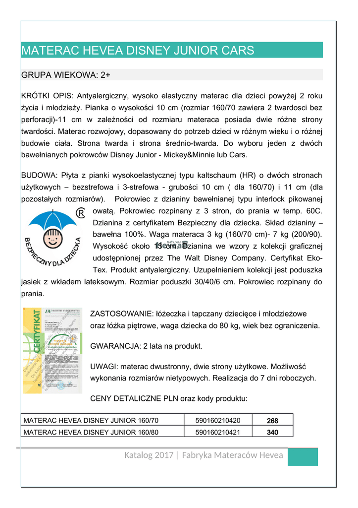MATERAC HEVEA DISNEY JUNIOR CARS GRUPA WIEKOWA: 2+ KRÓTKI OPIS: Antyalergiczny, wysoko elastyczny materac dla dzieci powyżej 2 roku życia i młodzieży. Pianka o wysokości 10 cm (rozmiar 160/70 zawiera 2 twardosci bez perforacji)-11 cm w zależności od rozmiaru materaca posiada dwie różne strony twardości. Materac rozwojowy, dopasowany do potrzeb dzieci w różnym wieku i o różnej budowie ciała. Strona twarda i strona średnio-twarda. Do wyboru jeden z dwóch bawełnianych pokrowców Disney Junior - Mickey&Minnie lub Cars. BUDOWA: Płyta z pianki wysokoelastycznej typu kaltschaum (HR) o dwóch stronach użytkowych – bezstrefowa i 3-strefowa - grubości 10 cm ( dla 160/70) i 11 cm (dla pozostałych rozmiarów). Pokrowiec z dzianiny bawełnianej typu interlock pikowanej owatą. Pokrowiec rozpinany z 3 stron, do prania w temp. 60C. Dzianina z certyfikatem Bezpieczny dla dziecka. Skład dzianiny – bawełna 100%. Waga materaca 3 kg (160/70 cm)- 7 kg (200/90). Wysokość około 13 cm. Dzianina we wzory z kolekcji graficznej udostępnionej przez The Walt Disney Company. Certyfikat EkoTex. Produkt antyalergiczny. Uzupełnieniem kolekcji jest poduszka jasiek z wkładem lateksowym. Rozmiar poduszki 30/40/6 cm. Pokrowiec rozpinany do prania. ZASTOSOWANIE: łóżeczka i tapczany dziecięce i młodzieżowe oraz łóżka piętrowe, waga dziecka do 80 kg, wiek bez ograniczenia. GWARANCJA: 2 lata na produkt. UWAGI: materac dwustronny, dwie strony użytkowe. Możliwość wykonania rozmiarów nietypowych. Realizacja do 7 dni roboczych. CENY DETALICZNE PLN oraz kody produktu: MATERAC HEVEA DISNEY JUNIOR 160/70 590160210420 268 MATERAC HEVEA DISNEY JUNIOR 160/80 590160210421 340 Katalog 2017 | Fabryka Materaców Hevea MATERAC HEVEA DISNEY JUNIOR 160/90 590160210422 358 MATERAC HEVEA DISNEY JUNIOR 180/80 590160210423 399 MATERAC HEVEA DISNEY JUNIOR 190/80 590160210424 399 MATERAC HEVEA DISNEY JUNIOR 180/90 590160210425 420 MATERAC HEVEA DISNEY JUNIOR 200/80 590160210426 399 MATERAC HEVEA DISNEY JUNIOR 190/90 590160210427 420 MATERAC HEVEA DISNEY JUNIOR 200/90 590160210428 420 PODUSZKA DISNEY JUNIOR 40/30 590160210429 62 Katalog 2017 | Fabryka Materaców Hevea Katalog 2017 | Fabryka Materaców Hevea Katalog 2017 | Fabryka Materaców Hevea