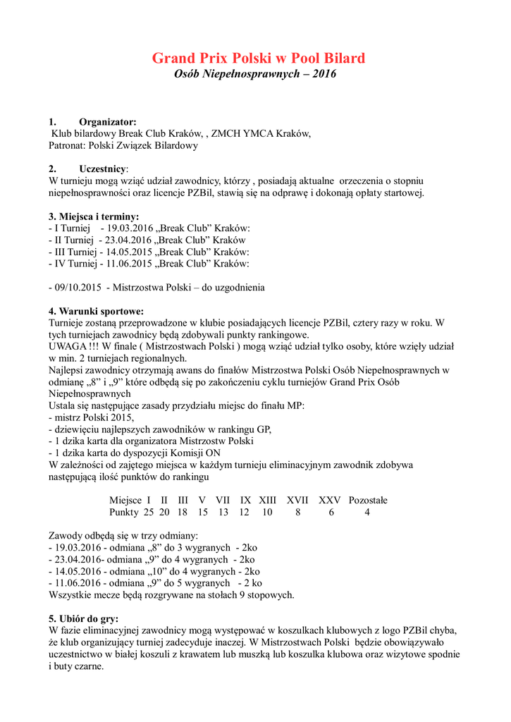 Grand Prix Polski w Pool Bilard Osób Niepełnosprawnych – 2016 1. Organizator: Klub bilardowy Break Club Kraków, , ZMCH YMCA Kraków, Patronat: Polski Związek Bilardowy 2. Uczestnicy: W turnieju mogą wziąć udział zawodnicy, którzy , posiadają aktualne orzeczenia o stopniu niepełnosprawności oraz licencje PZBil, stawią się na odprawę i dokonają opłaty startowej. 3. Miejsca i terminy: - I Turniej - 19.03.2016 „Break Club” Kraków: - II Turniej - 23.04.2016 „Break Club” Kraków - III Turniej - 14.05.2015 „Break Club” Kraków: - IV Turniej - 11.06.2015 „Break Club” Kraków: - 09/10.2015 - Mistrzostwa Polski – do uzgodnienia 4. Warunki sportowe: Turnieje zostaną przeprowadzone w klubie posiadających licencje PZBil, cztery razy w roku. W tych turniejach zawodnicy będą zdobywali punkty rankingowe. UWAGA !!! W finale ( Mistrzostwach Polski ) mogą wziąć udział tylko osoby, które wzięły udział w min. 2 turniejach regionalnych. Najlepsi zawodnicy otrzymają awans do finałów Mistrzostwa Polski Osób Niepełnosprawnych w odmianę „8” i „9” które odbędą się po zakończeniu cyklu turniejów Grand Prix Osób Niepełnosprawnych Ustala się następujące zasady przydziału miejsc do finału MP: - mistrz Polski 2015, - dziewięciu najlepszych zawodników w rankingu GP, - 1 dzika karta dla organizatora Mistrzostw Polski - 1 dzika karta do dyspozycji Komisji ON W zależności od zajętego miejsca w każdym turnieju eliminacyjnym zawodnik zdobywa następującą ilość punktów do rankingu Miejsce I II III V VII IX XIII Punkty 25 20 18 15 13 12 10 XVII XXV Pozostałe 8 6 4 Zawody odbędą się w trzy odmiany: - 19.03.2016 - odmiana „8” do 3 wygranych - 2ko - 23.04.2016- odmiana „9” do 4 wygranych - 2ko - 14.05.2016 - odmiana „10” do 4 wygranych - 2ko - 11.06.2016 - odmiana „9” do 5 wygranych - 2 ko Wszystkie mecze będą rozgrywane na stołach 9 stopowych. 5. Ubiór do gry: W fazie eliminacyjnej zawodnicy mogą występować w koszulkach klubowych z logo PZBil chyba, że klub organizujący turniej zadecyduje inaczej. W Mistrzostwach Polski będzie obowiązywało uczestnictwo w białej koszuli z krawatem lub muszką lub koszulka klubowa oraz wizytowe spodnie i buty czarne. 6. Zakwaterowanie, dojazd i ubezpieczenie: Zawodnik pragnący uczestniczyć w turnieju musi każdorazowo dokonać opłaty startowej w wysokości 40 zł. Wszelkie sprawy związane z dojazdem, wyżywieniem, zakwaterowaniem i ubezpieczeniem przed, w trakcie i po turnieju, zawodnicy załatwiają we własnym zakresie. Organizator nie ponosi odpowiedzialności za jakiekolwiek konsekwencje wynikające z indywidualnego niedopełnienia formalności, zaniedbań klubu macierzystego w wyżej wymienionych sprawach oraz nie ponosi odpowiedzialności za rzeczy zaginione lub pozostawione bez opieki w salach gier. 7. Nagrody: - w turniejach GP czterech pierwszych zawodników otrzymuje puchary sportowe, dyplomy i upominki - w finałach Mistrzostw Polski dla zwycięzców przewidziano drobne nagrody rzeczowe oraz puchary i medale. - zwycięzca łącznego rankingu Grand Prix ON Polski otrzyma dodatkowo puchar, a Mistrz Polski 2015 dziką kartę na turniej Mistrzostw Polski w jedną z odmian. 8. Dyrektorem Turnieju - Andrzej Siejko Sędzia główny Turnieju - Sławomir Wolański 9. Marketing i reklama: W trakcie zawodów wyłącznie organizator nadaje prawa do prowadzenia działalności marketingowo-handlowej, prezentacji reklamowej itp. Wszelkie działania podjęte w tym obszarze bez zezwolenia przez firmy lub osoby będą objęte sankcjami. W przypadku zawodników doprowadzi to do wyproszenia z sal gier i dyskwalifikacji, a w przypadku działaczy, trenerów, sędziów do usunięcia z terenu zawodów i skierowaniu sprawy do komisji dyscyplinarnej PZBil. Organizator i PZBil ma prawo wykorzystania zdjęć zawodników zrobionych podczas turnieju dla działalności marketingowej. 10. W sprawach nie uregulowanych niniejszym regulaminem obowiązują przepisy i zarządzenia organizatora, PZBil oraz Dyrektora Turnieju. 11. Zgłoszenia do turniejów Grand Prix: - I turniej w „Break Club” Kraków: do 10.03.2016 - II turniej w „Break Club” Kraków: do 15.04.2016 - III turniej w „Break Club” Kraków: do 02.05.2016 - IV turniej w „Break Club” Kraków: do 01.06.2016 Zgłoszenia przesyłać do Dyrektora Turnieju na adres: [email protected]