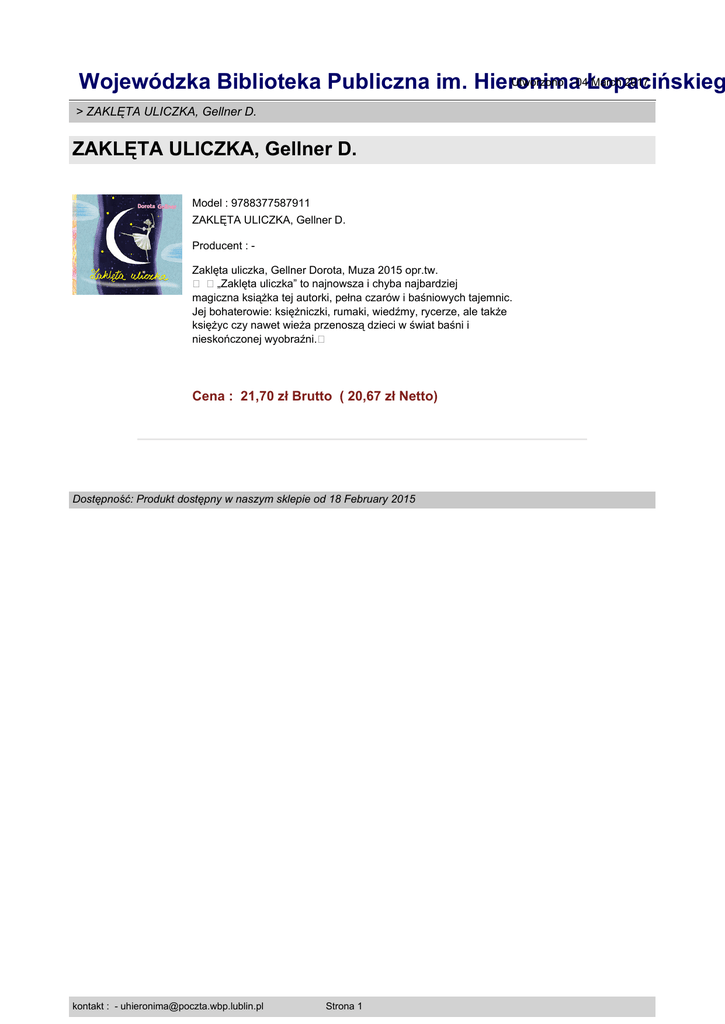 Utworzono : 04Łopacińskieg March 2017 Wojewódzka Biblioteka Publiczna im. Hieronima > ZAKLĘTA ULICZKA, Gellner D. ZAKLĘTA ULICZKA, Gellner D. Model : 9788377587911 ZAKLĘTA ULICZKA, Gellner D. Producent : Zaklęta uliczka, Gellner Dorota, Muza 2015 opr.tw. � �„Zaklęta uliczka” to najnowsza i chyba najbardziej magiczna książka tej autorki, pełna czarów i baśniowych tajemnic. Jej bohaterowie: księżniczki, rumaki, wiedźmy, rycerze, ale także księżyc czy nawet wieża przenoszą dzieci w świat baśni i nieskończonej wyobraźni.� Cena : 21,70 zł Brutto ( 20,67 zł Netto) Dostępność: Produkt dostępny w naszym sklepie od 18 February 2015 kontakt : - [email protected] Strona 1