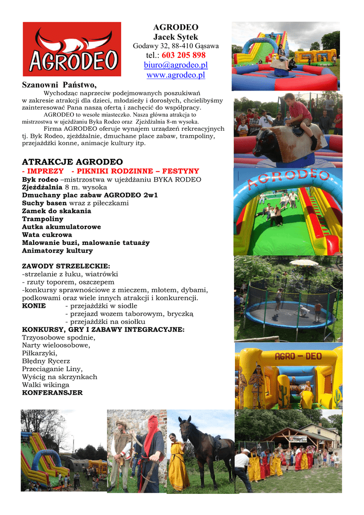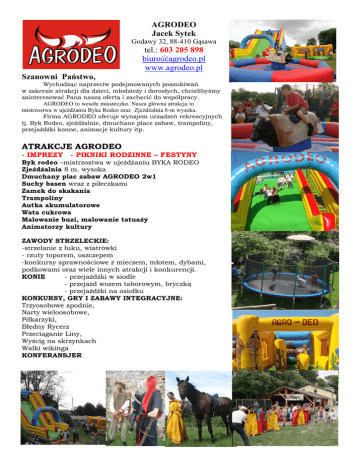 AGRODEO Jacek Sytek Godawy 32, 88-410 Gąsawa tel.: 603 205 898 [email protected] www.agrodeo.pl Szanowni Państwo, Wychodząc naprzeciw podejmowanych poszukiwań w zakresie atrakcji dla dzieci, młodzieży i dorosłych, chcielibyśmy zainteresować Pana naszą ofertą i zachęcić do współpracy. AGRODEO to wesołe miasteczko. Nasza główna atrakcja to mistrzostwa w ujeżdżaniu Byka Rodeo oraz Zjeżdżalnia 8-m wysoka. Firma AGRODEO oferuje wynajem urządzeń rekreacyjnych tj. Byk Rodeo, zjeżdżalnie, dmuchane place zabaw, trampoliny, przejażdżki konne, animacje kultury itp. ATRAKCJE AGRODEO - IMPREZY - PIKNIKI RODZINNE – FESTYNY Byk rodeo –mistrzostwa w ujeżdżaniu BYKA RODEO Zjeżdżalnia 8 m. wysoka Dmuchany plac zabaw AGRODEO 2w1 Suchy basen wraz z piłeczkami Zamek do skakania Trampoliny Autka akumulatorowe Wata cukrowa Malowanie buzi, malowanie tatuaży Animatorzy kultury ZAWODY STRZELECKIE: -strzelanie z łuku, wiatrówki - rzuty toporem, oszczepem -konkursy sprawnościowe z mieczem, młotem, dybami, podkowami oraz wiele innych atrakcji i konkurencji. KONIE - przejażdżki w siodle - przejazd wozem taborowym, bryczką - przejażdżki na osiołku KONKURSY, GRY I ZABAWY INTEGRACYJNE: Trzyosobowe spodnie, Narty wieloosobowe, Piłkarzyki, Błędny Rycerz Przeciąganie Liny, Wyścig na skrzynkach Walki wikinga KONFERANSJER AGRODEO Jacek Sytek Godawy 32, 88-410 Gąsawa tel.: 603 205 898 [email protected] www.agrodeo.pl CENNIK 2012 uczestniczymy w imprezach za odpłatny wynajem. Uczestnicy imprezy korzystają z naszych usług bezpłatnie, a koszty wynajmu pokrywa sponsor lub organizator. uczestniczymy w organizowanych przez Państwa imprezach, wystawiamy nasze urządzenia, za korzystanie z których pobieramy opłaty od uczestników, a w zamian ponosimy opłaty tzw. PLACOWE, wszystkie ceny podlegają negocjacji w zależności od możliwości czasowy, finansowych i ilości atrakcji. Ceny podane są BRUTTO Zestaw ATRAKCJI MINI…………………………..……………………..……………..1 500 zł 1. 2. 3. 4. Activite center -plac zabaw wraz z suchym basenem, Trampolina Konkursy - trzyosobowe spodnie, narty wieloosobowe, szczudła dla dzieci, malowanie tatuaży, Strzelanie z łuku Zestaw ATRAKCJI STANDARD…………………..………………………..………… 3 500 zł 1. 2. 3. 4. 5. 6. Byk rodeo Zjeżdżalnia Trampolina Plac zabaw z suchym basenem 2w1 Konkursy - trzyosobowe spodnie, narty wieloosobowe, szczudła dla dzieci, Animatorzy -malowanie tatuaży, malowanie buziek Zestaw ATRAKCJI EXTRA…………………………..………………….…………..…5 500 zł 1. 2. 3. 4. 5. Byk rodeo Zjeżdżalnia Trampolina Plac zabaw z suchym basenem 2w1 Konkursy, gry i zabawy - trzyosobowe spodnie, narty wieloosobowe, szczudła dla dzieci, malowanie tatuaży, chusta animacyjna, 6. Przejażdżki na koniu, osiołku 7. Rzut toporem i spotkanie z ,,Katem” 8. Strzelanie z łuku - 2 stanowiska, 9. Wata cukrowa bez limitu porcji 10. Konferansjer WYNAJEM ATRAKCJI ATRAKCJE 1h BYK RODEO 250 zł Zjeżdżalnia 200 zł Dmuchany Plac Zabaw 150 zł Trampolina Turniej łuczniczy 2 stanowiska Trzyosobowe spodnie Animacje kultury 2 os. (chusta, malowanie twarzy, tatuaży) Rzut toporem i ,,spotkanie z Katem” Przejażdżki na osiołku Konferansjer 100 zł 8h 1 500 1 200 900 300 400 200 450 300 500 zł zł zł zł zł zł zł zł zł Podane ceny zawierają: Wynajem sprzętu, pełną obsługę Ubezpieczenie Transport do 150km Imprezy możemy poprowadzić w dowolnym wybranym przez Pana miejscu lub na terenie naszego Gospodarstwa Agroturystycznego AGRODEO. Gwarantujemy dobrą zabawę dla dzieci i pełną emocji rywalizację dla młodzieży i dorosłych. Zapraszamy do współpracy.