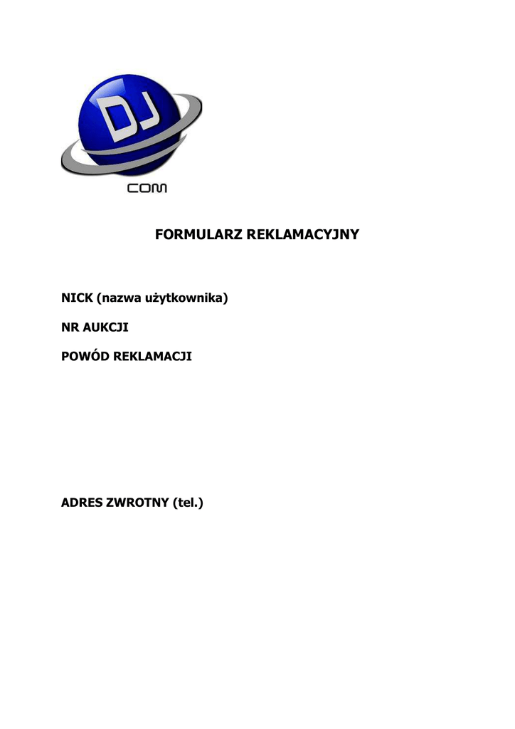 FORMULARZ REKLAMACYJNY NICK (nazwa użytkownika) NR AUKCJI POWÓD REKLAMACJI ADRES ZWROTNY (tel.)