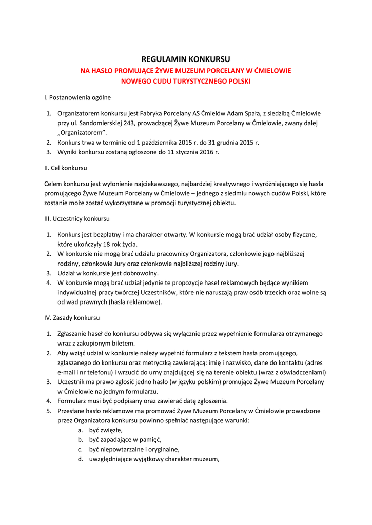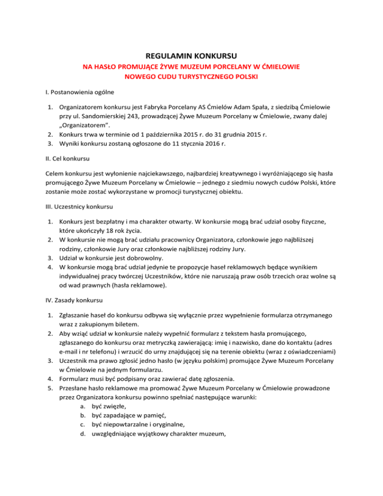 REGULAMIN KONKURSU NA HASŁO PROMUJĄCE ŻYWE MUZEUM PORCELANY W ĆMIELOWIE NOWEGO CUDU TURYSTYCZNEGO POLSKI I. Postanowienia ogólne 1. Organizatorem konkursu jest Fabryka Porcelany AS Ćmielów Adam Spała, z siedzibą Ćmielowie przy ul. Sandomierskiej 243, prowadzącej Żywe Muzeum Porcelany w Ćmielowie, zwany dalej „Organizatorem”. 2. Konkurs trwa w terminie od 1 października 2015 r. do 31 grudnia 2015 r. 3. Wyniki konkursu zostaną ogłoszone do 11 stycznia 2016 r. II. Cel konkursu Celem konkursu jest wyłonienie najciekawszego, najbardziej kreatywnego i wyróżniającego się hasła promującego Żywe Muzeum Porcelany w Ćmielowie – jednego z siedmiu nowych cudów Polski, które zostanie może zostać wykorzystane w promocji turystycznej obiektu. III. Uczestnicy konkursu 1. Konkurs jest bezpłatny i ma charakter otwarty. W konkursie mogą brać udział osoby fizyczne, które ukończyły 18 rok życia. 2. W konkursie nie mogą brać udziału pracownicy Organizatora, członkowie jego najbliższej rodziny, członkowie Jury oraz członkowie najbliższej rodziny Jury. 3. Udział w konkursie jest dobrowolny. 4. W konkursie mogą brać udział jedynie te propozycje haseł reklamowych będące wynikiem indywidualnej pracy twórczej Uczestników, które nie naruszają praw osób trzecich oraz wolne są od wad prawnych (hasła reklamowe). IV. Zasady konkursu 1. Zgłaszanie haseł do konkursu odbywa się wyłącznie przez wypełnienie formularza otrzymanego wraz z zakupionym biletem. 2. Aby wziąć udział w konkursie należy wypełnić formularz z tekstem hasła promującego, zgłaszanego do konkursu oraz metryczką zawierającą: imię i nazwisko, dane do kontaktu (adres e-mail i nr telefonu) i wrzucić do urny znajdującej się na terenie obiektu (wraz z oświadczeniami) 3. Uczestnik ma prawo zgłosić jedno hasło (w języku polskim) promujące Żywe Muzeum Porcelany w Ćmielowie na jednym formularzu. 4. Formularz musi być podpisany oraz zawierać datę zgłoszenia. 5. Przesłane hasło reklamowe ma promować Żywe Muzeum Porcelany w Ćmielowie prowadzone przez Organizatora konkursu powinno spełniać następujące warunki: a. być zwięzłe, b. być zapadające w pamięć, c. być niepowtarzalne i oryginalne, d. uwzględniające wyjątkowy charakter muzeum, e. nawiązujące m.in. do takich skojarzeń jak: unikatowość, wyjątkowość, nowoczesność, ponadczasowość, oryginalność, design, sztuka. 6. Uczestnik konkursu, któremu zostanie przyznana nagroda , zobowiązany jest do przesłania drogą mailową na adres [email protected] wiadomości ze swoimi danymi adresowymi (na które zostanie wysłana nagroda) w tytule wiadomości wpisując „Konkurs hasło promujące Żywe Muzeum Porcelany”, w ciągu 7 dni od ogłoszenia wyników konkursu. Niedopełnienie powyższych formalności przez zwycięzcę konkursu i uczestnika, któremu zostanie przyznana nagroda skutkuje utratą przez niego prawa do otrzymania nagrody oraz upoważnia Organizatora to przekazania nagrody innemu uczestnikowi konkursu. 7. Uczestnictwo w konkursie warunkowane jest złożeniem oświadczeń o treści zamieszczonej w formularzu zgłoszeniowym. 8. Organizator konkursu ma prawo wyłączyć z udziału w konkursie teksty, które nie spełniają warunków Regulaminu lub naruszają przepisy prawa. V. Prawa autorskie 1. Uczestnik konkursu oświadcza że: a. przysługują mu autorskie prawa osobiste i nieograniczone prawa majątkowe do tekstu zgłaszanego w konkursie, b. przyjmuje na siebie odpowiedzialność za wszelkie roszczenia osób trzecich związane z naruszeniem ich praw autorskich. 2. Uczestnik konkursu udziela Organizatorowi nieodpłatnej licencji niewyłącznej, uprawniającej Organizatora do korzystania przez czas nieoznaczony, oraz bez ograniczeń terytorialnych z przesłanych tekstów na wszystkich polach eksploatacji do działań promujących konkurs. 3. Uczestnik udziela Organizatorowi zgody na publikację tekstów na stronach internetowych, portalach społecznościowych oraz materiałach drukowanych Organizatora w ramach działań promujących konkurs. 4. Zwycięzca konkursu przenosi na Organizatora konkursu majątkowe prawa autorskie do korzystania i rozporządzania zwycięskim hasłem reklamowym na wszystkich polach eksploatacji wskazanych w ustawie z dnia 4 lutego 1994 r. o prawie autorskim i prawach pokrewnych. Organizator będzie uprawniony do dalszego rozporządzania autorskimi prawami majątkowymi. W związku przeniesieniem autorskich praw majątkowych do zwycięskiego hasła reklamowego – zwycięzcy konkursu , poza uprawnieniem do uzyskania nagród określonych w Regulaminie, nie przysługują żadne inne roszczenia do Organizatora oraz do osób trzecich, które te prawa nabyły. 5. Organizator jest uprawniony do korzystania z haseł reklamowych w sposób anonimowy – bez konieczności każdorazowego podawania danych zwycięzcy konkursu. Na warunki te uczestnik wyraża zgodę poprzez przystąpienie do Konkursu. VI. Rozstrzygnięcie konkursu i nagrody 1. Jury konkursowe powoływane jest przez organizatora i liczy 4 osoby. 2. W skład Jury wchodzą pracownicy Fabryki Porcelany AS Ćmielów Adam Spała, z siedzibą Ćmielowie przy ul. Sandomierskiej 243, prowadzącej Żywe Muzeum Porcelany w Ćmielowie 3. Nagrody zostaną przyznane autorom tekstów najbardziej kreatywnych, najlepiej oddających charakter działalności Żywego Muzeum Porcelany w Ćmielowie 4. Decyzje Jury są niepodważalne. 5. W konkursie zostaną przyznane następujące nagrody: a. za każde jedno hasło z wybranych 10-ciu najlepszych haseł promujących Żywe Muzeum Porcelany każdy laureat otrzyma porcelanową filiżankę Włodek Pawlik, wraz z certyfikatem potwierdzającym autentyczność. Produkt zostanie zapakowany w eleganckie pudełko prezentowe. VII Ogłoszenie wyników konkursu i wydanie nagród 1. Wyniki konkursu zostaną opublikowane na stronie internetowej Organizatora w ciągu 11 dni od daty zakończenia k
