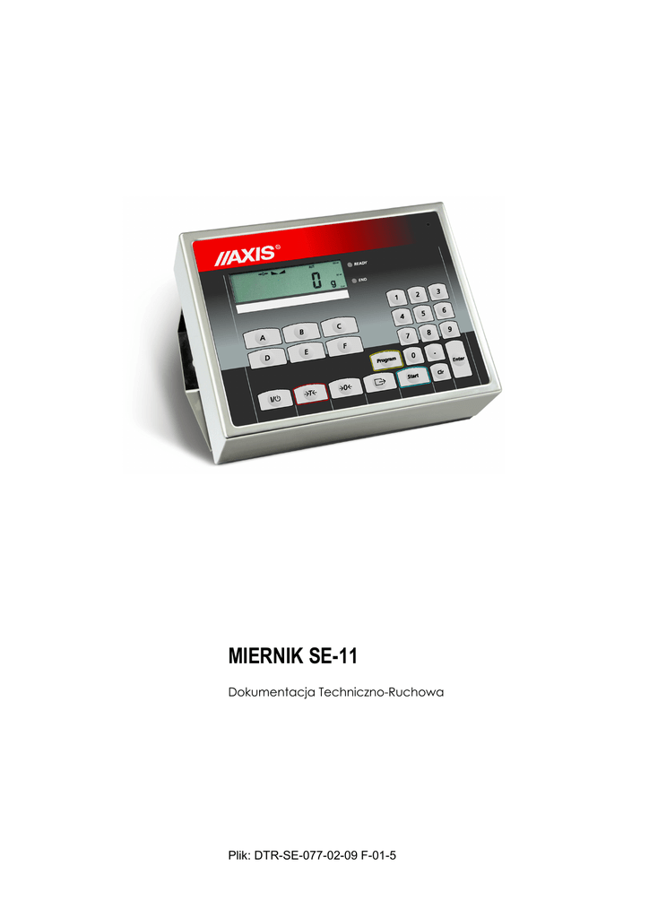 MIERNIK SE-11 Dokumentacja Techniczno-Ruchowa Plik: DTR-SE-077-02-09 F-01-5 Instrukcja Obsługi ___________________________________________________________________________________________________ Spis treści: 1. Wstęp...................................................................................................................................... 3 2. Certyfikaty ............................................................................................................................... 3 3. Kompletacja ............................................................................................................................ 3 4. Klawisze i wskaźniki wagi....................................................................................................... 4 5. Dane techniczne...................................................................................................................... 5 6. Przygotowanie wagi do pracy.................................................................................................. 6 6.Ogólne zasady eksploatacji.................................................................................................... 12 7. Współpraca z komputerem lub drukarką (opcja).................................................................... 12 8.Połączenie modułu z zewnętrz. układami automatyki (opcja) ................................................. 13 9.Funkcje specjalne................................................................................................................... 14 9.1 Funkcja automatycznego podtrzymywania zerowych wskazań (F..-AUt)............................. 14 9.2 Funkcja liczenia sztuk (F..-LIC) ........................................................................................... 14 9.3 Funkcja ustawiania trybu pracy złącza szeregowego (F..-LPt) ............................................ 15 9.4 Funkcja porównania z wartościami progowym (F..-tHr) - opcja ........................................... 16 9.5 Funkcja total (F..-tot) - opcja................................................................................................ 17 9.6 Funkcja wpisywania „stałej” tary (F..-tAr)............................................................................. 19 9.7 Wprowadzenie bieŜącej daty i godziny (F..-dAt).................................................................. 19 9.8 Sporządzanie receptur (F..-SU ≡)- opcja............................................................................. 20 10.Konserwacja i usuwanie drobnych uszkodzeń ..................................................................... 21 Deklaracja zgodności ................................................................................................................ 22 2 Instrukcja Obsługi ___________________________________________________________________________________________________ 1. Wstęp Miernik SE-11 jest gotowym podzespołem przeznaczonym do budowy wag wykorzystujących tensometryczne czujniki siły. Miernik realizuje podstawowe funkcje wagowe oraz funkcje specjalne, do których uŜywane są klawisze cyfrowe. Miernik SE-11 moŜe stanowić element wag platformowych serii B lub 4B, produkowanych przez AXIS. Miernik posiada certyfikat badań nr PL CB 1 wydany został przez Główny Urząd Miar. Miernik posiada hermetyczną obudowę z blachy nierdzewnej, kwasoodpornej i wyświetlacz LCD, wysokość cyfr 14mm. 2. Certyfikaty Mierniki posiadają certyfikat badań nr PL CB 1 wydany przez Główny Urząd Miar w Warszawie (Jednostka Notyfikowana Nr 1440). Mierniki SE-11 posiadają stopień ochronny IP65 potwierdzony badaniem wykonanym w Laboratorium Badawczym Oddziału Instytutu Elektrotechniki w Gdańsku, akredytowanym przez PCA. Miernik moŜe słuŜyć do budowy wag zgodnych z normą PN-EN 45501 Zagadnienia metrologiczne wag nieautomatycznych, wyd. grudzień 1999 zharmonizowaną z Dyrektywą Rady 90/384/EWG zmienioną przez Dyrektywę Rady 93/68/EWG Klasyfikacja wagi wg PKWiU: 29.24.23. 3. Kompletacja Podstawowy komplet stanowi: 1. Miernik SE-11 2. Dokumentacja techniczno-ruchowa miernika SE-11 3. Gwarancja 4. Złączka RS232C 5. Instrukcja montaŜu (na Ŝyczenie) 3 Instrukcja Obsługi ___________________________________________________________________________________________________ 4. Klawisze i wskaźniki wagi klawisz klawisz I/ →T← klawisz klawisz klawisz klawisz klawisz klawisz klawisz →0← Program 0,1, 2, ..,9, . A, B, ... , F Enter Clr - klawisz Start - wskaźnik wskaźnik wskaźnik →0← - wskaźnik wyzerowania - sygnalizuje ustabilizowanie się wyniku waŜenia. - wskaźnik uŜycia klawisza tarowania wskaźnik READY wskaźnik wskaźnik wskaźnik END MODE słupkowy NET - włącznik / wyłącznik (standby), - tarowanie (wpisywanie masy opakowania odejmowanej od masy waŜonej), - zerowanie wagi (przy pustej platformie), - wydruk wyniku, programowanie (wywołanie programu) klawisze cyfrowe klawisze wykonawczych urządzeń dozujących potwierdzenie (wprowadzenie danej) cofnięcie ostatniej operacji programowania /natychmiastowe zatrzymanie dozowania rozpoczęcie dozowania - sygnalizator gotowości do waŜenia, dozowania lub programowania - sygnalizator końca dozowania - wskaźnik włączenia funkcji specjalnej - wskaźnik obciąŜenia wagi (0-100%) 4 Instrukcja Obsługi ___________________________________________________________________________________________________ 5. Dane techniczne Parametr Wartość Stopień ochronny Max ilość działek legalizacyjnych Klasa dokładności Max ilość podłączonych czujników Zakresy napięcia wejściowego IP65 3000e III 6szt. 10mV (2mV/V) 20mV (4mV/V) 40mV (8mV/V) 80mV (16mV/V) 5V AC 25Hz 1, 2, 5, 10, 20 (g. dkg, kg) dowolna -10÷40oC pełny 230V, 50Hz, 6VA 2 otwory Ф5, rozstaw 203mm 2,3kg Zasilanie czujników Działka odczytowa (d) Działka legalizacyjna (e) Temperatura pracy Zakres tarowania Zasilanie Mocowanie Masa Parametry metrologiczne wagi są um
