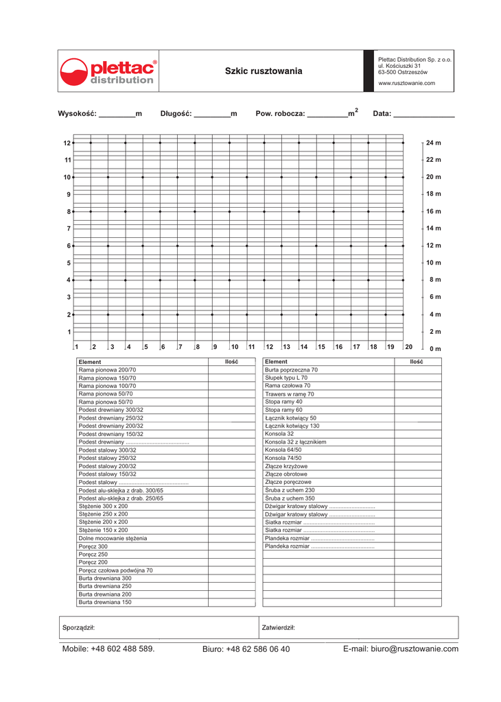 Plettac Distribution Sp. z o.o. ul. Koœciuszki 31 63-500 Ostrzeszów R distribution Wysokoœæ: _________m www.rusztowanie.com D³ugoœæ: _________m Pow. robocza: __________m 2 Data: _______________ 12 24 m 11 22 m 10 20 m 9 18 m 8 16 m 7 14 m 6 12 m 5 10 m 4 8m 3 6m 2 4m 1 2m 1 2 3 4 5 6 7 Element Rama pionowa 200/70 Rama pionowa 150/70 Rama pionowa 100/70 Rama pionowa 50/70 Rama pionowa 50/70 Podest drewniany 300/32 Podest drewniany 250/32 Podest drewniany 200/32 Podest drewniany 150/32 Podest drewniany ........................................ Podest stalowy 300/32 Podest stalowy 250/32 Podest stalowy 200/32 Podest stalowy 150/32 Podest stalowy ............................................ Podest alu-sklejka z drab. 300/65 Podest alu-sklejka z drab. 250/65 Stê¿enie 300 x 200 Stê¿enie 250 x 200 Stê¿enie 200 x 200 Stê¿enie 150 x 200 Dolne mocowanie stê¿enia Porêcz 300 Porêcz 250 Porêcz 200 Porêcz czo³owa podwójna 70 Burta drewniana 300 Burta drewniana 250 Burta drewniana 200 Burta drewniana 150 Mobile: +48 602 488 589. 8 9 10 Iloœæ 11 12 13 14 15 16 17 18 Element Burta poprzeczna 70 S³upek typu L 70 Rama czo³owa 70 Trawers w ramê 70 Stopa ramy 40 Stopa ramy 60 £¹cznik kotwi¹cy 50 £¹cznik kotwi¹cy 130 Konsola 32 Konsola 32 z ³¹cznikiem Konsola 64/50 Konsola 74/50 Z³¹cze krzy¿owe Z³¹cze obrotowe Z³¹cze porêczowe Œruba z uchem 230 Œruba z uchem 350 DŸwigar kratowy stalowy ............................. DŸwigar kratowy stalowy ............................. Siatka rozmiar ............................................. Siatka rozmiar ............................................. Plandeka rozmiar ........................................ Plandeka rozmiar ........................................ Biuro: +48 62 586 06 40 19 20 0m Iloœæ E-mail: [email protected]