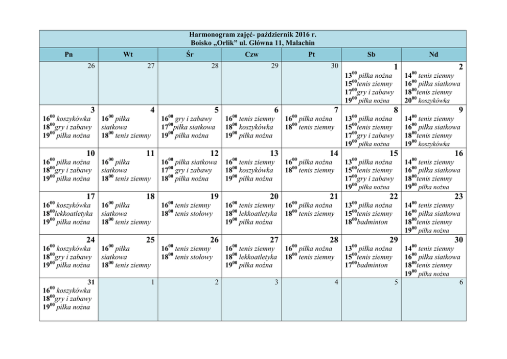Harmonogram zajęć- październik 2016 r. Boisko „Orlik” ul. Główna 11, Malachin Pn Śr Wt 26 27 Czw 28 Pt 29 Sb Nd 30 1 00 13 piłka nożna 1500tenis ziemny 1700gry i zabawy 1900 piłka nożna 00 3 16 koszykówka 1800gry i zabawy 1900 piłka nożna 00 10 16 piłka nożna 1800gry i zabawy 1900 piłka nożna 00 17 16 koszykówka 1800lekkoatletyka 1900 piłka nożna 00 24 16 koszykówka 1800gry i zabawy 1900 piłka nożna 31 1600 koszykówka 1800gry i zabawy 1900 piłka nożna 00 4 16 piłka siatkowa 1800 tenis ziemny 00 16 gry i zabawy 1700piłka siatkowa 1900 piłka nożna 11 16 piłka siatkowa 1800 tenis ziemny 00 00 12 16 piłka siatkowa 1700 gry i zabawy 1800 piłka nożna 18 16 piłka siatkowa 1800 tenis ziemny 00 5 00 00 19 16 tenis ziemny 1800 tenis stołowy 25 16 piłka siatkowa 1800 tenis ziemny 00 6 00 13 26 00 20 27 16 tenis ziemny 1800 lekkoatletyka 1900 piłka nożna 2 7 00 3 00 14 00 21 00 15 16 piłka nożna 1800 tenis ziemny 00 22 4 00 16 00 23 14 tenis ziemny 1600 piłka siatkowa 1800tenis ziemny 1900 piłka nożna 29 13 piłka nożna 1500tenis ziemny 1700badminton 9 14 tenis ziemny 1600 piłka siatkowa 1800tenis ziemny 1900 piłka nożna 13 piłka nożna 1500tenis ziemny 1800badminton 28 00 14 tenis ziemny 1600 piłka siatkowa 1800tenis ziemny 1900 koszykówka 13 piłka nożna 1500tenis ziemny 1700gry i zabawy 1900 piłka nożna 16 piłka nożna 1800 tenis ziemny 00 8 00 2 14 tenis ziemny 1600 piłka siatkowa 1800tenis ziemny 2000 koszykówka 13 piłka nożna 1500tenis ziemny 1700gry i zabawy 1900 piłka nożna 16 piłka nożna 1800 tenis ziemny 16 tenis ziemny 1800 koszykówka 1900 piłka nożna 00 00 16 piłka nożna 1800 tenis ziemny 16 tenis ziemny 1800 koszykówka 1900 piłka nożna 16 tenis ziemny 1800 lekkoatletyka 1900 piłka nożna 16 tenis ziemny 1800 tenis stołowy 1 00 00 00 30 14 tenis ziemny 1600 piłka siatkowa 1800tenis ziemny 1900 piłka nożna 5 6