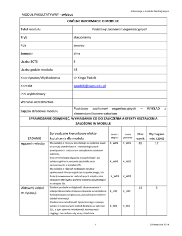 Informacja o module fakultatywnym MODUŁ FAKULTATYWNY - sylabus OGÓLNE INFORMACJE O MODULE Tytuł modułu Podstawy zachowań organizacyjnych Tryb stacjonarny Rok dowolny Semestr zima Liczba ECTS 6 Liczba godzin modułu 45 Koordynator/Wykładowca dr Kinga Padzik Kontakt [email protected] Inni wykładowcy - Warunki uczestnictwa - Zajęcia składowe modułu Podstawy zachowań organizacyjnych elementami konwersatorium – WYKŁAD z SPRAWDZANIE OSIĄGNIĘĆ, WYMAGANIA CO DO ZALICZENIA A EFEKTY KSZTAŁCENIA ZAŁOŻONE W MODULE ZADANIE egzamin wiedzy Aktywny udział w dyskusji Sprawdzane kierunkowe efekty kształcenia dla modułu Ma wiedzę o miejscu psychologii w systemie nauk oraz o jej przedmiotach i metodologicznych powiązaniach z obszarem zarządzania zasobami ludzkimi. Zna terminologię używaną w psychologii i jej subdyscyplinach, rozumie jej źródła oraz zastosowanie w obrębie ZZL. Ma wiedzę o różnych rodzajach struktur społecznych i instytucjach życia społecznego, ich funkcjonowaniu oraz zachodzących między nimi relacjach istotnych z punktu widzenia psychologii i w obrębie ZZL. Student posiada umiejętność obserwowania i interpretowania/oceniania człowieka w kontekście funkcjonowania organizacji, poszukiwania różnych źródeł informacji Student ma świadomość dynamicznego rozwoju wiedzy i stosowanych metod działania w zakresie ZZL, a tym samym świadomość konieczności ciągłego doszkalania się w tej dziedzinie 1 Studia I stopnia Studia jednolite K_W01 K_W01 K_W02 K_W02 K_W09 Max wynik 85 Wymagane min. (20%) 17 15 3 K_W09 K_U03 K_U03 K_K01 K_K01 25 września 2014 Informacja o module fakultatywnym UWAGA: Suma wymaganych minimum nie jest wystarczająca do zaliczenia modułu. Aby zaliczyć kurs należy uzyskać co najmniej 60 punktów. POWIĄZANIE PUNKTÓW Z OCENĄ MODUŁU Liczba punktów Ocena 0-59 2 (niedostateczny) 60 - 67 3 68 - 75 3,5 (dostateczny plus) 76 - 83 4 84 - 91 4, 5 (dobry plus) 92 - 100 5 (dostateczny) (dobry) (bardzo dobry) SZCZEGÓŁOWA TEMATYKA ZAJĘĆ SKŁADOWYCH I WYMAGANA LITERATURA TEMAT 1: Wprowadzenie / osobowość a. Wprowadzenie. Czym są zachowania organizacyjne? O czym traktuje ta dziedzina? b. Czym jest organizacja? c. Kim jest człowiek w organizacji? d. Dylemat wpisany w organizację e. Czym jest osobowość jednostki? f. Teorie cech (omówione są: czynnikowa teoria osobowości R.B. Cattella, teoria PEN – koncepcja trzech superczynników H.J. Eysencka oraz PMO – pięcioczynnikowy model osobowości P.T. Costy i R.McCrae’a); teorie poznawcze i podejścia psychodynamiczne (w ramach ostatniego omawiane jest podejście C. Jounga). g. Dlaczego osobowość jest kluczowym pojęciem przy opisie człowieka w ogóle, a szczególnie w kontekście organizacji? TEMAT 2: Procesy poznawcze a. Co to są procesy poznawcze, czym jest przetwarzanie informacji i system poznawczy? b. Jak powstaje i jak jest zorganizowana wiedza o świecie? c. Jak spostrzegamy, oceniamy i uczymy się świata, w tym relacji z innymi ludźmi? d. Czy jesteśmy w tym nieomylni czy może popełniamy błędy? e. Jakie to ma znaczenie dla naszego zachowania, dla oceny przez innych i dla funkcjonowania w środowisku organizacji? f. Czym jest proces komunikacji – teoria komunikacji A. Mechrabiana (trzy podstawowe kanały komunikacji: werbalny, niewerbalny i parawerbalny) oraz teoria spostrzegania społecznego E. Aronsona. g. Na czym polega rozumowanie i jakie zasady je opisują. h. Trzy zjawiska ukazujące procesy myślowe – wnioskowanie dedukcyjne, indukcyjne oraz rozwiązywanie problemów. i. Błędy w rozumowaniu i wnioskowaniu. j. Czym jest proces podejmowania decyzji? Jak przebiega i jakie zjawiska mu towarzyszą? 2 25 września 2014 Informacja o module fakultatywnym k. Czym jest intuicja? Czy można być w pełni racjonalnym? l. Jak radzenie sobie z decyzjami i problemami wpływa na Podstawy zachowań organizacyjnych – WYKŁAD z elementami konwersatorium efektywność zawodową i funkcjonowanie jednostki w organizacji? m. Dysonans poznawczy i dysonans podecyzyjny. TEMAT 3: Motywacja i satysfakcja z pracy a. Czym jest motywacja, jakie są jej rodzaje, skąd się bierze i jaką pełni funkcję? b. Proces motywowania jako główne zadanie menedżera i podstawa efektywnego zarządzania ludźmi. c. Podstawowe teorie motywacji odnoszące się do środowiska organizacji / kontekstu pracy zawodowej – teorie treści (teoria potrzeb A. Maslowa; teoria ERG C.P. Alderfera, dwuczynnikowa teoria F.W. Herzberga oraz teoria potrzeb D.C. McClellanda( oraz teorie procesu (teorie oczekiwań: m.in. teoriaV.H. Vrooma oraz L.W.Portera i E.E. Lawlera; teoria równości J.S. Adamsa oraz teoria celu E.A. Locke’a). d. Dopasowanie do pracy i satysfakcja z pracy jako efekty poprawnego procesu motywowania. e. Pojęcie kompetencji – co kryje się pod pojęciem kompetencji? Co oznacza termin zarządzanie kompetencjami i do czego ten proces służy? f. Preferencje zawodowe i dopasowanie pracownika do stanowiska pracy jako kluczowe aspekty odpowiadające za efektywne funkcjonowanie jednostki w organizacji. g. Satysfakcja z pracy – czym jest to zjawisko i czym jest warunkowane? Jakie są konsekwencje braku tej satysfakcji. TEMAT 5: Struktura organizacyjna i projektowanie stanowisk pracy a. Proces projektowania struktury organizacyjnej. b. Rodzaje struktur organizacyjnych i ich właściwości (m.in. org. hierarchiczna / funkcjonalna; org. projektowa / macierzowa oraz organizacja wirtualna). c. Projektowanie stanowisk pracy – sposoby, narzędzia i wymagane warunki w organizacji. d. Prezentacja przykładowych opisów stanowisk pochodzących z różnych organizacji. e. Opis stanowiska pracy jako dokument porządkujący, jak i podstawa pełnej komunikacji z pracownikiem i zapewnienie mu kontroli nad swoim funkcjonowaniem i miejscem w organizacji TEMAT 6: Kultura organizacyjna i komunikacja w organizacji a. Związki kultury narodowej z kulturą organizacyjną. b. Dwa różne podejścia d