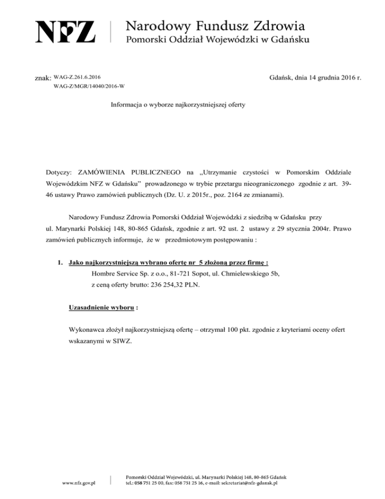 Gdańsk, dnia 14 grudnia 2016 r. znak: WAG-Z.261.6.2016 WAG-Z/MGR/14040/2016-W Informacja o wyborze najkorzystniejszej oferty Dotyczy: ZAMÓWIENIA PUBLICZNEGO na „Utrzymanie czystości w Pomorskim Oddziale Wojewódzkim NFZ w Gdańsku” prowadzonego w trybie przetargu nieograniczonego zgodnie z art. 3946 ustawy Prawo zamówień publicznych (Dz. U. z 2015r., poz. 2164 ze zmianami). Narodowy Fundusz Zdrowia Pomorski Oddział Wojewódzki z siedzibą w Gdańsku przy ul. Marynarki Polskiej 148, 80-865 Gdańsk, zgodnie z art. 92 ust. 2 ustawy z 29 stycznia 2004r. Prawo zamówień publicznych informuje, że w przedmiotowym postępowaniu : 1. Jako najkorzystniejszą wybrano ofertę nr 5 złożoną przez firmę : Hombre Service Sp. z o.o., 81-721 Sopot, ul. Chmielewskiego 5b, z ceną oferty brutto: 236 254,32 PLN. Uzasadnienie wyboru : Wykonawca złożył najkorzystniejszą ofertę – otrzymał 100 pkt. zgodnie z kryteriami oceny ofert wskazanymi w SIWZ. 2. W postępowaniu, złożyli oferty następujący Wykonawcy Punktacja Punktacja Punktacja - Cena oferty Zaoferow- Liczba brutto osób ana kara zatrudnionych umowna na podst. umowy o pracę Nr oferty/nazwa oferenta posiadających lekki Łączna punktacja stopniu niepełnosprawn ości Oferta nr 1 PHU CYMES Kamil Kokoszka, 82-300 Elbląg, ul. Oboźna 19H Oferta - - - Oferta nr 2 Konsorcjum firm: CLAR SYSTEM S.A., 60-542 Poznań, ul. Janickiego 20 B CLAR SERWIS Sp. z o.o., 60-542 Poznań, ul. Janickiego 20B SOLCOM-BAYARD Sp. z o.o., 60-542 Poznań, ul. Janickiego 20B 58,75 0 pkt 20 Oferta nr 3 „Jantar 2” Sp. z o.o., 76-200 Słupsk, ul. Zygmunta Augusta 71 50,11 20 pkt 20 90,11 Oferta nr 4 INWEMER Serwis Sp. z o.o (dawniej INWEMER System sp. z o.o. i sp.k.). 90562 Łódź, ul. Łąkowa 3/5 57,62 20 pkt 20 97,62 Oferta nr 5 Hombre Service Sp. z o.o., 81-721 Sopot, ul. Chmielewskiego 5b 60,00 20 pkt 20 100 Oferta nr 6 „LIRECO” Krzysztof Komajda , 81-017 Gdynia, ul. Grochowa 10 52,23 20 pkt 20 odrzucona 78,75 92,23 Z-ca Dyrektora Ds.. Ekonomiczno-Finansowych Monika Kasprzyk