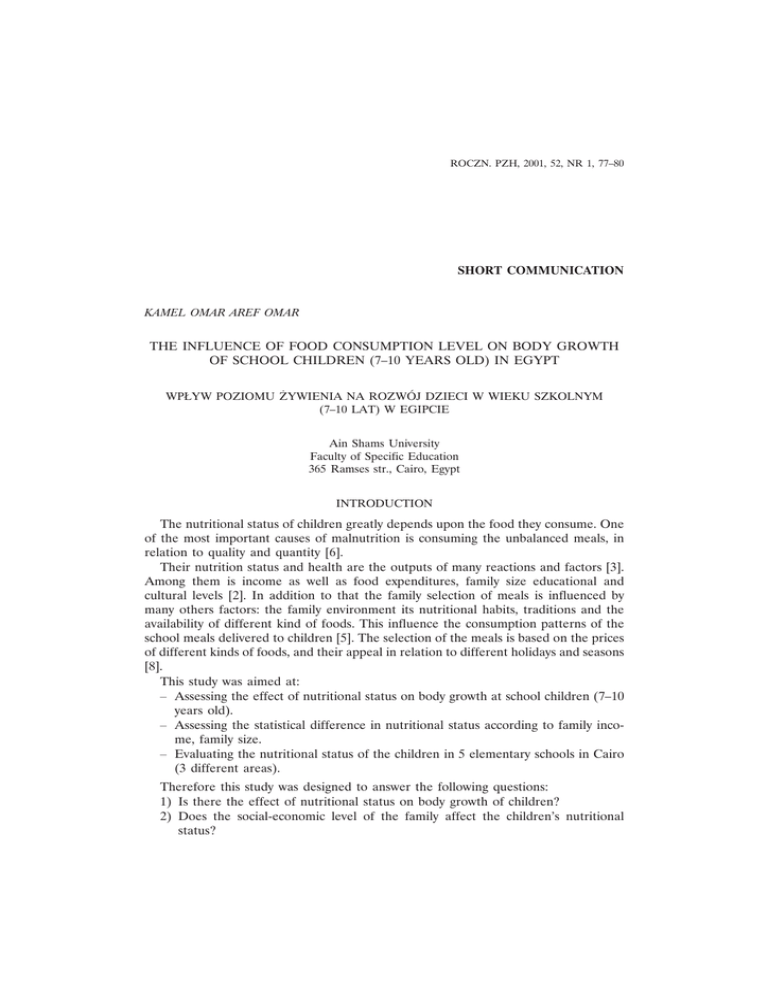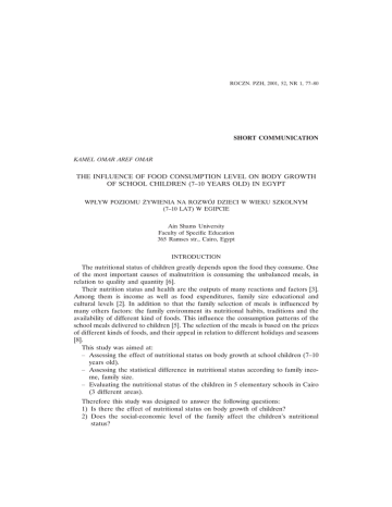 ROCZN. PZH, 2001, 52, NR 1, 77–80 SHORT COMMUNICATION KAMEL OMAR AREF OMAR THE INFLUENCE OF FOOD CONSUMPTION LEVEL ON BODY GROWTH OF SCHOOL CHILDREN (7–10 YEARS OLD) IN EGYPT WPŁYW POZIOMU ŻYWIENIA NA ROZWÓJ DZIECI W WIEKU SZKOLNYM (7–10 LAT) W EGIPCIE Ain Shams University Faculty of Specific Education 365 Ramses str., Cairo, Egypt INTRODUCTION The nutritional status of children greatly depends upon the food they consume. One of the most important causes of malnutrition is consuming the unbalanced meals, in relation to quality and quantity [6]. Their nutrition status and health are the outputs of many reactions and factors [3]. Among them is income as well as food expenditures, family size educational and cultural levels [2]. In addition to that the family selection of meals is influenced by many others factors: the family environment its nutritional habits, traditions and the availability of different kind of foods. This influence the consumption patterns of the school meals delivered to children [5]. The selection of the meals is based on the prices of different kinds of foods, and their appeal in relation to different holidays and seasons [8]. This study was aimed at: – Assessing the effect of nutritional status on body growth at school children (7–10 years old). – Assessing the statistical difference in nutritional status according to family income, family size. – Evaluating the nutritional status of the children in 5 elementary schools in Cairo (3 different areas). Therefore this study was designed to answer the following questions: 1) Is there the effect of nutritional status on body growth of children? 2) Does the social-economic level of the family affect the children’s nutritional status? 78 K. Omar Aref Omar Nr 1 MATERIALS AND METHODS The study was designed to answer the above questions involved several steps. Basing on the previous researches [4] concerning nutrition in Egypt four types of questionnaires (forms) were developed: child anthropometric data, social-economic data, 24 hours recall method and family meal planning. The main study was followed by a pilot feasibility trial where the suitability of questionnaires was tested on a small pilot subsample of children. Moreover, the questionnaires were renewed by the recognised specialists. The main study involved 418 children (209 boys and 209 girls) within the age from (7–10 years old). The previous research sample was chosen among five elementary schools in Cairo government, which they represent variable social-economic levels in three different educational areas as follow: A – Nacre city educational area, B – Elsabtuho educational area and C – Shoubra educational area. The results were statistically analysed and following findings and recommendations are presented as resulting from the study. RESULTS AND DISCUSSION There is no doubt that growth of children is considered a good indicator of their health and nutritional status. Silver [7] indicated that social rapid changes in families forcing women to work showed a negative effect on children care. The needs of children were then neglected at very critical period of their life [6]. Children need small concentrated meals which should be given to them repeating at short intervals. Such meals should contain not only all the nutrients (proteins, fat, carbohydrates, vitamins, and minerals) but also their amounts should be properly balanced. In this study the significant effect of nutritional status on body growth of school children (7–10 years old) was observed. The results are showed in the figure 1. A statistically significant relationship between nutritional status and body growth was observed at significance level of 0.01 at p < 0.01. The results of T-test showed that the difference in body growth of children of good nutritional status was in favour to children whose nutritional status was in favour to children whose nutritional status was worse. There was no relationship between the body growth and breakfast meal at significance level (0.01), but a significant relationship at level 0.05 was observed. Using T-test the intrinsic difference in body growth between children who had breakfasts and those deprived these meals was shown in favour of the first case. The results of the T-test showed that there is statistically significant relationship between the children nutritional status and social economic level at significance level (0.01) (at p < 0.01) and between the children with good nutritional status children and those with bad ones. It could be found that there is a difference between the cases in favour of the children with higher social-economic level. Nr 1 Ryc. 1 Żywienie dzieci w Egipcie 79 80 K. Omar Aref Omar Nr 1 K. Omar Aref Omar THE INFLUENCE OF FOOD CONSUMPTION LEVEL ON BODY GROWTH OF SCHOOL CHILDREN (7–10 YEARS OLD) IN EGYPT Summary The nutritional status of children (7–10 years old) depends to great extent on the type of food they eat. The natural growth of children is considered as an indicator of their nutritional status in addition to that children are considered the building blocks of healthy societies. This paper presents the results of questionnaire studies of nutrition of school children in Egypt with the special emphasis given to social-economic status in the families. The results show the effect on nutritional status on body growth of school children (7–10 years old) in Egypt and relationship between difference social-economic level in the families. K. Omar Aref Omar WPŁYW POZIOMU ŻYWIENIA NA ROZWÓJ DZIECI W WIEKU SZKOLNYM (7–10 LAT) W EGIPCIE Streszczenie Poziom stanu odżywienia dzieci w wieku 7–10 lat jest uzależniony w dużym stopniu od rodzaju pożywienia. Naturalny wzrost dzieci stanowiący podstawę zdrowego społeczeństwa, uwzględnia ich status żywieniowy. W pracy przedstawiono wyniki badań ankietowych dotyczących żywienia dzieci w wieku szkolnym w Egipcie, ze szczególnym uwzględnieniem poziom