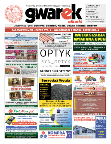 12 MARCA 2015 Nr 05/2015 (214) ISSN: 1896-1797 Redakcja: ul. K. K. Wielkiego 29, 32-300 Olkusz tel. 698 805 242 608 696 097 e-mail: [email protected] www.gwarekolkuski.pl Obszar miast i gmin: Bukowno, Bolesław, Klucze, Olkusz, Trzyciąż, Wolbrom ZAPOWIEDZI MOK – PATRZ STR. 2 • WIADOMOŚCI Z MOSIR - PATRZ STR. 4 SKLEP WODNO-KANALIZACYJNY Łukasz Knapczyk SERWIS KOMPUTERÓW I LAPTOPÓW DOJAZD DO KLIENTA!! www.fhunetcom.pl www.system-olkusz.pl OLKUSZ, ul. Sławkowska 22 KUCHNIE NA WYMIAR SKLEP SZAFY Z DRZWIAMI SUWANYMI WSZYSTKO DO MEBLI czynne 9.00 - 17.00 ul. Główna, 32-329 Bolesław, tel. 728-820-552 Po - Pt 8.00 - 17.00, So 8.00 - 14.00 www.knapczyklukasz.bazarek.pl OPTYK tel./fax 32 641 32 00 • kom. 502 261 586 WSZYSTKO Z DREWNA "U GÓRALA" U NAS NA JTANIEJ!!!! Producent wyrobów z drewna oferuje: • Boazerię świerkową: szer. 7 cm, 9 cm lub 15 cm • Podbitkę pod dachy • Bardzo duży asortyment listew wykończeniowych z lipy, świerka, buka, dębu i jesionu. Deski podłogowe, schody, poręcze, tralki, sztachety, więźby dachowe, meble oraz drzwi. Czynne: pon - piątek 9.00 - 17.15, sobota 9.00-13.00 MOŻLIWOŚĆ DOWOZU WŁASNYM TRANSPORTEM MEBLE POKOJOWE MEBLE OGRODOWE 32-300 Olkusz, ul. Składowa 2, (budynek Dworca PKP) tel. (32) 754 60 10 [email protected], drzwi.olkusz24.pl P.K.S. Olkusz, Al. 1000-lecia 1 tel. 511-410-570 ARTYKUŁY BIUROWE I SZKOLNE MOŻLIWOŚĆ DOSTAWY DO FIRM GABINET OKULISTYCZNY Olkusz, K. K. Wielkiego 102, tel. 503 505 662 [email protected] • www.abisa.pl Czynne pn. - pt. 7:00 do 16:00 rejestracja telefoniczna 500-200-941 ul. K. K. Wielkiego 60 (“SILVER” BUDYNEK DAWNEJ POLICJI PRZY POCZCIE) Sprzedaż Węgla Zapraszamy na piętro OSKAR AUTO MECHANIKA WĘGIEL Największy wybór zabawek w Olkuszu, ponada 2,5 tys. artykułów na 150 m2 Przy zakupach powyżej 100 zł 5% RABATU Olkusz ul. Kr. K. Wielkiego 25 (vis a vis drogerii Rossmann) • orzech I • orzech II • kostka • groszek • ekogroszek • miał Olkusz Restauracja Rodaki, ul. Rzeka czynne: Pn-Pt od 730 - 1600, Sob 800 - 1400 Tel: 514 617 132 , 505 576 275, 728 122 613 Z KUPONEM KONSUMPCJA POTRAW 10% TANIEJ !! tel. 502 815 535 WULKANIZACJA WYMIANA OPON Organizujemy: wesela, komunie, chrzciny oraz ... stypy, wszystkie inne uroczystości rodzinne i okolicznościowe, wesela do 50 osób . Zajmujemy się również obsługą imprez firmowych. U NAS!!! ZJESZ, WYPIJESZ, POTAŃCZYSZ! Zapraszamy! tel. kom: 662 331 815 POLNOX - Dystrybutor Kas i Drukarek Fiskalnych POSNET i NOVITUS • sprzedaż kas fiskalnych • drukarki fiskalne OKRĘGOWA STACJA KONTROLI POJAZDÓW HIT SPRZEDAŻY Kasa Novitus Nano E INSTALACJA URZĄDZEŃ ul. Nullo 2, 32-300 Olkusz (naprzeciwko postoju Taxi) tel/fax: 32 211 03 27, kom. +48 519 409 079 www.polnox.pl • [email protected] • [email protected] pon - pt 9.00 ÷ 18.00, sobota 9.00 ÷ 13.00 WiREX Pn - Pt 700 - 2000 Sob 700 - 1400 ul. Długa 1D 32-300 Olkusz tel. 508 133 255 pełny zakres serwisu zainstalowanych urządzeń Profesjonalny serwis laptopów i komputerów Rynek 27 CLUB 66 KOMPRA BIURO RACHUNKOWE Ponad 21 lat doświadczenia str. 8 JUŻ OTWARTE!!! ZAPRASZAMY Do każdego badania upominek gratis 2 Informacje DZIEŃ KOBIET Dzień Kobiet – święto, które ma tyle samo zwolenników ilu przeciwników. Jedni twierdzą, że to świetna okazja aby okazać miłość, wdzięczność i szacunek kobiecie inni uważają, że to sztuczny twór, który kojarzy się z wręczaniem goździka i pary rajstop w czasach komunistycznych. Dla mnie jest to okazja do refleksji nad istotą kobiecości, rolą kobiety dzisiaj, oraz nad problemem feminizmu – podnoszonego dzisiaj przez kobiety dość głośno. Czym jest kobiecość? Kiedyś odpowiedź na to pytanie była łatwa. Kobiecość oznaczała skromność, łagodność, delikatność, opiekuńczość, gospodarność, bogobojność. Idealna kobieta była posłuszna najpierw ojcu i matce później swemu mężowi. Miała się dobrze prowadzić, dbać o czystość dosłownie i w przenośni. Nie musiała być wykształcona, wręcz przez wiele lat uniemożliwiano jej naukę. Odwaga w wypowiadaniu swoich myśli, bycie niezależną i niepokorną było naganne. Z czasem rewolucja społeczna mająca miejsce w krajach wysoce ucywilizowanych spowodowała wyzwolenie kobiet z więzów narzuconych przez męski świat. Dziś pozycja kobiet w Europie jest nieporównywalna z tą pięćdziesiąt, sto czy dwieście lat temu. W Europie mówi się wręcz o feminizacji społeczeństwa, o kryzysie męskości. Jednocześnie nadal słyszymy o bestialskim traktowaniu kobiet w krajach afrykańskich, niektórych krajach Azji i na Bliskim Wschodzie. Jednocześnie ideał kobiety w wielu krajach bardzo się zmienił od czasów, gdy te zaczęły się kształcić i praco- wać zawodowo. Dzisiaj podziwiamy kobiety nauki, polityki, sztuki. Jednym słowem kobiety sukcesu. Często są to kobiety dobrze wykształcone, obejmujące ważne stanowiska, będące kreatywne i zorganizowane. Prowadzą domy, wychowują dzieci i realizują swoje ambicje zawodowe. Są jednak i minusy tego stanu. Dzisiaj przeciętna, młoda kobieta, która wchodzi w dorosłe życie często nie umie ugotować przysłowiowej zupy, czy zadbać o dom, o opiece nad dzieckiem dowiaduje się z podręczników. Niegdyś dziewczęta podpatrywały swoje siostry i kuzynki. Dziś rodziny nie są już tak liczne a do spotkań bliskich dochodzi przeważnie tylko z okazji świąt, ślubów i pogrzebów. Kobieta, niegdyś strażniczka ogniska domowego współcześnie rolę tą traktuje coraz częściej drugoplanowo. Wyzwolenie seksualne z jednej strony spowodowało, że kobieta nie musi latem chodzić z zakrytymi ramionami, śmiało może ubrać krótkie szorty i nie będą szokować. Może głośno mówić o potrzebach seksualnych i pragnieniu miłości. Lecz i to ma swoje minusy. Cielesność stała się towarem powszechnym. Prawie każda reklama zawiera podteksty seksualne, a nagość, zwłaszcza kobie
