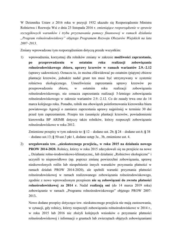 W Dzienniku Ustaw z 2016 roku w pozycji 1932 ukazało się Rozporządzenie Ministra Rolnictwa i Rozwoju Wsi z dnia 23 listopada 2016 r. zmieniające rozporządzenie w sprawie szczegółowych warunków i trybu przyznawania pomocy finansowej w ramach działania „Program rolnośrodowiskowy” objętego Programem Rozwoju Obszarów Wiejskich na lata 2007–2013. Zmiany wprowadzone tym rozporządzeniem dotyczą przede wszystkim: 1) wprowadzenia, korzystnej dla rolników zmiany w zakresie możliwości zaprzestania, po przeprowadzeniu w ostatnim roku realizacji zobowiązania rolnośrodowiskowego zbioru, uprawy krzewów w ramach wariantów 2.9.–2.12 (uprawy sadownicze). Oznacza to, że można zlikwidować po ostatnim (piątym) zbiorze plantacje krzewów, jednakże nadal grunt ten musi być utrzymywany w systemie rolnictwa ekologicznego. Umożliwienie zaprzestania uprawy krzewów po przeprowadzeniu zbioru, w ostatnim roku realizacji zobowiązania rolnośrodowiskowego, nie oznacza zaprzestania realizacji 5-letniego zobowiązania rolnośrodowiskowego w zakresie wariantów 2.9.–2.12. Co do zasady trwa ono do 14 marca kolejnego roku. Ponadto, rolnik ma obowiązek poinformowania kierownika biura powiatowego Agencji o zamiarze zaprzestania uprawy najpóźniej w terminie 30 dni przed tym zaprzestaniem. Przepis ten (usunięcie plantacji krzewów, powiadomienie kierownika BP ARIMR dotyczy także rolników, którzy rozpoczęli zobowiązanie rolnośrodowiskowe w roku 2012. Zmienione przepisy w tym zakresie to: § 12 – dodano ust. 2b; § 24 – dodano ust.6; § 38 – dodano ust.13; § 50-ust.3 pkt 1, dodano ustęp 3a , 3b, zmieniono ust. 4. 2) uregulowania tzw. „nieskutecznego przejścia„ w roku 2015 na działania nowego PROW 2014-2020. Rolnicy, którzy w roku 2015 zdecydowali się na przejście na nowe „ Działanie rolno-środowiskowo-klimatyczne„ lub działanie „Rolnictwo ekologiczne” i uczynili to nieprawidłowo (np. poprzez zmianę powierzchni zobowiązania, uprawę niedozwolonych roślin lub niespełnienie innych warunków przyznania płatności w ramach działań PROW 2014-2020), ale spełnili warunki przyznania płatności rolnośrodowiskowej w ramach realizowanego zobowiązania rolnośrodowiskowego, zgodnie z nowo wprowadzonym przepisem nie są zobowiązani do zwrotu płatności rolnośrodowiskowej za 2014 r. Nadal realizują oni (do 14 marca 2019 roku) zobowiązanie w ramach „Programu rolnośrodowiskowego” objętego PROW 20072013. Nowo dodane przepisy dotyczące tzw. nieskutecznego przejścia nie mają zastosowania, w sytuacji, gdy rolnicy, którzy rozpoczęli zobowiązania rolnośrodowiskowe w 2014 r., w roku 2015 lub 2016 nie złożyli kolejnych wniosków o przyznanie płatności rolnośrodowiskowej i informacji o gruntach lub zwierzętach objętych zobowiązaniami rolnośrodowiskowymi PROW 2007–2013, a także nie złożyli wniosków o przyznanie płatności w ramach Działania rolno-środowiskowo-klimatycznego lub Rolnictwa ekologicznego PROW 2014–2020. W takiej sytuacji uznaje się, że rolnicy ci zaprzestali realizacji zobowiązań rolnośrodowiskowych PROW 2007–2013, a w związku z tym zobligowani są do zwrotu płatności rolnośrodowiskowych. Reguluje to dodany przepis § 57 d. Ponadto § 2 - 4 rozporządzenia zmieniającego z dnia 23 listopada 2016 regulują zakres w jakim zmieniane przepisy będą dotyczyły beneficjentów realizujących zobowiązania rolnośrodowiskowe oraz postępowań, w ramach których będą stosowane zmienione przepisy: • W § 2 określono, że w sprawach objętych postępowaniami wszczętymi i niezakończonymi ostateczną decyzją przed dniem 15 marca 2016 r. oraz zakończonymi ostateczną decyzją wydaną na podstawie przepisów dotychczasowych, w przypadku gdy zostały one wznowione od dnia 15 marca 2016 r.; • w § 3 określono, że w sprawach objętych postępowaniami wszczętymi po dniu 14 marca 2016 r. (tj. w przypadku wniosków złożonych w 2016 r., których termin składania rozpoczął się w dniu 15 marca 2016 r., i w latach następnych o przyznanie kolejnej płatności rolnośrodowiskowej) stosuje się przepisy rozporządzenia rolnośrodowiskowego uwzględniające zmiany wynikające z niniejszego rozporządzenia. Takie rozwiązanie przyjęto ze względu fakt, że zmiany wprowadzone ww. rozporządzeniem zmieniającym są korzystne dla beneficjentów i uzasadnione jest, aby miały one zastosowanie do przyznawania płatności rolnośrodowiskowej za 2016 r. • W § 4 rozporządzenia zmieniającego, określono, że do zwrotu płatności rolnośrodowiskowej w sprawach objętych postępowaniami wszczętymi i niezakończonymi ostateczną decyzją do dnia wejścia w życie ww. rozporządzenia zmieniającego stosuje się przepisy zawarte w rozporządzeniu zmieniającym tj. z dnia 23 listopada 2016 r. Ta regulacja jest korzystna dla rolników, którzy nie zdołali spełnić warunków przejścia w 2015 r. na „Działanie rolno-środowiskowo-klimatyczne” lub działanie „Rolnictwo ekologiczne” PROW 2014-02020. W celu uniknięcia negatywnych skutków (zwrot płatności rolnośrodowiskowej) dla tych rolników zasadne jest, aby nowo dodane regulacje zostały zastosowane do zwrotu płatności rolnośrodowiskowej w toczących się obecnie postępowaniach w sprawie tego zwrotu. Opracowanie :Anna Litwinow