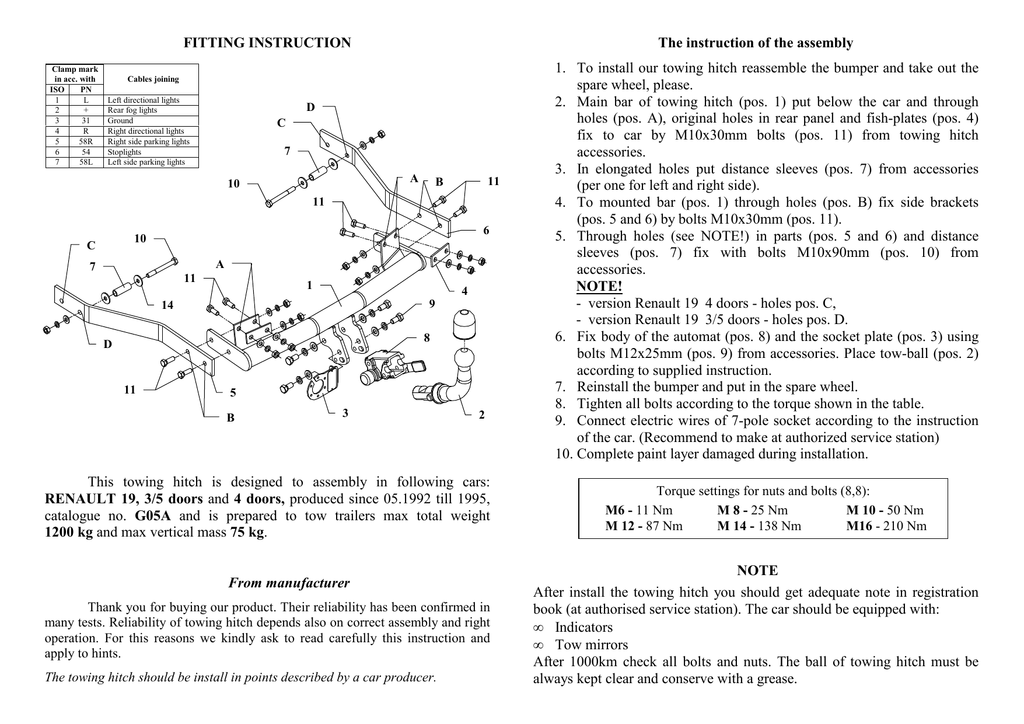 FITTING INSTRUCTION Clamp mark in acc. with ISO PN 1 L 2 + 3 31 4 R 5 58R 6 54 7 58L The instruction of the assembly Cables joining Left directional lights Rear fog lights Ground Right directional lights Right side parking lights Stoplights Left side parking lights D C 7 A 10 11 B 11 6 10 C A 7 11 1 4 9 14 8 D 11 5 B 3 2 This towing hitch is designed to assembly in following cars: RENAULT 19, 3/5 doors and 4 doors, produced since 05.1992 till 1995, catalogue no. G05A and is prepared to tow trailers max total weight 1200 kg and max vertical mass 75 kg. From manufacturer Thank you for buying our product. Their reliability has been confirmed in many tests. Reliability of towing hitch depends also on correct assembly and right operation. For this reasons we kindly ask to read carefully this instruction and apply to hints. The towing hitch should be install in points described by a car producer. 1. To install our towing hitch reassemble the bumper and take out the spare wheel, please. 2. Main bar of towing hitch (pos. 1) put below the car and through holes (pos. A), original holes in rear panel and fish-plates (pos. 4) fix to car by M10x30mm bolts (pos. 11) from towing hitch accessories. 3. In elongated holes put distance sleeves (pos. 7) from accessories (per one for left and right side). 4. To mounted bar (pos. 1) through holes (pos. B) fix side brackets (pos. 5 and 6) by bolts M10x30mm (pos. 11). 5. Through holes (see NOTE!) in parts (pos. 5 and 6) and distance sleeves (pos. 7) fix with bolts M10x90mm (pos. 10) from accessories. NOTE! - version Renault 19 4 doors - holes pos. C, - version Renault 19 3/5 doors - holes pos. D. 6. Fix body of the automat (pos. 8) and the socket plate (pos. 3) using bolts M12x25mm (pos. 9) from accessories. Place tow-ball (pos. 2) according to supplied instruction. 7. Reinstall the bumper and put in the spare wheel. 8. Tighten all bolts according to the torque shown in the table. 9. Connect electric wires of 7-pole socket according to the instruction of the car. (Recommend to make at authorized service station) 10. Complete paint layer damaged during installation. Torque settings for nuts and bolts (8,8): M6 - 11 Nm M 8 - 25 Nm M 10 - 50 Nm M 12 - 87 Nm M 14 - 138 Nm M16 - 210 Nm NOTE After install the towing hitch you should get adequate note in registration book (at authorised service station). The car should be equipped with: • Indicators • Tow mirrors After 1000km check all bolts and nuts. The ball of towing hitch must be always kept clear and conserve with a grease. PPUH AUTO-HAK Sp.J. Towing hitch accessories: Produkcja Zaczepów Kulowych Henryk & Zbigniew Nejman 76-200 SŁUPSK ul. Słoneczna 16K tel/fax (059) 8-414-414; 8-414-413 E-mail: [email protected] www.autohak.com.pl Towing hitch (without electrical set) Class: A50-X Cat. no. G05A Technical data: D-value: 7,1 kN maximum trailer weight: 1200 kg maximum vertical cup mass: 75 kg Designed for: Manufacturer: RENAULT Model: 19 Type: 3/5 doors, 4 doors produced since 05.1992 till 1995 Approval number according to Directive 94/20/EC: e20*94/20*0146*00 Foreword This towing hitch is designed according to rules of safety traffic regulations. The towing hitch is a safety component and can be install only by qualified personnel. Any alteration or conversion of the towing hitch is prohibited and would lead to cancellation of design certification. Remove insulating compound and underseal from vehicle (if present) in the area of the matting surfaces of the towing hitch. The vehicle manufacturer’s specifications regarding trailer mass and max. vertical cup mass are decisive for driving whereat values for the towing hitch cannot be exceeded. D-value formula: Max trailer weight [kg] x Max vehicle weight [kg] Max trailer weight [kg] + Max vehicle weight [kg] X 9,81 = 1000 D [kN] INSTRUKCJA MontaŜu i eksploatacji zaczepu kulowego Oznaczenie zacisku wg ISO PN 1 L 2 + 3 31 4 R 5 58R 6 54 7 58L Kolejność czynności przy montaŜu 1. Łączenie przewodów D Kierunkowskazy lewe Tylne światła przeciwmgłowe Masa Kierunkowskazy prawe Światła pozycyjne prawe Światła hamowania Światła pozycyjne lewe C 7 A 10 11 B 11 6 10 C A 7 11 1 4 9 14 8 D 11 5 B 3 2 Zaczep kulowy przeznaczony jest do zamontowania w samochodzie: RENAULT 19, 3/5 drz. i 4 drz., produkowanym od 05.1992r. do 1995r., nr katalogowy G05A i słuŜy do ciągnięcia przyczep o masie całkowitej 1200 kg i nacisku na kulę max 75 kg. OD PRODUCENTA Dziękujemy za wybór produkowanego przez naszą firmę zaczepu kulowego. Jego niezawodność została potwierdzona licznymi testami oraz opiniami zadowolonych klientów. JednakŜe niezawodność zaczepów kulowych jest zaleŜna równieŜ od prawidłowego montaŜu oraz prawidłowej eksploatacji. Z tego powodu prosimy Państwa o staranne przeczytanie niniejszej instrukcji montaŜu oraz przestrzeganie właściwych wskazówek. Zaczep naleŜy zamontować w miejscach do tego celu przeznaczonych przez producenta samochodu. W celu zamontowania zaczepu naleŜy zdemontować zderzak oraz wyjąć koło zapasowe. 2. Belkę główną zaczepu (poz. 1) przyłoŜyć od spodu samochodu i poprzez otwory zaczepu (poz. A), fabryczne otwory w tylnym płacie oraz nakładki (poz. 4) skręcić śrubami M10x30mm (poz. 11) z wyposaŜenia zaczepu. 3. W podłuŜne otwory włoŜyć tulejki dystansowe poz. 7 (po jednej z prawej i lewej strony) z wyposaŜenia zaczepu. 4. Do zamontowanej juŜ belki głównej zaczepu (poz. 1) poprzez otwory zaczepu (poz. B) przykręcić śrubami M10x30mm (poz. 11) wsporniki boczne zaczepu (poz. 5 i 6). 5. Poprzez otwory (patrz UWAGA!) we wspornikach zaczepu (poz. 5 i 6) oraz włoŜone tulejki dystansowe (poz. 7) skręcić śrubami M10x90mm (poz. 10) z wyposaŜenia. UWAGA! - wersja Renault 19 4 drz. otwory (poz. C), - wersja Renault 19 3/5 drz. otwory (poz. D). 6. Przykręcić korpus automatu (poz. 8) śrubami M12x25mm (poz. 9) wraz z blachą pod gniazdo (poz. 3). Zamocować kulę zgodnie z instrukcją dołą