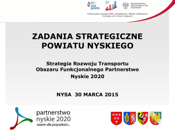 ZADANIA STRATEGICZNE POWIATU NYSKIEGO Strategia Rozwoju Transportu Obszaru Funkcjonalnego Partnerstwo Nyskie 2020 NYSA 30 MARCA 2015 Zadania strategicznePowiat nyski - centrum przesiadkowe - nowy niskoemisyjny tabor autobusowy - ścieżki rowerowe Zadania strategicznePowiat nyski - zatoki autobusowe - drogi dojazdowe do centrum przesiadkowego - parkingi Park&Ride Zadania strategiczneGłuchołazy • • • • • • • Modernizacja dworca PKP w m. Głuchołazy miasto wraz z budową peronu na torach kolejowych z dostosowaniem dla osób niepełnosprawnych. Budowa parkingu dla samochodów osobowych wraz z infrastrukturą towarzyszącą. Przebudowa, modernizacja i budowa dojść pomiędzy peronem i parkingiem. Modernizacja placu manewrowego dla autobusów. Budowa, przebudowa i modernizacja drogi do obsługi centrum przesiadkowego /zgodnie z planem 36 KDD, 35KDD/ Modernizacja terenu przy stacji PKP Pokrzywna-Moszczanka. Budowa wiaty przystankowej oraz budowa parkingu dla samochodów osobowych. Przebudowa i modernizacja przystanków i zatok autobusowych na trasie Nysa - Głuchołazy w m. Głuchołazy: ul. Wrocławska 1 przystanek; Bodzanów: 3 zatoki 1 przystanek; Nowy Świętów: 2 zatoki, 2 przystanki; Polski Świętów: 2 przystanki 2 zatoki oraz trasie Prudnik Głuchołazy w m. Charbielin: 2 zatoki, 2 przystanki Zadania strategiczneKorfantów Jagielnica • poprawa nawierzchni zatoki autobusowej • remont drogi powiatowej droga Nr 1529 Gryżów-Jegielnica o dł. 5,874 km, Gryżów • przystanek autobusowy przy drodze powiatowej nr 1529 wymaga: o wykonania małego ronda o wymiany wiaty przystankowej o wyłożenia kostką placu (od drogi powiatowej do przystanku autobusowego) • przystanek autobusowy (Piorunkowice) malowanie • remont drogi odcinek drogi Nr 1672 Wierzbięcice-Gryżów o dł. 1,625 km, Zadania strategiczneKorfantów Myszkowice • wyłożenie kostki brukowej wewnątrz przystanku autobusowego oraz wysypanie kamieniem dojścia do drogi powiatowej 1605 • remont drogi powiatowej Nr 1605 Wierzbięcice-Wielkie Łąki o dł. 5,277 km, Niesiebędowice • utwardzenie dojścia pomiędzy wiatą a drogą powiatową nr 1532 • ustanowienie bariery ochronnej przed wiatą przystankową dla bezpieczeństwa podróżnych Pleśnica • utwardzenie pobocze pomiędzy wiatą autobusową a droga powiatową nr 1527 • remont drogi powiatowej Nr 1527 Przydroże Wielkie-Śmicz o dł. 2,906 km, Zadania strategiczneKorfantów Przydroże Małe • wyłożenie podłoża kostką brukową wewnątrz istniejącej wiaty przystankowej • oznaczenie przystanku autobusowego • utwardzenie pobocza po przeciwnej stronie istniejącego przystanku autobusowego • Przydroże Małe (Ligota Ścinawska) wykonanie chodnika od zabudowań do przystanku autobusowego przy drodze powiatowej 1556 Rączka • budowa zatoki autobusowej Zadania strategiczneKorfantów Ścinawa Mała • budowa wiaty przystankowej przy ul. Niemodlińskiej (przystanek n/ż) • poprawa nawierzchni zatoki autobusowej przy ul. Rynek • remont drogi powiatowej Nr 1205 Biała-Węża o dł. 8,662 km, Ścinawa Nyska • oznakowanie przystanku autobusowego Węża • poprawa nawierzchni zatoki autobusowej, • utwardzenie wejścia do wiaty przystankowej, • oznakowanie przystanku autobusowego. Zadania strategiczneKorfantów Wielkie Łąki • oznakowanie przystanku autobusowego Włodary • poprawa nawierzchni zatoki autobusowej przy ul. Leśnej • remont drogi powiatowej Nr 1531 Węża-Jasienica Dolna o dł. 6,268 km, Włostowa • budowa wiaty przystankowej (przystanek n/ż) • utwardzenie pobocza dojście do przystanku autobusowego • remont drogi powiatowej droga Nr 1 555 droga przez wieś Włostowa o dł. 1,722 km, Zadania strategiczneKorfantów Kuźnica Ligocka • poprawa nawierzchni zatoki autobusowej Kuźnica Ligocka I • utwardzenie poboczy po przeciwnych stronach istniejących przystanków autobusowych • remont drogi powiatowej droga Nr 1524 Korfantów-Kuźnica Ligocka o dł. 6,262 km, Rzymkowice • utwardzenie poboczy obu przystanków n/ż • remont drogi powiatowej Nr 1206 Biała-Sowin o dł. 8,351 km, Zadania strategiczneKorfantów Przydroże Wielkie • utwardzenie pobocze obu przystanków pomiędzy wiatą autobusową a drogą powiatową nr 1530 Rynarcice • poprawa nawierzchni zatoki autobusowej Przechód • utwardzenie poboczy przystanku. autobusowego n/ż Stara Jamka • poprawa nawierzchni pobocza przy istniejącym przystanku autobusowym Zadania strategiczneKorfantów Puszyna • zamontowanie barierki przy istniejącym przystanku autobusowym • przedłużenie istniejącego chodnika umożliwiające bezpieczne dojście do przystanku autobusowego • remont drogi powiatowej odcinek drogi Nr 1526 Korfantów-Biała o dł. 5,874 km, Piechocice • remont drogi powiatowej odcinek drogi Nr 1528 Stara Jamka-Kolonia Otocka o dł. 2,655 km, Zadania strategiczneŁambinowice • Nazwa zadania: Budowa drogi gminnej – Piątkowice Drogoszów celem skomunikowania miejscowości – • Planowana do realizacji inwestycja obejmuje remont drogi gminnej – na odcinku 3,102 km. Zakres zadania obejmuje wykonanie asfaltu w 2 warstwach, wykonanie podbudowy spełniającej wszystkie parametry dla drogi kategorii gminnej, rozbudowę oświetlenia ulicznego. Zadania strategiczneŁambinowice • Nazwa zadania: Budowa drogi gminnej – Piątkowice – Mańkowice (przez las) celem skomunikowania miejscowości • Planowana do realizacji inwestycja obejmuje remont drogi gminnej – na odcinku 2,655 km. Zakres zadania obejmuje wykonanie asfaltu w 2 warstwach , wykonanie podbudowy spełniającej wszystkie parametry dla drogi kategorii gminnej. Zadania strategiczneŁambinowice • • Nazwa zadania: Remont drogi gminnej – ul Dworcowa w miejscowości Łambinowice w kierunku stacji PKP oraz przystanku autobusowego Planowana do realizacji inwestycja obejmuje remont drogi gminnej – ul Dworcowa w Łambinowicach na odcinku 0,438 km. Zakres zadania
