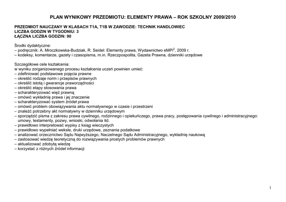 PLAN WYNIKOWY PRZEDMIOTU: ELEMENTY PRAWA – ROK SZKOLNY 2009/2010 PRZEDMIOT NAUCZANY W KLASACH T1A, T1B W ZAWODZIE: TECHNIK HANDLOWIEC LICZBA GODZIN W TYGODNIU: 3 ŁĄCZNA LICZBA GODZIN: 90 Środki dydaktyczne: – podręcznik: A. Mroczkowska-Budziak, R. Seidel: Elementy prawa, Wydawnictwo eMPi2, 2009 r. – kodeksy, komentarze, gazety i czasopisma, m.in. Rzeczpospolita, Gazeta Prawna, dzienniki urzędowe Szczegółowe cele kształcenia: w wyniku zorganizowanego procesu kształcenia uczeń powinien umieć: – zdefiniować podstawowe pojęcia prawne – określić rodzaje norm i przepisów prawnych – określić istotą i gwarancje praworządności – określić etapy stosowania prawa – scharakteryzować więź prawną – omówić wykładnię prawa i jej znaczenie – scharakteryzować system źródeł prawa – omówić problem obowiązywania aktu normatywnego w czasie i przestrzeni – znaleźć potrzebny akt normatywny w dzienniku urzędowym – sporządzić pisma z zakresu prawa cywilnego, rodzinnego i opiekuńczego, prawa pracy, postępowania cywilnego i administracyjnego: umowy, testamenty, pozwy, wnioski, odwołania itd. – prawidłowo interpretować wypisy z ksiąg wieczystych – prawidłowo wypełniać weksle, druki urzędowe, zeznania podatkowe – analizować orzecznictwo Sądu NajwyŜszego, Naczelnego Sądu Administracyjnego, wykładnię naukową – zastosować wiedzę teoretyczną do rozwiązywania prostych problemów prawnych – aktualizować zdobytą wiedzę – korzystać z róŜnych źródeł informacji 1 L.p. 1 Temat zająć edukacyjnych Sprawy organizacyjne. Historia prawa Cele edukacyjne i osiągnięcia ucznia Uczeń zna wymagania edukacyjne, treść kontraktu. Wskazuje cechy charakterystyczne epok w historii prawa. Porównuje instytucje prawne róŜnych epok w historii prawa. 2 Norma prawna. Przepis prawa pojecie prawa, normy prawnej, przepisu prawa; oceny: – dopuszczający: uczeń zna pojęcia prawa, normy prawnej, przepisu prawa, innych norm postępowania, prawa zwyczajowego i stanowionego; podaje elementy budowy normy prawnej, kryteria podziału norm prawnych, rodzaje przepisów prawnych – dostateczny: uczeń charakteryzuje ww. pojęcia – dobry: uczeń charakteryzuje związki między pojęciami, potrafi je określić na podstawie prostych przykładów – bardzo dobry: uczeń samodzielnie podaje dziedziny Ŝycia regulowane róŜnymi systemami normatywnymi – celujący: uczeń omawia równieŜ normy semiimperatywne – obniŜone wymagania: uczeń próbuje określić znaczenie prawa w Ŝyciu społecznym, określa swoje zachowanie na podstawie podanego przez nauczyciela przykładu 3 Praworządność. Stosowanie prawa 4 Stosunek prawny. Zdarzenie prawne pojecie praworządności, organy czuwające nad zapewnieniem praworządności, pojecie i etapy stosowania prawa: oceny: – dopuszczający: uczeń zna pojecie praworządności, wymienia organy czuwające nad zapewnieniem praworządności, wymienia etapy stosowania prawa – dostateczny: uczeń podaje znaczenie ww. pojąć – dobry: uczeń określa znaczenie praworządności, charakteryzuje na podstawie podanego przykładu etapy stosowania prawa – bardzo dobry: uczeń charakteryzuje instytucje czuwające nad przestrzeganiem praworządności, samodzielnie omawia tematyką zająć na podstawie przygotowanych przez siebie przykładów – celujący: uczeń potraf i ocenić praworządność w Polsce, podaje własne propozycje poprawy – obniŜone wymagania: uczeń próbuje określić, czym jest dla niego praworządność i przypomina sobie nazwy takich organów, jak np. Rzecznik Praw Obywatelskich, Rzecznik Praw Dziecka pojecie i elementy stosunku prawnego, pojęcie i rodzaje zdarzeń prawnych, prawo podmiotowe, rodzaje praw podmiotowych, uprawnienie, roszczenie; oceny: – dopuszczający: uczeń podaje przykłady stosunków społecznych, w tym prawnych; zna omawiane pojęcia i próbuje określić prawa i obowiązki stron; – dostateczny: uczeń definiuje pojęcia, podaje prawa i obowiązki stron – dobry: uczeń charakteryzuje elementy stosunku prawnego i podział zdarzeń prawnych – bardzo dobry: uczeń charakteryzuje samodzielnie stosunek prawny na podstawie wzoru umowy; określa znaczenie praw podmiotowych i roszczeń w Ŝyciu społecznym – celujący: uczeń omawia samodzielnie konsekwencje więzi prawnych, dyskutuje na ten temat, nawiązując do historii prawa, np. w państwie hitlerowskim – obniŜone wymagania: uczeń określa znaczenie prawa w określonych dziedzinach Ŝycia społecznego; podaje przykłady stosunków prawnych, treść prostej umowy, np. sprzedaŜy biletu na autobus 2 5 Wykładnia prawa 6 System i gałęzie prawa 7 Źródła prawa 8 Powtórzenie i sprawdzian wiadomości pojecie i rodzaje oraz znaczenie wykładni prawa; oceny: – dopuszczający: uczeń zna pojęcie i cel wykładni prawa – dostateczny: uczeń definiuje wykładnię prawa i klasyfikuje jej rodzaje na podstawie prostych przykładów – dobry: uczeń samodzielnie określa rodzaje wykładni oraz jej znaczenie na podstawie innych niŜ podręcznikowe przykładów – bardzo dobry: uczeń analizuje wyrok sądu lub orzeczenie SN z pomocą nauczyciela – celujący: uczeń samodzielnie analizuje wyrok sądu lub orzeczenie SN, charakteryzuje rodzaje wykładni nie omawiane w podręczniku – obniŜone wymagania: uczeń interpretuje proste przykłady zwrotów uŜytych w tekście aktu normatywnego pojęcie systemu prawa, podział prawa na gałęzie i jego znaczenie; oceny: – dopuszczający: uczeń zna pojecie systemu prawa, wymienia gałęzie prawa – dostateczny: uczeń zna kryterium podziału prawa na gałęzie, charakteryzuje wybrane gałęzie prawa według podręcznika – dobry: uczeń dostrzega problem stosowania róŜnych gałęzi prawa w określonej sytuacji – bardzo dobry: uczeń przygotowuje równieŜ referat na temat wybranej instytucji prawnej, której nie omówiono w podręczniku w ramach danej gał