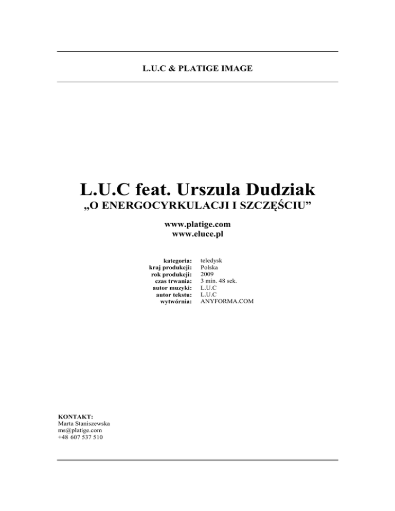 L.U.C & PLATIGE IMAGE L.U.C feat. Urszula Dudziak „O ENERGOCYRKULACJI I SZCZĘŚCIU” www.platige.com www.eluce.pl kategoria: kraj produkcji: rok produkcji: czas trwania: autor muzyki: autor tekstu: wytwórnia: KONTAKT: Marta Staniszewska [email protected] +48 607 537 510 teledysk Polska 2009 3 min. 48 sek. L.U.C L.U.C ANYFORMA.COM O TELEDYSKU KILKA SŁÓW: „O energocyrkulacji i szczęściu” - zarówno utwór jak i sam klip opowiada o przekazywaniu pozytywnej energii, która raz wysłana w końcu wraca ze zdwojoną siła, przedstawia filozofie „podaj dalej”. Samo powstanie klipu jest dobrą ilustracją tej filozofii, gdyŜ został zrobiony pro bono. W utworze gościnnie wystąpiła Urszula Dudziak. Michał Dziekan (reŜyser teledysku) wraz z grupą grafików i animatorów ze studia Platige Image, inspirowany animacjami Terrego Giliama z „Latającego Cyrku Monthy Pytona”, wykonał to małe arcydzieło animacyjne. 2/7 TEKST: Nie znam sie na śledziach ani zbytnio na ludziach Średnio rozumiem Ŝycie mimo to biorę w nim udział Stawiam na wyobraźnię i szczere uczucia Zaś cierpie na namiętności Adhd otrucia Moje pomysły waza tyle ze pakuje mną pudzian choć mam naturę jajka Jak hantle raz na górze raz na dole jak bobika fajka Takie to Ŝycie grajka mam hece Lecę przez ten kosmos nie mam wyboru jak Łajka Nie chce być sezonowy jak malajka takino w Mikołajkach kiedy mam majka mogę być nawet w lajkrach pozera mnie rymu tajga kocham te po sylabach snucia tu wszystko moŜliwe zaufaj mi Ŝycie to bajka jeśli zamarzysz zanuci ci nawet Ula Dudziak krąg się otwiera wysłana energia wraca do nas jak boomerang A wiec fernando tu to chyba nie przypadek Metafora śledzia który oślepł Ślepo wierząc, ze mu Ŝycie samo szczęście przyśle chyba daje rade Jak ministrom premier Belka, słodycz tej chwili cieszy mnie wiec jak gumisie w Ŝelkach 3/7 Nagle spokojem zalewa mnie dystansu wielka chochelka Nie pękam Ja eluce nie konopielka ni lalka zawieszona na losu szelkach A sposób To wybór filozofii jako biosu która instaluje wam na zworkach i kabelkach szczęście pojawia się i znika na wybiegu Ŝycia jak piękna modelka Krótko jak byt cocacolowego bąbelka Na chwile jak w idolu wykreowany talent Dobra energia powraca do mnie jak jedi wiec podaje ja dalej Ref. Ile ja tobie tyle ty jemu, temu co mi odda Energia niczym boomerang wyrzucony z okna Ile ja tobie tyle ty jemu, temu co mi odda Dziś ja naleje tobie a jutro sam wypije do dna Ile ja tobie tyle ty jemu, temu co mi odda 4/7 INFORMACJE O TWÓRCACH WYKONAWCA: L.U.C (Łukasz Rostkowski, ur. 1981 r.) - Producent muzyczny, kompozytor, autor tekstów, wokalista i reŜyser wideoklipów. Swoją twórczość rozpoczął nagle w 2002r. bez jakiegokolwiek wykształcenia muzycznego. W roku 2003 załoŜył alternatywny projekt KANAŁ AUDYTYWNY, który za nowatorską mieszankę gatunków nominowany został do wielu polskich nagród kulturalnych, m.in. głównej nagrody Polskiej Akademii Muzycznej – Fryderyka w 2005r. czy Ślizgerów, Brylantów Dolnośląskich. Z wykształcenia magister prawa, porzucił aplikację adwokacką, by oddać się swojej największej pasji – muzyce, tekstom i filmowi. To takŜe autor kilkunastu wideoklipów. Artysta w wyjątkowy sposób łączy muzykę z obrazem i słowem dlatego juŜ od pierwszego nakręconego teledysku przez kilka lat pod rząd otrzymywał nominację lub główną nagrodę - YACHA - na festiwalu polskich wideoklipów w Gdyni. Od 2006 roku L.U.C wydał 3 solowe albumy Haelucenogenoklektyzm, Homoxymoronomaturę oraz PLANET LUC –album multimedialny, którym artysta przekroczył surowe bariery gatunków i połączył róŜne dziedziny sztuki w jedno dzieło. W grudniu 2008 roku L.U.C za ten właśnie przełomowy album został nominowany do Paszportów Polityki, kilkakrotnie do Fryderyków i wielu innych nagród. W latach 2006-2008 zrealizował z Telewizją Polską 4 koncerty m.in. nominowane do Gwarancji Kultury. Pisząc muzykę autorską, a takŜe do filmów i spektakli współpracował m.in. z Janem i Marią Peszek, Leszkiem MoŜdŜerem, Urszulą Dudziak, Andrzejem Smolikiem, Jackiem Borusińskim, Fokusem i Rahimem (ex Paktofonika), Igorem Pudło (Skalpel) i wieloma innymi wybitnymi artystami. Jednocześnie jest on wyznawcą filozofii „podaj dalej” i wspierany przez autorytety promuje debiutantów takich jak KIRK, ŃEMY, czy PMX. 5/7 REśYSER, ART DIRECTOR: PRODUCENT: Michał Dziekan (ur. 1985) – ilustrator, animator, reŜyser. Na czwartym roku porzucił studia architektoniczne i rozpoczął pracę w studiu Platige Image. Swoją przygodę artystyczną zaczynał od grafiki 2D, robiąc koncepty, podmalówki, tekstury do projektów komercyjnych. W wolnym czasie projektuje okładki oraz plakaty. Niedawno powstały teledysk dla L.U.C „O energocyrkulacji i szczęściu”, to jego debiut animacyjny oraz reŜyserski. Platige Image (www.platige.com) - czołowe i wielokrotnie nagradzane studio postprodukcyjne w Polsce. Specjalizuje się w tworzeniu grafiki komputerowej, animacji 3D, realizacjach cyfrowych efektów specjalnych oraz kompozycji obrazu na potrzeby produkcji reklamowych i fabularnych. Na swoim koncie ma kilkaset reklam telewizyjnych, czołówek programów i teledyski. Studio jest zaangaŜowane w produkcję filmów animowanych. Zrealizowało między innymi takie obrazy jak filmy Tomka Bagińskiego: nominowaną do Oscara „Katedrę“ oraz „Sztukę spadania“, zdobywcę nagrody Brytyjskiej Akademii Filmowej i Telewizyjnej (BAFTA). Platige Image zrealizowało materiały na potrzeby gry „Wiedźmin”, której producentem jest firma CD Projekt Red. Studio poszerza swoją działalność tworząc tzw. projekty specjalne. Do ostatnich naleŜy m.in. wizualizacja koncertu Krzysztofa Pendereckiego „Siedem Bram Jerozolimy”, wieńczącego jubileusz 75-lecia światowej sławy kompozytora. 6/7 EKIPA: REśYSERIA: Michał Dziekan SCENARIUSZ: L.U.C Michał Dziekan PRODUCENT: