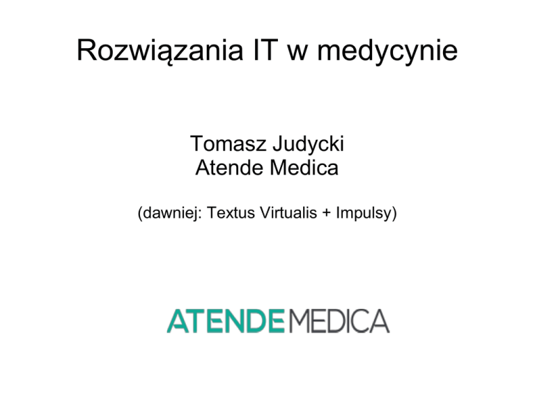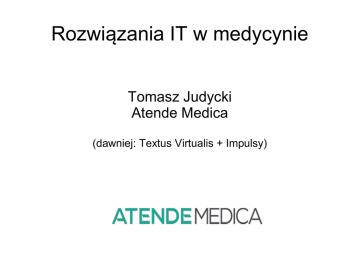 Rozwiązania IT w medycynie Tomasz Judycki Atende Medica (dawniej: Textus Virtualis + Impulsy) IT w medycynie – wkrótce Zmiany przepisów Dokumentacja elektroniczna P1 e-Zwolnienia Trendy Interoperacyjność Internet rzeczy Telemonitoring, urządzenia noszalne (wereables) Rozpoznawanie mowy, długopisy cyfrowe IT w medycynie – przyszłość Systemy eksperckie za: usprawniają diagnostykę obiekcje: lekarze widzą w nich zagrożenie Sekwencjonowanie genomu za: indywidualnie dobrane leczenie, skuteczna profilaktyka obiekcje: informacje o podatności na choroby czy przewidywalnej długości życia są niezwykle wrażliwe Inteligentny szpital Monitorowanie parametrów szpitala poziom paliwa w generatorze napięcie w gniazdkach/naładowanie UPSów ciśnienie i poziom zapasów tlenu temperatura w lodówkach Monitorowanie parametrów pacjenta temperatura ciśnienie ekg Inteligentny szpital – c.d. Integracja systemów wewnętrznych HIS, LIS, RIS/PACS F/K, Kadry/Płace, Obrót towarowy Analizy BI, System informowania kierownictwa Integracja systemów zewnętrznych LIS w outsourcing'u teleradiologia P1, wymiana dokumentacji elektronicznej Dziękuję za uwagę! Tomasz Judycki Wiceprezes Zarządu Atende Medica [email protected] Prezes Zarządu Polskiej Izby Informatyki Medycznej piim.org.pl