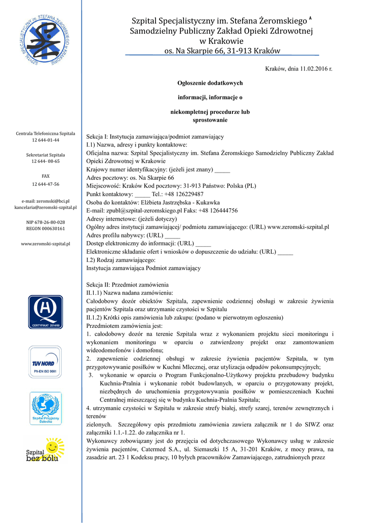 Szpital Specjalistyczny im. Stefana Żeromskiego Samodzielny Publiczny Zakład Opieki Zdrowotnej w Krakowie os. Na Skarpie 66, 31-913 Kraków Kraków, dnia 11.02.2016 r. Ogłoszenie dodatkowych informacji, informacje o niekompletnej procedurze lub sprostowanie Centrala Telefoniczna Szpitala 12 644-01-44 Sekretariat Szpitala 12 644- 08-65 FAX 12 644-47-56 e-mail: [email protected] [email protected] NIP 678-26-80-028 REGON 000630161 www.zeromski-szpital.pl Sekcja I: Instytucja zamawiająca/podmiot zamawiający I.1) Nazwa, adresy i punkty kontaktowe: Oficjalna nazwa: Szpital Specjalistyczny im. Stefana Żeromskiego Samodzielny Publiczny Zakład Opieki Zdrowotnej w Krakowie Krajowy numer identyfikacyjny: (jeżeli jest znany) _____ Adres pocztowy: os. Na Skarpie 66 Miejscowość: Kraków Kod pocztowy: 31-913 Państwo: Polska (PL) Punkt kontaktowy: _____ Tel.: +48 126229487 Osoba do kontaktów: Elżbieta Jastrzębska - Kukawka E-mail: [email protected] Faks: +48 126444756 Adresy internetowe: (jeżeli dotyczy) Ogólny adres instytucji zamawiającej/ podmiotu zamawiającego: (URL) www.zeromski-szpital.pl Adres profilu nabywcy: (URL) _____ Dostęp elektroniczny do informacji: (URL) _____ Elektroniczne składanie ofert i wniosków o dopuszczenie do udziału: (URL) _____ I.2) Rodzaj zamawiającego: Instytucja zamawiająca Podmiot zamawiający Sekcja II: Przedmiot zamówienia II.1.1) Nazwa nadana zamówieniu: Całodobowy dozór obiektów Szpitala, zapewnienie codziennej obsługi w zakresie żywienia pacjentów Szpitala oraz utrzymanie czystości w Szpitalu II.1.2) Krótki opis zamówienia lub zakupu: (podano w pierwotnym ogłoszeniu) Przedmiotem zamówienia jest: 1. całodobowy dozór na terenie Szpitala wraz z wykonaniem projektu sieci monitoringu i wykonaniem monitoringu w oparciu o zatwierdzony projekt oraz zamontowaniem wideodomofonów i domofonu; 2. zapewnienie codziennej obsługi w zakresie żywienia pacjentów Szpitala, w tym przygotowywanie posiłków w Kuchni Mlecznej, oraz utylizacja odpadów pokonsumpcyjnych; 3. wykonanie w oparciu o Program Funkcjonalno-Użytkowy projektu przebudowy budynku Kuchnia-Pralnia i wykonanie robót budowlanych, w oparciu o przygotowany projekt, niezbędnych do uruchomienia przygotowywania posiłków w pomieszczeniach Kuchni Centralnej mieszczącej się w budynku Kuchnia-Pralnia Szpitala; 4. utrzymanie czystości w Szpitalu w zakresie strefy białej, strefy szarej, terenów zewnętrznych i terenów zielonych. Szczegółowy opis przedmiotu zamówienia zawiera załącznik nr 1 do SIWZ oraz załączniki 1.1.-1.22. do załącznika nr 1. Wykonawcy zobowiązany jest do przejęcia od dotychczasowego Wykonawcy usług w zakresie żywienia pacjentów, Catermed S.A., ul. Siemaszki 15 A, 31-201 Kraków, z mocy prawa, na zasadzie art. 23 1 Kodeksu pracy, 10 byłych pracowników Zamawiającego, zatrudnionych przez dotychczasowego Wykonawcę usług żywienia pacjentów w okresie obowiązywania umowy z dnia 21 grudnia 2015 r. (Nr Rej. 181/U/ZP/2015 ), zgodnie z wykazem stanowiącym załącznik nr 12 do SIWZ. II.1.3) Wspólny Słownik Zamówień (CPV) Słownik główny Słownik uzupełniający(jeżeli dotyczy) Główny przedmiot 79710000 Dodatkowe przedmioty 90910000 90610000 90620000 55320000 55321000 55322000 Sekcja IV: Procedura IV.1)Rodzaj procedury (podano w pierwotnym ogłoszeniu) Otwarta Ograniczona Ograniczona przyspieszona Negocjacyjna Negocjacyjna przyspieszona Dialog konkurencyjny Negocjacyjna z uprzednim ogłoszeniem Negocjacyjna bez uprzedniego ogłoszenia Negocjacyjna z publikacją ogłoszenia o zamówieniu Negocjacyjna bez publikacji ogłoszenia o zamówieniu Udzielenie zamówienia bez uprzedniej publikacji ogłoszenia o zamówieniu w Dzienniku Urzędowym Unii Europejskiej IV.2)Informacje administracyjne IV.2.1)Numer referencyjny: (podano w pierwotnym ogłoszeniu) ZP 38/15 IV.2.2)Dane referencyjne ogłoszenia w przypadku ogłoszeń przesłanych drogą elektroniczną: Pierwotne ogłoszenie przesłane przez eNotices TED eSender Login: ENOTICES_zeromski Dane referencyjne ogłoszenia: 2016-002643 rok i numer dokumentu IV.2.3)Ogłoszenie, którego dotyczy niniejsza publikacja: Numer ogłoszenia w Dz.U.: 2016/S 007-008441 z dnia: 12/01/2016 (dd/mm/rrrr) IV.2.4)Data wysłania pierwotnego ogłoszenia: 08/01/2016 (dd/mm/rrrr) Sekcja VI: Informacje uzupełniające VI.1) Ogłoszenie dotyczy: Procedury niepełnej Sprostowania Informacji dodatkowych VI.2) Informacje na temat niepełnej procedury udzielenia zamówienia: Postępowanie o udzielenie zamówienia zostało przerwane Postępowanie o udzielenie zamówienia uznano za nieskuteczne Zamówienia nie udzielono Zamówienie może być przedmiotem ponownej publikacji VI.3) Informacje do poprawienia lub dodania : VI.3.1) Zmiana oryginalnej informacji podanej przez instytucję zamawiającą Publikacja w witrynie TED niezgodna z oryginalną informacją, przekazaną przez instytucję zamawiającą Oba przypadki VI.3.2) W ogłoszeniu pierwotnym W odpowiedniej dokumentacji przetargowej (więcej informacji w odpowiedniej dokumentacji przetargowej) W obu przypadkach (więcej informacji w odpowiedniej dokumentacji przetargowej) VI.3.3) Tekst, który należy poprawić w pierwotnym ogłoszeniu Miejsce, w którym znajduje się zmieniany tekst: Zamiast: Powinno być: VI.3.4) Daty, które należy poprawić w pierwotnym ogłoszeniu Miejsce, w którym znajdują się zmieniane daty: IV.3.4) Termin składania ofert lub wniosków o dopuszczenie do udziału w postępowaniu Zamiast: 18/02/2016 Godzina: 11:00 (dd/mm/rrrr) Powinno być: 07/03/2016 Godzina: 11:00 (dd/mm/rrrr) Miejsce, w którym znajdują się zmieniane daty: IV.3.8) Warunki otwarcia ofert Zamiast: 18/02/2016 Godzina: 11:30 (dd/mm/rrrr) Powinno być: 07/03/2016 Godzina: 11:30 (dd/mm/rrrr) VI.3.5) Adresy i punkty kontaktowe, które należy poprawić VI.3.6) Tekst, który należy dodać do pierwotnego ogłoszenia Miejsce, w którym należy dodać tekst: Tekst do dodania: VI.4) Inne dodat