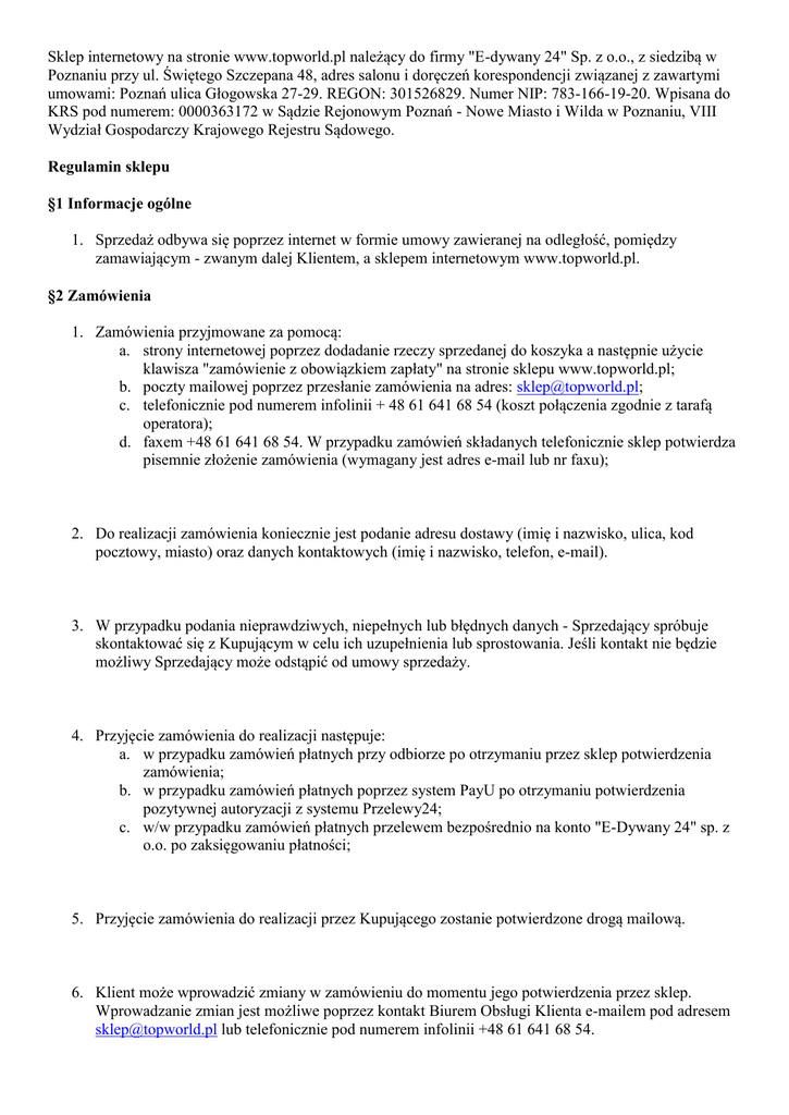 Sklep internetowy na stronie www.topworld.pl należący do firmy "E-dywany 24" Sp. z o.o., z siedzibą w Poznaniu przy ul. Świętego Szczepana 48, adres salonu i doręczeń korespondencji związanej z zawartymi umowami: Poznań ulica Głogowska 27-29. REGON: 301526829. Numer NIP: 783-166-19-20. Wpisana do KRS pod numerem: 0000363172 w Sądzie Rejonowym Poznań - Nowe Miasto i Wilda w Poznaniu, VIII Wydział Gospodarczy Krajowego Rejestru Sądowego. Regulamin sklepu §1 Informacje ogólne 1. Sprzedaż odbywa się poprzez internet w formie umowy zawieranej na odległość, pomiędzy zamawiającym - zwanym dalej Klientem, a sklepem internetowym www.topworld.pl. §2 Zamówienia 1. Zamówienia przyjmowane za pomocą: a. strony internetowej poprzez dodadanie rzeczy sprzedanej do koszyka a następnie użycie klawisza "zamówienie z obowiązkiem zapłaty" na stronie sklepu www.topworld.pl; b. poczty mailowej poprzez przesłanie zamówienia na adres: [email protected]; c. telefonicznie pod numerem infolinii + 48 61 641 68 54 (koszt połączenia zgodnie z tarafą operatora); d. faxem +48 61 641 68 54. W przypadku zamówień składanych telefonicznie sklep potwierdza pisemnie złożenie zamówienia (wymagany jest adres e-mail lub nr faxu); 2. Do realizacji zamówienia koniecznie jest podanie adresu dostawy (imię i nazwisko, ulica, kod pocztowy, miasto) oraz danych kontaktowych (imię i nazwisko, telefon, e-mail). 3. W przypadku podania nieprawdziwych, niepełnych lub błędnych danych - Sprzedający spróbuje skontaktować się z Kupującym w celu ich uzupełnienia lub sprostowania. Jeśli kontakt nie będzie możliwy Sprzedający może odstąpić od umowy sprzedaży. 4. Przyjęcie zamówienia do realizacji następuje: a. w przypadku zamówień płatnych przy odbiorze po otrzymaniu przez sklep potwierdzenia zamówienia; b. w przypadku zamówień płatnych poprzez system PayU po otrzymaniu potwierdzenia pozytywnej autoryzacji z systemu Przelewy24; c. w/w przypadku zamówień płatnych przelewem bezpośrednio na konto "E-Dywany 24" sp. z o.o. po zaksięgowaniu płatności; 5. Przyjęcie zamówienia do realizacji przez Kupującego zostanie potwierdzone drogą mailową. 6. Klient może wprowadzić zmiany w zamówieniu do momentu jego potwierdzenia przez sklep. Wprowadzanie zmian jest możliwe poprzez kontakt Biurem Obsługi Klienta e-mailem pod adresem [email protected] lub telefonicznie pod numerem infolinii +48 61 641 68 54. §3 Ceny towarów i płatność 1. Wszystkie ceny podane na stronach internetowych są cenami brutto wyrażonymi w złotych polskich i zawierają wszystkie podatki. Cena podana przy każdym towarze jest wiążąca w chwili złożenia przez klienta zamówienia. 2. Do każdej transakcji wystawiamy paragon. Na życzenie klienta wystawiamy faktury VAT. 3. Akceptujemy następujące formy płatności: a. Przelewy24 - zapłata kartą płatniczą lub szybkim przelewem przy zakupie. b. Za pobraniem - zapłata przy odbiorze towaru gotówką kurierowi c. Przelewem na konto d. Zapłata gotówką lub kartą płatniczą przy odbiorze osobistym w sklepie stacjonarnym przy ulicy Głogowskiej 27-29 w Poznaniu §4 Inne informacje 1. Wszystkie towary sprzedawane w sklepie topworld objęte są 24 miesięczną gwarancją. 2. Różnice pomiędzy wyglądem produktu prezentowanego na stronie sklepu internetowego www.topworld.pl a wyglądem produktu dostarczonego do Kupującego, wynikające wyłącznie z indywidualnych ustawień sprzętu komputerowego użytego przez Kupującego podczas składania zamówienia (np. odcień koloru produktu, proporcje produktu, itp.) nie stanowią podstaw do uznania produktu jako niezgodnego z umową a tym samym reklamacji. 3. Do zwracanego towaru należy dołączyć: otrzymany paragon lub kopię faktury, oświadczenie o odstąpieniu umowy. 4. Sprzedawca odmówi przyjęcia przesyłki, która zostanie przesłana na koszt sprzedawcy. 5. Sklep www.topworld.pl gwarantuje zwrot kwoty równej cenie towaru z wyłączeniem kosztu transportu. Pieniądze zostaną zwrócone w ciągu 14 dni przelewem bankowym na konto wskazane przez klienta. 6. W przypadku niezgodności towaru z umową prosimy o kontakt ze sklepem w celu uzgodnienia sposobu załatwienia reklamacji. §5 Koszty i terminy dostawy 1. Sklep internetowy Topworld.pl potwierdza przyjęcie zamówienia w ciągu jednego dnia roboczego od momentu zakupu przez klienta. Czas realizacji upływa od momentu potwierdzenia zamówienia przez klienta do czasu wysyłki. Przy czym nie są uwzględniane dni wolne od pracy, ani święta. Zamówienia realizujemy zazwyczaj w ciągu 2 - 7 dni roboczych. Maksymalny czas realizacji zamówienia wynosi do 8 tygodni. Sklep Topworld.pl zastrzega sobie prawo do wydłużenia czasu realizacji w przypadku chwilowego braku towaru z przyczyn niezależnych od sprzedawcy. Każdy z naszych klientów jest powiadamiany o aktualnym terminie realizacji, statusie zamówienia, wysyłce towarów do klienta. Zamówienie na towary o różnym czasie realizacji wysyłane jest po skompletowaniu całości, tzn. po upływie czasu najdłuższego z podanych. 2. Termin otrzymania przesyłki to czas realizacji + przewidywany czas dostawy. Przesyłki w zależności od wagi i wielkości dostarczamy: a. W przedziale 5 - 50 kg przy boku dłuższym boku przesyłki nie dłuższym niż 250 cm za pomocą firmy kurierskiej DPD. Dostawa realizowana jest do drzwi lokalu klienta (bez ograniczenia do którego pięrta). Czas dostawy jeden dzień roboczy. b. Powyżej 50 kg lub przy jednym z boków paczki dłuższym niż 250 cm firmą transportową TNT lub Röhling Suus. Dostawa realizowana jest pod adres klienta. (kurier może oczekiwać pomocy). Czas dostawy jeden do dwóch dni roboczych. Jeśli życzą sobie Państwo usługę wniesienia do drzwi lokalu prosimy o kontakt w celu ustalenia możliwości realizacji usługi i jej kosztu. 3. Koszt transportu towarów na terenie Polski: a. przy zakupach do kwoty 199 złotych i zapłacie przelew zwy