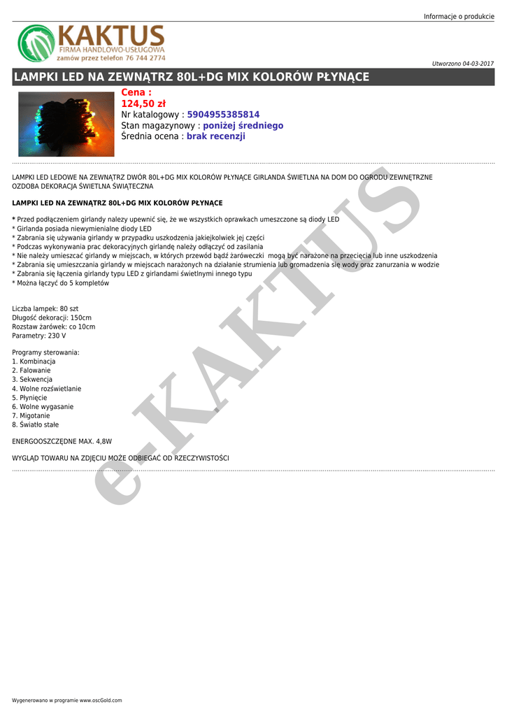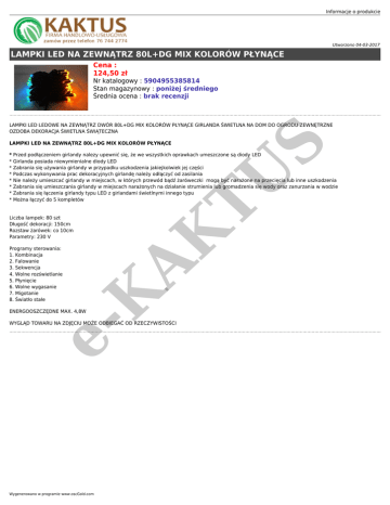 Informacje o produkcie Utworzono 04-03-2017 LAMPKI LED NA ZEWNĄTRZ 80L+DG MIX KOLORÓW PŁYNĄCE Cena : 124,50 zł Nr katalogowy : 5904955385814 Stan magazynowy : poniżej średniego Średnia ocena : brak recenzji LAMPKI LED NA ZEWNĄTRZ 80L+DG MIX KOLORÓW PŁYNĄCE S LAMPKI LED LEDOWE NA ZEWNĄTRZ DWÓR 80L+DG MIX KOLORÓW PŁYNĄCE GIRLANDA ŚWIETLNA NA DOM DO OGRODU ZEWNĘTRZNE OZDOBA DEKORACJA ŚWIETLNA ŚWIĄTECZNA Liczba lampek: 80 szt Długość dekoracji: 150cm Rozstaw żarówek: co 10cm Parametry: 230 V eK Programy sterowania: 1. Kombinacja 2. Falowanie 3. Sekwencja 4. Wolne rozświetlanie 5. Płynięcie 6. Wolne wygasanie 7. Migotanie 8. Światło stałe AK TU * Przed podłączeniem girlandy nalezy upewnić się, że we wszystkich oprawkach umeszczone są diody LED * Girlanda posiada niewymienialne diody LED * Zabrania się używania girlandy w przypadku uszkodzenia jakiejkolwiek jej części * Podczas wykonywania prac dekoracyjnych girlandę należy odłączyć od zasilania * Nie należy umieszcać girlandy w miejscach, w których przewód bądź żaróweczki mogą być narażone na przecięcia lub inne uszkodzenia * Zabrania się umieszczania girlandy w miejscach narażonych na działanie strumienia lub gromadzenia się wody oraz zanurzania w wodzie * Zabrania się łączenia girlandy typu LED z girlandami świetlnymi innego typu * Można łączyć do 5 kompletów ENERGOOSZCZĘDNE MAX. 4,8W WYGLĄD TOWARU NA ZDJĘCIU MOŻE ODBIEGAĆ OD RZECZYWISTOŚCI Wygenerowano w programie www.oscGold.com