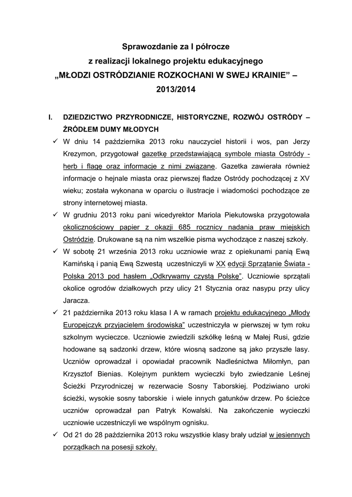 Sprawozdanie za I półrocze z realizacji lokalnego projektu edukacyjnego „MŁODZI OSTRÓDZIANIE ROZKOCHANI W SWEJ KRAINIE” – 2013/2014 I. DZIEDZICTWO PRZYRODNICZE, HISTORYCZNE, ROZWÓJ OSTRÓDY – ŹRÓDŁEM DUMY MŁODYCH W dniu 14 października 2013 roku nauczyciel historii i wos, pan Jerzy Krezymon, przygotował gazetkę przedstawiającą symbole miasta Ostródy herb i flagę oraz informacje z nimi związane. Gazetka zawierała również informacje o hejnale miasta oraz pierwszej fladze Ostródy pochodzącej z XV wieku; została wykonana w oparciu o ilustracje i wiadomości pochodzące ze strony internetowej miasta. W grudniu 2013 roku pani wicedyrektor Mariola Piekutowska przygotowała okolicznościowy papier z okazji 685 rocznicy nadania praw miejskich Ostródzie. Drukowane są na nim wszelkie pisma wychodzące z naszej szkoły. W sobotę 21 września 2013 roku uczniowie wraz z opiekunami panią Ewą Kamińską i panią Ewą Szwestą uczestniczyli w XX edycji Sprzątanie Świata Polska 2013 pod hasłem „Odkrywamy czystą Polskę”. Uczniowie sprzątali okolice ogrodów działkowych przy ulicy 21 Stycznia oraz nasypu przy ulicy Jaracza. 21 października 2013 roku klasa I A w ramach projektu edukacyjnego „Młody Europejczyk przyjacielem środowiska” uczestniczyła w pierwszej w tym roku szkolnym wycieczce. Uczniowie zwiedzili szkółkę leśną w Małej Rusi, gdzie hodowane są sadzonki drzew, które wiosną sadzone są jako przyszłe lasy. Uczniów oprowadzał i opowiadał pracownik Nadleśnictwa Miłomłyn, pan Krzysztof Bienias. Kolejnym punktem wycieczki było zwiedzanie Leśnej Ścieżki Przyrodniczej w rezerwacie Sosny Taborskiej. Podziwiano uroki ścieżki, wysokie sosny taborskie i wiele innych gatunków drzew. Po ścieżce uczniów oprowadzał pan Patryk Kowalski. Na zakończenie wycieczki uczniowie uczestniczyli we wspólnym ognisku. Od 21 do 28 października 2013 roku wszystkie klasy brały udział w jesiennych porządkach na posesji szkoły. W styczniu 2014 r. uczniowie klas II w ramach zajęć artystycznych wykonali prace plastyczne pod nazwą „Zabytki Ostródy”. Młodzież zapoznana została z charakterystycznymi zabytkami i miejscami miasta. Prace został wykonane różnymi technikami plastycznymi: ołówkiem, kredkami, pastelami. Uczniowie pod opieka nauczyciela przygotowali wystawę swoich prac. Najciekawsze z nich zostały wyeksponowane na gazetce klasowej oraz umieszczone na stronie internetowej szkoły w zakładce „Galeria Artystów”. Zajęcia oraz wystawę przygotowała pani Agnieszka Oryl. II. PRZEDSIĘBIORCZOŚĆ, AKTYWNOŚĆ SPOŁECZNA I ARTYSTYCZNA OSTRÓDZIAN – MŁODYCH EUROPEJCZYKÓW Kolejny rok w naszej szkole funkcjonuje Akademia Uczniowska. W zajęciach Szkolnych Kół Naukowych bierze udział 60 uczniów klas III a i III d. W tym roku zajęcia prowadzą p. Ewa Szwesta oraz p. Hanna Żylińska. Zaplanowano dwie wycieczki edukacyjne. Akademia Młodych Inżynierów to kolejny projekt edukacyjny realizowany przez uczniów naszej szkoły. Zajęcia rozpoczęły się z początkiem bieżącego roku szkolnego. Koordynatorem projektu jest p. Mariola Piekutowska – wicedyrektor szkoły, a nauczycielami prowadzącymi projekt p. M. Wiergowska, p. B. Jankowska – Iwaniec, p. J. Rogalski oraz pracownicy Ośrodka Rozwoju Współpracy Międzyregionalnej INTERMARIUM. Projekt realizowany jest ze środków Unii Europejskiej w ramach Europejskiego Funduszu Społecznego. W efekcie realizacji projektu edukacyjnego „Dobroć serca jest tym, czym ciepło słońca: ona daje życie” – wolontariusz to JA! w dniu 5 grudnia 2013 roku odbyły się dwie połączone uroczystości: Święto Szkoły – 10 rocznica nadanie naszej szkole sztandaru oraz Międzynarodowy Dzień Wolontariatu. Hasłem przewodnim obu uroczystości były słowa Henryka Sienkiewicza: „Dobroć serca jest tym, czym ciepło słońca: ona daje życie”. Obchody Święta Szkoły rozpoczęły się Mszą św. w Kościele N.P.N.M.P w Ostródzie, którą w intencji całej szkolnej społeczności odprawił ksiądz proboszcz Roman Wiśniowiecki. Wśród zaproszonych gości znalazły się: władze miasta, powiatu, gminy, Pełnomocnik Marszałka ds. Współpracy z Organizacjami Pozarządowymi, Warmińsko - Mazurski Lider Młodzieżowego Wolontariatu, opiekunowie i członkowie Klubów 8, dyrektorzy szkół oraz uczniowie i pracownicy Gimnazjum nr 1. Na zakończenie dyrektor szkoły pani Wiesława Szczygielska wraz z Pełnomocnikiem Marszałka panią Joanną Glezman wręczyła wolontariuszom Klubów 8 pamiątkowe statuetki. Integrującym finałem był hymn Wolontariuszy Fundacji „Świat na TAK”. Następnego dnia, 6 grudnia, uczniowie oraz wszyscy pracownicy naszego gimnazjum udali się do olsztyńskiego kina Helios na film „Wałęsa człowiek z nadziei”, poświęcony jednemu z patronów szkoły. Od 14 do 18 października 2013 roku odbył się „Tydzień Obywateli Europy na Warmii i Mazurach”. Przedsięwzięcie zostało zorganizowane przez Wojewódzki Urząd Pracy w Olsztynie, Powiatowy Urząd Pracy w Elblągu, Centrum Edukacji i Pracy Młodzieży w OHP w Elblągu przy współpracy z powiatowymi urzędami pracy województwa warmińsko - mazurskiego oraz w partnerstwie Warmińsko - Mazurskiego Paktu na Rzecz Rozwoju Poradnictwa Zawodowego. Celem projektu było zwiększenie świadomości i wiedzy na temat praw i obowiązków wynikających z obywatelstwa Unii Europejskiej, w szczególności zaś prawa do swobodnego przemieszczania się, przebywania i podejmowania pracy i nauki, na terytorium UE i Europejskiego Obszaru Gospodarczego. W dniach od 21 do 25 października 2013 roku klasy III uczestniczyły w spotkaniach prowadzonych przez pracownika Poradni Psychologiczno – Pedagogicznej w Ostródzie dotyczących poszukiwania pracy. Uczniowie dowiedzieli się m.in. jak poruszać się po rynku pracy oraz poznali możliwości i szanse oraz trudnościom, jakie można napotkać przy poszukiwaniu