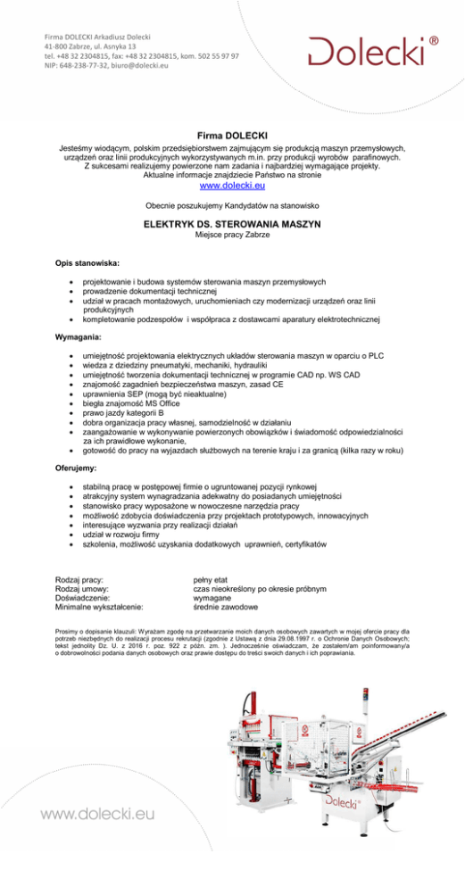 Firma DOLECKI Jesteśmy wiodącym, polskim przedsiębiorstwem zajmującym się produkcją maszyn przemysłowych, urządzeń oraz linii produkcyjnych wykorzystywanych m.in. przy produkcji wyrobów parafinowych. Z sukcesami realizujemy powierzone nam zadania i najbardziej wymagające projekty. Aktualne informacje znajdziecie Państwo na stronie www.dolecki.eu Obecnie poszukujemy Kandydatów na stanowisko ELEKTRYK DS. STEROWANIA MASZYN Miejsce pracy Zabrze Opis stanowiska: projektowanie i budowa systemów sterowania maszyn przemysłowych prowadzenie dokumentacji technicznej udział w pracach montażowych, uruchomieniach czy modernizacji urządzeń oraz linii produkcyjnych kompletowanie podzespołów i współpraca z dostawcami aparatury elektrotechnicznej Wymagania: umiejętność projektowania elektrycznych układów sterowania maszyn w oparciu o PLC wiedza z dziedziny pneumatyki, mechaniki, hydrauliki umiejętność tworzenia dokumentacji technicznej w programie CAD np. WS CAD znajomość zagadnień bezpieczeństwa maszyn, zasad CE uprawnienia SEP (mogą być nieaktualne) biegła znajomość MS Office prawo jazdy kategorii B dobra organizacja pracy własnej, samodzielność w działaniu zaangażowanie w wykonywanie powierzonych obowiązków i świadomość odpowiedzialności za ich prawidłowe wykonanie, gotowość do pracy na wyjazdach służbowych na terenie kraju i za granicą (kilka razy w roku) Oferujemy: stabilną pracę w postępowej firmie o ugruntowanej pozycji rynkowej atrakcyjny system wynagradzania adekwatny do posiadanych umiejętności stanowisko pracy wyposażone w nowoczesne narzędzia pracy możliwość zdobycia doświadczenia przy projektach prototypowych, innowacyjnych interesujące wyzwania przy realizacji działań udział w rozwoju firmy szkolenia, możliwość uzyskania dodatkowych uprawnień, certyfikatów Rodzaj pracy: Rodzaj umowy: Doświadczenie: Minimalne wykształcenie: pełny etat czas nieokreślony po okresie próbnym wymagane średnie zawodowe Prosimy o dopisanie klauzuli: Wyrażam zgodę na przetwarzanie moich danych osobowych zawartych w mojej ofercie pracy dla potrzeb niezbędnych do realizacji procesu rekrutacji (zgodnie z Ustawą z dnia 29.08.1997 r. o Ochronie Danych Osobowych; tekst jednolity Dz. U. z 2016 r. poz. 922 z późn. zm. ). Jednocześnie oświadczam, że zostałem/am poinformowany/a o dobrowolności podania danych osobowych oraz prawie dostępu do treści swoich danych i ich poprawiania.