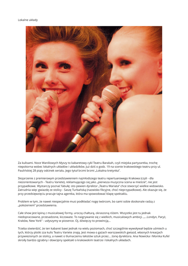 Lokalne układy Za kulisami. Noce Waniliowych Myszy to kabaretowy cykl Teatru Barakah, czyli miejska partyzantka, trochę niepokorna wobec lokalnych układów i układzików. Już dziś o godz. 19 na scenie krakowskiego teatru przy ul. Paulińskiej 28 piąty odcinek serialu. Jego tytuł brzmi brzmi „Lokalna kretynka”. Skojarzenie z premierowym przedstawieniem najmłodszego teatru repertuarowego Krakowa (czyli - dla niezorientowanych - Teatru Variete), reklamującego się jako „pierwsza muzyczna scena w mieście”, nie jest przypadkowe. Wystarczy poznać fabułę: oto pewien dyrektor „Teatru Wariata” chce stworzyć wielkie widowisko. Zatrudnia więc gwiazdę ze stolicy - Saszę Turbańską (nazwisko fikcyjne, choć nieprzypadkowe). Ale okazuje się, że przy przedsięwzięciu pracuje tajna agentka, która ma spowodować klapę spektaklu. Problem w tym, że nawet niespecjalnie musi podkładać nogę twórcom, bo sami sobie doskonale radzą z „położeniem” przedstawienia. Całe show jest kpiną z musicalowej formy, uroczą chałturą, okraszoną różem. Wszystko jest tu jednak niedopracowane, przesadzone, kiczowate. To naigrywanie się z wielkich, musicalowych ambicji. „…Londyn, Paryż, Kraków, New York” - usłyszymy w piosence. Oj, dźwięczy to prowincją... Trzeba stwierdzić, że ten kabaret bawi jednak na wielu poziomach, choć szczególnie wywoływał będzie uśmiech u tych, którzy plotki zza kulis Teatru Variete znają. Jest mowa o gażach warszawskich gwiazd, własnych kreacjach przywiezionych ze stolicy, a nawet o tłumaczeniu tekstów sztuk przez... żonę dyrektora. Ana Nowicka i Monika Kufel skroiły bardzo zgrabny i dowcipny spektakl o krakowskim teatrze i lokalnych układach.