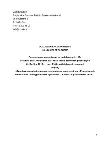 Zamawiający Regionalne Centrum Polityki Społecznej w Łodzi ul. Snycerska 8 91-302 Łódź Tel: 42 203 48 00 [email protected] OGŁOSZENIE O ZAMÓWIENIU NA USŁUGI SPOŁECZNE Postępowanie prowadzone na podstawie art. 138o ustawy z dnia 29 stycznia 2004 roku Prawo zamówień publicznych (tj. Dz. U. z 2015 r. , poz. 2164 z późniejszymi zmianami) dotyczy „Świadczenia usługi restauracyjnej podczas konferencji pn. „Projektowanie uniwersalne - Dostępność bez ograniczeń”, w dniu 19 października 2016 r.” 1 Nr sprawy: 1/US/2016 1. NAZWA (FIRMA) ORAZ ADRES ZAMAWIĄCJEGO Regionalne Centrum Polityki Społecznej w Łodzi ul. Snycerska 8 91-302 Łódź NIP 725-17-38-043 tel. 42 203 48 00 fax.42 203 48 17 2. OPIS PRZEDMIOTU ZAMÓWIENIA I. Przedmiot zamówienia: „Świadczenia usługi restauracyjnej podczas konferencji pn. „Projektowanie uniwersalne - Dostępność bez ograniczeń”, w dniu 19 października 2016 r.”. II. Kody CPV 55300000-3 Usługi restauracyjne i dotyczące podawania posiłków 55520000-1 Usługi dostarczania posiłków III. Szczegółowy opis przedmiotu zamówienia: W ramach świadczonej usługi, Wykonawca ma obowiązek zapewnić: 1) przygotowanie, dowóz i podanie posiłków w dniu konferencji, tj. 19 października 2016 r., 2) potrawy określone w menu dla 260 osób, w tym stały serwis kawowy i serwis gastronomiczny; Zamawiający poinformuje Wykonawcę najpóźniej na 5 dni przed planowanym terminem konferencji o ostatecznej liczbie uczestników, z zastrzeżeniem możliwości skrócenia tego okresu za obustronną zgodą, 3) ustawienie stołów: - stołu w formie szwedzkiego bufetu na korytarzu przed wejściem do sali konferencyjnej na poziomie „B -1” w sposób umożliwiający uczestnikom konferencji swobodny dostęp do ułożonych na nim posiłków, w trakcie serwisu kawowego oraz poczęstunku I i poczęstunku II, - stołu w formie szwedzkiego bufetu na korytarzu przed wejściem do sali konferencyjnej na poziomie „B 0” w sposób umożliwiający uczestnikom konferencji swobodny dostęp do ułożonych na nim posiłków, w trakcie poczęstunku III, - po 2 stoły dla osób niepełnosprawnych poruszających się na wózkach inwalidzkich na obydwóch poziomach, - 5 stołów koktajlowych o wysokości co najmniej 110 cm na poziomie „B -1” i 10 stołów koktajlowych o wysokości co najmniej 110 cm na poziomie „B 0” 4) nakrycie stołów obrusami materiałowymi, czystymi i wyprasowanymi, 5) świadczenie usługi restauracyjnej na zastawie ceramicznej i szklanej, z użyciem sztućców platerowych, serwetek papierowych, 6) zastawy dla każdego uczestnika konferencji, bez cech znacznego zużycia, pęknięć, uszczerbków itp., 7) obsługę kelnerską przez cały czas trwania konferencji, która będzie wyglądać estetycznie, czysto i schludnie, 2 8) sprzątanie stołów i zastawy przez czas trwania konferencji i po jej zakończeniu (wraz z resztkami pokonsumpcyjnymi), 9) przywrócenie do stanu pierwotnego miejsca świadczenia usługi najpóźniej w ciągu 1,5 godziny po zakończeniu poczęstunku III, 10) świadczenie usługi restauracyjnej, wyłącznie przy użyciu produktów spełniających normy jakości produktów spożywczych, 11) przestrzeganie przepisów prawnych w zakresie przechowywania i przygotowania artykułów spożywczych (m.in. ustawy z dnia 25 sierpnia 2006 roku o bezpieczeństwie żywności i żywienia tj. z 2010 roku Dz. U. nr 136 poz. 914 ze zm.), 12) dostarczenie posiłków w miejsce wskazane przez Zamawiającego w dniu konferencji najpóźniej: - o godzinie 9.00 - serwis kawowy i poczęstunek I, - o godzinie 12.00 - poczęstunek II, - o godzinie 15.20 - poczęstunek III, 13) posiłki w formie dania na ciepło muszą być gorące, gotowe do spożycia, 14) dania płynne ciepłe muszą być podane w kociołku utrzymującym stałe ciepło, 15) dania ciepłe muszą być podane w bemarach z podgrzewaczami, spełniających wymogi przeciw pożarowe, 16) estetyczne podawanie posiłków, 17) serwis kawowy, poczęstunek I, poczęstunek II i poczęstunek III zostaną podane zgodnie z wybraną przez Zamawiającego aranżacją, która została przedstawiona na fotografiach załączonych do formularza ofertowego Wykonawcy. Szczegółowe informacje dotyczące menu: 1) Serwis kawowy w systemie ciągłym - na korytarzu przed wejściem do sali konferencyjnej na poziomie „B -1” - od godziny 9.00 - dla maksymalnie 260 osób, w formie bufetu szwedzkiego w ramach serwisu kawowego uczestnikom konferencji zostanie zapewniony nieograniczony dostęp do: - wody mineralnej niegazowanej w dzbankach - kawy mielonej i rozpuszczalnej - herbaty w saszetkach - 3 rodzaje zielona, czarna, owocowa - cukru - śmietanki do kawy - cytryny 2) Poczęstunek I - w godz. 09.00 – 10.00 - na korytarzu przed wejściem do sali konferencyjnej na poziomie „B -1” - dla maksymalnie 260 osób, w formie bufetu szwedzkiego - ciastka podane na półmiskach/paterach - owoce w plastrach podane na półmiskach/paterach w ramach poczęstunku I uczestnikom konferencji zostaną zapewnione: - rogalik z nadzieniem owocowym – 1 szt. - mini pączek jogurtowy/serowy – 1 szt. - rożek francuski z nadzieniem serowym – 1 szt. - 2 rodzaje ciastek kruchych, w tym 1 rodzaj kakaowe – 50 g/os. - melon – co najmniej 50 g/os. - banany – co najmniej 500 g/os. - pomarańcze/mandarynki – co najmniej 40 g/os. - winogrona – co najmniej 40 g/os. 3 3) Poczęstunek II - w godz. 12.15 – 12.45 - na korytarzu przed wejściem do sali konferencyjnej na poziomie „B -1” - dla maksymalnie 260 osób, w formie bufetu szwedzkiego - ciasta w papierowych papilotkach podane na półmiskach/paterach - ciastka i ciasta podane na półmiskach/paterach - soki podane w dzbankach - owoce w plastrach podane na półmiskach/paterach w ramach poczęstunku II uczestnikom konferencji zostaną zapewnione: - sok pomarańczowy 100% w dzbankach – co najmniej 200ml/os. - sok grejpfrutowy 100% w dzbankach – co najmn