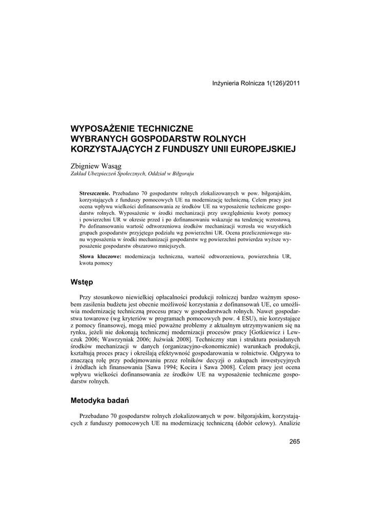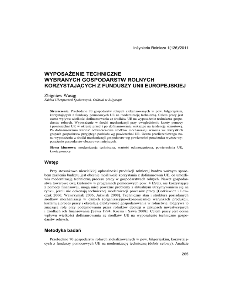 Inżynieria Rolnicza 1(126)/2011 WYPOSAŻENIE TECHNICZNE WYBRANYCH GOSPODARSTW ROLNYCH KORZYSTAJĄCYCH Z FUNDUSZY UNII EUROPEJSKIEJ Zbigniew Wasąg Zakład Ubezpieczeń Społecznych, Oddział w Biłgoraju Streszczenie. Przebadano 70 gospodarstw rolnych zlokalizowanych w pow. biłgorajskim, korzystających z funduszy pomocowych UE na modernizację techniczną. Celem pracy jest ocena wpływu wielkości dofinansowania ze środków UE na wyposażenie techniczne gospodarstw rolnych. Wyposażenie w środki mechanizacji przy uwzględnieniu kwoty pomocy i powierzchni UR w okresie przed i po dofinansowaniu wskazuje na tendencję wzrostową. Po dofinansowaniu wartość odtworzeniowa środków mechanizacji wzrosła we wszystkich grupach gospodarstw przyjętego podziału wg powierzchni UR. Ocena przeliczeniowego stanu wyposażenia w środki mechanizacji gospodarstw wg powierzchni potwierdza wyższe wyposażenie gospodarstw obszarowo mniejszych. Słowa kluczowe: modernizacja techniczna, wartość odtworzeniowa, powierzchnia UR, kwota pomocy Wstęp Przy stosunkowo niewielkiej opłacalności produkcji rolniczej bardzo ważnym sposobem zasilenia budżetu jest obecnie możliwość korzystania z dofinansowań UE, co umożliwia modernizację techniczną procesu pracy w gospodarstwach rolnych. Nawet gospodarstwa towarowe (wg kryteriów w programach pomocowych pow. 4 ESU), nie korzystające z pomocy finansowej, mogą mieć poważne problemy z aktualnym utrzymywaniem się na rynku, jeżeli nie dokonają technicznej modernizacji procesów pracy [Gotkiewicz i Lewczuk 2006; Wawrzyniak 2006; Juźwiak 2008]. Techniczny stan i struktura posiadanych środków mechanizacji w danych (organizacyjno-ekonomicznie) warunkach produkcji, kształtują proces pracy i określają efektywność gospodarowania w rolnictwie. Odgrywa to znaczącą rolę przy podejmowaniu przez rolników decyzji o zakupach inwestycyjnych i źródłach ich finansowania [Sawa 1994; Kocira i Sawa 2008]. Celem pracy jest ocena wpływu wielkości dofinansowania ze środków UE na wyposażenie techniczne gospodarstw rolnych. Metodyka badań Przebadano 70 gospodarstw rolnych zlokalizowanych w pow. biłgorajskim, korzystających z funduszy pomocowych UE na modernizację techniczną (dobór celowy). Analizie 265 Zbigniew Wasąg poddano wnioski inwestycyjne o przyznanie środków finansowych złożone przez rolników do Agencji Restrukturyzacji i Modernizacji Rolnictwa w latach 2004–2009 [Plan… 2004; Sektorowy… 2004; Program… 2007]. Do oceny stanu techniki rolniczej badaną zbiorowość gospodarstw podzielono wg kryterium kwoty pomocy i powierzchni UR. Przedstawiono dane empiryczne zrealizowanych przedsięwzięć, dotyczące technicznego wyposażenia gospodarstw w ważniejsze maszyny i urządzenia w roku bazowym (przed dofinansowaniem) i docelowym (po dofinansowaniu). Odtworzeniową wartość środków technicznych wyliczono wg cen z 2009 r. Wskaźniki wyposażenia zestawiono jako: wskaźniki technicznego uzbrojenia gospodarstw (szt.·100 gosp.-1) oraz wskaźniki technicznego uzbrojenia ziemi (szt.·100 ha-1) UR. Wyniki badań Badane gospodarstwa znacząco zwiększyły wyposażenie w środki techniczne (tab. 1), a w ich strukturze najbardziej istotne zmiany nastąpiły w liczbie ciągników – ogółem wzrost wskaźników technicznego uzbrojenia gospodarstwa o 53% i technicznego uzbrojenia ziemi o 46%. Bardzo duży wzrost odnotowano ciągników o mocy pow. 50 kW, odpowiednio: o 116 i 172%. Liczba ciągników w badanych gospodarstwach w przeliczeniu na 100 ha UR i 100 gospodarstw wyniosła 12,6 i 197,1. W okresie badań nastąpiło znaczące zwiększenie liczby urządzeń, wyrażonych w szt.·100 ha-1 UR, do przeładunku (o 63%) i przygotowania pasz (o 67%) oraz maszyn uprawowych (o 16%) i opryskiwaczy (o 33%). Odnotowano także wzrost o 33% liczby kombajnów do porzeczek. Wyposażenie gospodarstw w środki mechanizacji przy uwzględnieniu kwoty pomocy (tab. 2) w okresie przed i po dofinansowaniu wskazuje na tendencję wzrostową. Najwyższy poziom występuje w grupie o kwocie pomocy do 50 tys. zł i 50–100 tys. zł, w liczbie maszyn i narzędzi uprawowych, odpowiednio: 42,2 i 36,0 szt.·100 ha-1 UR oraz ciągników ogółem 16,1 i 15,2 szt.·100 ha-1 UR. Znaczący jest również w tych grupach udział odpowiednio: przyczep ciągnikowych 9,4 i 9,2 szt.·100 ha-1 UR oraz opryskiwaczy 11,5 i 7,2 szt.·100 ha-1 UR. Gospodarstwa mniejsze obszarowo i jednocześnie uzyskujące niższe kwoty pomocy (do 50 tys. zł) w stosunku do tych o kwocie pomocy powyżej 150 tys. zł, posiadają wyższe wskaźniki technicznego uzbrojenia ziemi – ciągniki oraz maszyny uprawowe, odpowiednio: 16,1 i 4,4 oraz 42,2 i 8,2 szt.·100 ha-1 UR. Największe zmiany wyposażenia gospodarstw w środki mechanizacji w roku docelowym w stosunku do roku bazowego odnotowano w grupie gospodarstw o kwocie pomocy 100–150 tys. zł (liczba ciągników o mocy pow. 50 kW na 100 ha UR wzrosła o 1141%). Gospodarstwa obszarowo mniejsze posiadają wyższe wyposażenie w środki mechanizacji (tab. 3) – ciągniki oraz maszyny uprawowe odpowiednio: 27,4 i 65,9 szt.·100 ha-1 UR. Gospodarstwa o powierzchni do 10 i 10–30 ha UR wielokrotnie przewyższają te większe w danych grupach. Może to świadczyć o utrzymywaniu się tendencji w kierunku nieracjonalnego wykorzystania posiadanego sprzętu oraz generowania kosztów utrzymania i użytkowania. 266 Wyposażenie techniczne... 267 Zbigniew Wasąg 268 Wyposażenie techniczne... Tabela 3. Wyposażenie gospodarstw w ciągniki i ważniejsze maszyny rolnicze przy uwzględnieniu powierzchni gospodarstw Table 3. Provision of farms with tractors and more important farm machines taking into account the farm size Wyposażenie w środki mechanizacji rolnictwa [szt.·100 ha-1 UR] gospodarstw o powierzchni [ha UR] Wyszczególnienie < 10 10–30 30– 50 50– 70 > 70 r.b. r.d. r.b. r.d. r.b. r.d. r.b. r.d. r.b. r.d. Ciągniki ogółem 16,5 27,4 9,0 12,5 3
