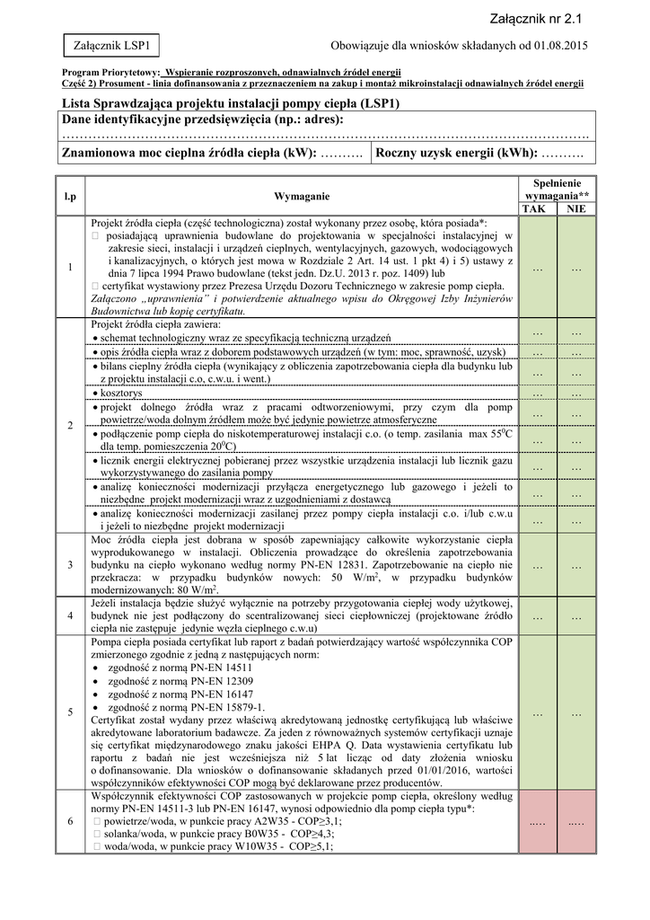 Załącznik nr 2.1 Załącznik LSP1 Obowiązuje dla wniosków składanych od 01.08.2015 Program Priorytetowy: Wspieranie rozproszonych, odnawialnych źródeł energii Część 2) Prosument - linia dofinansowania z przeznaczeniem na zakup i montaż mikroinstalacji odnawialnych źródeł energii Lista Sprawdzająca projektu instalacji pompy ciepła (LSP1) Dane identyfikacyjne przedsięwzięcia (np.: adres): …………………………………………………………………………………………………………. Znamionowa moc cieplna źródła ciepła (kW): ………. Roczny uzysk energii (kWh): ………. l.p 1 2 3 4 5 6 Wymaganie Projekt źródła ciepła (część technologiczna) został wykonany przez osobę, która posiada*: posiadającą uprawnienia budowlane do projektowania w specjalności instalacyjnej w zakresie sieci, instalacji i urządzeń cieplnych, wentylacyjnych, gazowych, wodociągowych i kanalizacyjnych, o których jest mowa w Rozdziale 2 Art. 14 ust. 1 pkt 4) i 5) ustawy z dnia 7 lipca 1994 Prawo budowlane (tekst jedn. Dz.U. 2013 r. poz. 1409) lub certyfikat wystawiony przez Prezesa Urzędu Dozoru Technicznego w zakresie pomp ciepła. Załączono „uprawnienia” i potwierdzenie aktualnego wpisu do Okręgowej Izby Inżynierów Budownictwa lub kopię certyfikatu. Projekt źródła ciepła zawiera: • schemat technologiczny wraz ze specyfikacją techniczną urządzeń • opis źródła ciepła wraz z doborem podstawowych urządzeń (w tym: moc, sprawność, uzysk) • bilans cieplny źródła ciepła (wynikający z obliczenia zapotrzebowania ciepła dla budynku lub z projektu instalacji c.o, c.w.u. i went.) • kosztorys • projekt dolnego źródła wraz z pracami odtworzeniowymi, przy czym dla pomp powietrze/woda dolnym źródłem może być jedynie powietrze atmosferyczne • podłączenie pomp ciepła do niskotemperaturowej instalacji c.o. (o temp. zasilania max 550C dla temp. pomieszczenia 200C) • licznik energii elektrycznej pobieranej przez wszystkie urządzenia instalacji lub licznik gazu wykorzystywanego do zasilania pompy • analizę konieczności modernizacji przyłącza energetycznego lub gazowego i jeżeli to niezbędne projekt modernizacji wraz z uzgodnieniami z dostawcą • analizę konieczności modernizacji zasilanej przez pompy ciepła instalacji c.o. i/lub c.w.u i jeżeli to niezbędne projekt modernizacji Moc źródła ciepła jest dobrana w sposób zapewniający całkowite wykorzystanie ciepła wyprodukowanego w instalacji. Obliczenia prowadzące do określenia zapotrzebowania budynku na ciepło wykonano według normy PN-EN 12831. Zapotrzebowanie na ciepło nie przekracza: w przypadku budynków nowych: 50 W/m2, w przypadku budynków modernizowanych: 80 W/m2. Jeżeli instalacja będzie służyć wyłącznie na potrzeby przygotowania ciepłej wody użytkowej, budynek nie jest podłączony do scentralizowanej sieci ciepłowniczej (projektowane źródło ciepła nie zastępuje jedynie węzła cieplnego c.w.u) Pompa ciepła posiada certyfikat lub raport z badań potwierdzający wartość współczynnika COP zmierzonego zgodnie z jedną z następujących norm: • zgodność z normą PN-EN 14511 • zgodność z normą PN-EN 12309 • zgodność z normą PN-EN 16147 • zgodność z normą PN-EN 15879-1. Certyfikat został wydany przez właściwą akredytowaną jednostkę certyfikującą lub właściwe akredytowane laboratorium badawcze. Za jeden z równoważnych systemów certyfikacji uznaje się certyfikat międzynarodowego znaku jakości EHPA Q. Data wystawienia certyfikatu lub raportu z badań nie jest wcześniejsza niż 5 lat licząc od daty złożenia wniosku o dofinansowanie. Dla wniosków o dofinansowanie składanych przed 01/01/2016, wartości współczynników efektywności COP mogą być deklarowane przez producentów. Współczynnik efektywności COP zastosowanych w projekcie pomp ciepła, określony według normy PN-EN 14511-3 lub PN-EN 16147, wynosi odpowiednio dla pomp ciepła typu*: powietrze/woda, w punkcie pracy A2W35 - COP≥3,1; solanka/woda, w punkcie pracy B0W35 - COP≥4,3; woda/woda, w punkcie pracy W10W35 - COP≥5,1; Spełnienie wymagania** TAK NIE … … … … … … … … … … … … … … … … … … … … … … … … … … ..… ..… Obowiązuje dla wniosków składanych od 01.08.2015 bezpośrednie odparowanie w gruncie/woda, w punkcie pracy E4W35 - COP≥4,3, powietrze/woda przeznaczone wyłącznie do c.w.u, w punkcie pracy A15W10-55 - COP≥2,9 Sezonowy wskaźnik efektywności energetycznej instalacji SCOP, liczony zgodnie z międzynarodowym standardem VDI4650 (do 01/01/2016) lub normą PN-EN 14825 lub PN-EN 12309-2 (od 01/01/2016), wynosi dla pomp ciepła*: typu powietrze/woda dla potrzeb c.o. i c.w.u., zasilanych energią elektryczną - SCOP≥3,3; 7 ..… pozostałych dla potrzeb c.o. i c.w.u., zasilanych energią elektryczną - SCOP≥3,8; zasilanych gazem - SCOP≥1,25. Osiągnięcie wymaganej wartości SCOP zostało potwierdzone obliczeniami lub komputerowymi programami symulacyjnymi. Jednostkowy koszt kwalifikowany projektowanej instalacji nie przekracza*: dla pomp ciepła typu powietrze/woda dla potrzeb c.o. i c.w.u.: 3 000 zł/kW dla pomp ciepła typu powietrze/woda przeznaczonych wyłącznie dla potrzeb c.w.u. z zasobnikami c.w.u. zintegrowanymi lub osobnymi o pojemności czynnej od 150 do 250 8 litrów: 5 000 zł ..… dla pomp ciepła typu powietrze/woda przeznaczonych wyłącznie dla potrzeb c.w.u. z zasobnikami c.w.u. zintegrowanymi lub osobnymi o pojemności czynnej > 250 litrów: 8 000 zł. dla pozostałych pomp ciepła dla potrzeb c.o. i c.w.u.: 5 500 zł/kW W zakres kosztów kwalifikowanych projektowanej instalacji wchodzą wyłącznie roboty i 9 … zakupy wymienione w ust. II pkt. 2 załącznika do programu „Wymagania techniczne”. Uwaga! Aby projekt instalacji spełniał wymagania programu „Prosument” w żadnym z ww. punktów nie być zaznaczona odpowi
