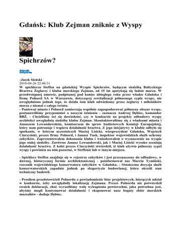 Gdańsk: Klub Zejman zniknie z Wyspy Spichrzów? //Jacek Sieński 2010-04-26 22:48:31 W spichlerzu Steffen na gdańskiej Wyspie Spichrzów, będącym siedzibą Bałtyckiego Bractwa Żeglarzy i klubu morskiego Zejman, od 15 lat spotykają się ludzie morza. W przedwstępnej umowie, podpisanej pod koniec ubiegłego roku przez władze Gdańska i firmę Polnord SA w Warszawie, dotyczącej rewitalizacji północnego cypla wyspy, nie uwzględniono jednak tego, że działa tam klub odwiedzany przez żeglarzy i miłośników morza z niemal z całego świata. - Ponieważ miasto i Polnord zamierzają wspólnie zagospodarować północny obszar wyspy, postanowiliśmy przypomnieć o naszym istnieniu - zaznacza Andrzej Dębiec, komandor BBŻ. - Chcieliśmy też się dowiedzieć, czy w konkursie na projekty odbudowy wyspy architekci uwzględnią siedzibę klubu Zejman. Skontaktowaliśmy się z władzami miasta i Januszem Lewandowskim, komisarzem do spraw budżetowych Komisji Europejskiej, który nam patronuje i wspiera działalność bractwa. Z jego inicjatywy w klubie odbyło się spotkanie, w którym uczestniczyli Maciej Lisicki, wiceprezydent Gdańska, Wojciech Ciurzyński, prezes firmy Polnord, i Janusz Tusk, inspektor wojewódzkich służb ochrony zabytków. Zaprezentowałem dokonania klubu i wnioskowałem o wyznaczenie na wyspie jego stałej siedziby. Zarówno Janusz Lewandowski, jak i Maciej Lisicki wysoko oceniają działalność bractwa. Z kolei prezes Ciurzyński stwierdził, iż klub ożywia północny cypel wyspy i powinien na nim pozostać, w Steffenie lub w innym miejscu. - Spichlerz Steffen znajduje się w rejestrze zabytków i jest przeznaczony do odbudowy, w dawnej, historycznej formie architektonicznej - poinformował nas Marcin Tymiński, rzecznik wojewódzkiego konserwatora zabytków w Gdańsku. - Ostateczna decyzja służb konserwatorskich zapadnie jednak po ekspertyzie budowlanej, która określi stan techniczny budowli. - Prosiłem przedstawicieli Polnordu o powiadomienie biur projektowych, biorących udział w konkursie, żeby uwzględniły lokalizację Zejmana. Prezes Polnordu nie potwierdził swoich deklaracji, choć wyraziliśmy wolę wykupienia powierzchni, jaka potrzebna jest, abyśmy mogli kontynuować działalność i eksponować nasz bogaty zbiór morskich muzealiów - dodaje Dębiec.