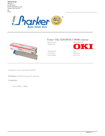 Marker4U.pl Boczna 5 62-800 Kalisz [email protected] Telefon: 884-760-760 gg: skype: Toner Oki 42918916 C9600 czarny Kod towaru: Producent: OKI42918916 Dostępność: Cena netto: Cena brutto: 24h 670.99 zł 825.32 zł Oryginalny czarny toner Oki 42918916 Wydajność: 15.000 stron przy 5% pokryciu Urządzenia: Oki C9600 , C9800 strona 1 / 1 Powered by TCPDF (www.tcpdf.org)