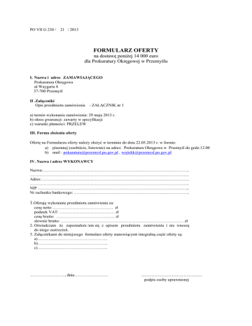 PO VII G 230 / 21 / 2013 FORMULARZ OFERTY na dostawę poniżej 14 000 euro dla Prokuratury Okręgowej w Przemyślu I. Nazwa i adres ZAMAWIAJĄCEGO Prokuratura Okręgowa ul Waygarta 8 37-700 Przemyśl II .Załączniki Opis przedmiotu zamówienia - ZAŁĄCZNIK nr 1 a) termin wykonania zamówienia: 29 maja 2013 r. b) okres gwarancji: zawarty w specyfikacji c) warunki płatności: PRZELEW III. Forma złożenia oferty Ofertę na Formularzu oferty należy złożyć w terminie do dnia 22.05.2013 r. w formie: a) pisemnej (osobiście, listownie) na adres: Prokuratura Okręgowa w Przemyśl do godz.12.00 b) mail : [email protected] , [email protected] IV. Nazwa i adres WYKONAWCY Nazwa:………………………………………………………………………………………….. ………………………………………………………………………………………………….. Adres:…………………………………………………………………………………………… ………………………………………………………………………………………………….. NIP ……………………………………………………………………………………………... Nr rachunku bankowego: ………………………………………………………………………. 1.Oferuję wykonanie przedmiotu zamówienia za: cenę netto ……………………………………. zł podatek VAT: ………………………………… zł cenę brutto: …………………………………... zł słownie brutto: …………………………………………………………………………… zł 2. Oświadczam że zapoznałem /am się z opisem przedmiotu zamówienia i nie wnoszę do niego zastrzeżeń. 3. Załącznikami do niniejszego formularz oferty stanowiącymi integralną część oferty są: a)………………………………………….. b)………………………………………….. c)………………………………………….. ……………………., dnia…………………… ……………………………… podpis osoby uprawnionej ZAŁĄCZNIK nr 1 Lp 1 Nazwa / model Komputer Fujitsu Siemens P400 i5-3330 4GB 500GB IntelHD Graphics 2500 DVDSM W7P P/N:VFY:P0400PF191PL Ilość 18 2 MS Word 2013 32-bit/x64 Polish PKC P/N: 059-08336 18 3 Drukarka HP 1606 dn P/N: CE749A#B19 6 4 Drukarka HP M401 dn P/N: CF278A#B19 1 5 Kingston pamięć USB 2.0 8GB DT Locker+ G2 w/Automatic Data Security P/N: DTLPG2/8GB Cena jedn. brutto 47 6 Skaner Pustek Optic Pro ST640 P/N: PLUS-OP-ST640 2 7 Fine Reader 11 Pro PL P/N: FR-11-PRO 2 RAZEM BRUTTO: Wartość brutto Gwarancja