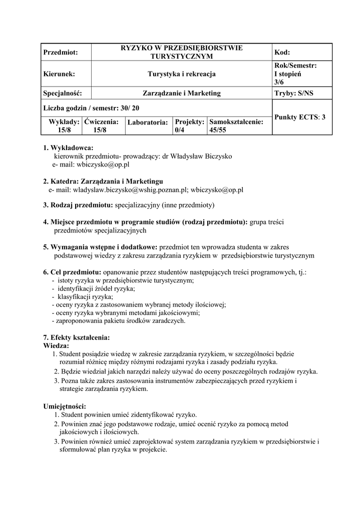 Przedmiot: RYZYKO W PRZEDSIĘBIORSTWIE TURYSTYCZNYM