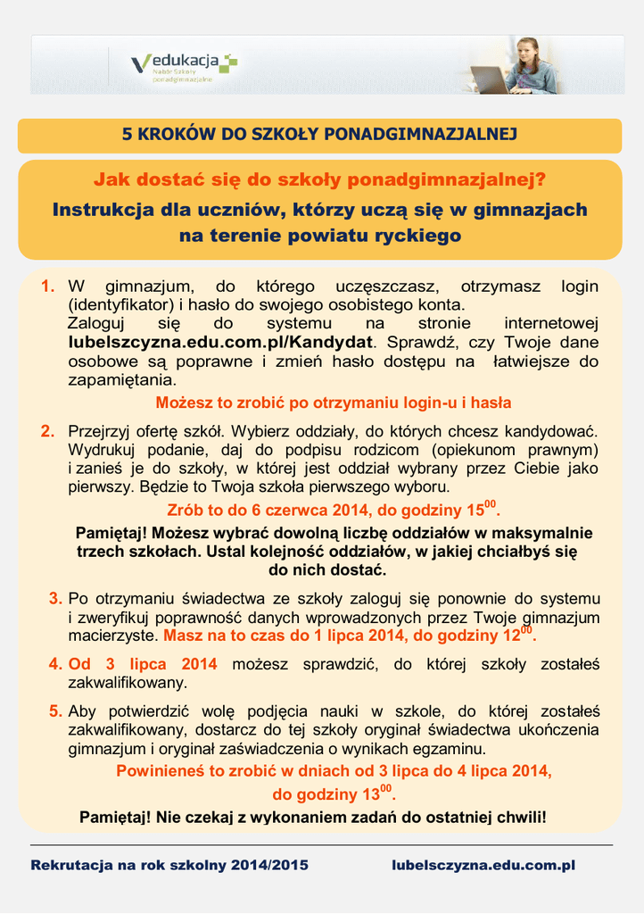 5 KROKÓW DO SZKOŁY PONADGIMNAZJALNEJ Jak dostać się do szkoły ponadgimnazjalnej? Instrukcja dla uczniów, którzy uczą się w gimnazjach na terenie powiatu ryckiego 1. W gimnazjum, do którego uczęszczasz, otrzymasz login (identyfikator) i hasło do swojego osobistego konta. Zaloguj się do systemu na stronie internetowej lubelszcyzna.edu.com.pl/Kandydat. Sprawdź, czy Twoje dane osobowe są poprawne i zmień hasło dostępu na łatwiejsze do zapamiętania. Możesz to zrobić po otrzymaniu login-u i hasła 2. Przejrzyj ofertę szkół. Wybierz oddziały, do których chcesz kandydować. Wydrukuj podanie, daj do podpisu rodzicom (opiekunom prawnym) i zanieś je do szkoły, w której jest oddział wybrany przez Ciebie jako pierwszy. Będzie to Twoja szkoła pierwszego wyboru. Zrób to do 6 czerwca 2014, do godziny 1500. Pamiętaj! Możesz wybrać dowolną liczbę oddziałów w maksymalnie trzech szkołach. Ustal kolejność oddziałów, w jakiej chciałbyś się do nich dostać. 3. Po otrzymaniu świadectwa ze szkoły zaloguj się ponownie do systemu i zweryfikuj poprawność danych wprowadzonych przez Twoje gimnazjum macierzyste. Masz na to czas do 1 lipca 2014, do godziny 1200. 4. Od 3 lipca 2014 możesz sprawdzić, do której szkoły zostałeś zakwalifikowany. 5. Aby potwierdzić wolę podjęcia nauki w szkole, do której zostałeś zakwalifikowany, dostarcz do tej szkoły oryginał świadectwa ukończenia gimnazjum i oryginał zaświadczenia o wynikach egzaminu. Powinieneś to zrobić w dniach od 3 lipca do 4 lipca 2014, do godziny 1300. Pamiętaj! Nie czekaj z wykonaniem zadań do ostatniej chwili! …to wszystko! Powodzenia! Rekrutacja na rok szkolny 2014/2015 lubelsczyzna.edu.com.pl