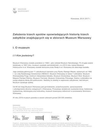 Warszawa, 20.01.2017 r. Założenia trzech spotów opowiadających historię trzech zabytków znajdujących się w zbiorach Muzeum Warszawy I. O muzeum I.1 Kim jesteśmy? Muzeum Warszawy zostało powołane w 1936 r. jako oddział Muzeum Narodowego. Po drugiej wojnie światowej, w 1947 roku, muzeum uzyskało samodzielność, a w 2014 roku nazwa Muzeum Historyczne m.st. Warszawy została skrócona przez Radę m.st. Warszawy do obecnego kształtu. Jego siedzibą główną jest 11 zabytkowych kamienic przy Rynku Starego Miasta, wpisanych od 1980 r. na Listę Światowego Dziedzictwa UNESCO. Muzeum Warszawy to także 7 oddziałów: Muzeum Warszawskiej Pragi, Centrum Interpretacji Zabytku, Muzeum Drukarstwa, Muzeum Woli, Muzeum – Miejsce Pamięci Palmiry, Muzeum Farmacji, Muzeum Ordynariatu Polowego. Każdy z oddziałów ma swoją odrębną ofertę dla publiczności. Siedziby to obiekty w większości zabytkowe, nad którymi Muzeum sprawuje opiekę. Od 80 lat misją Muzeum Warszawy jest gromadzenie, przechowywanie, opracowywanie i udostępnianie zbiorów związanych z Warszawą. Prowadząc działalność wystawienniczą, badawczą, wydawniczą, edukacyjną oraz kulturalną, muzeum towarzyszy odbiorcom w poznawaniu fenomenu Warszawy. W roku 2016 muzeum posiada w swoich zbiorach ponad 230 000 obiektów. Muzeum Warszawy Rynek Starego Miasta 28-42, 00-272 Warszawa tel. (+48) 22 635 16 25 / fax (+48) 22 831 94 91 www.muzeumwarszawy.pl / [email protected] Projekt pn. „Modernizacja, konserwacja oraz digitalizacja obiektów zabytkowych siedziby głównej Muzeum Warszawy przy Rynku Starego Miasta w Warszawie”, realizowany w ramach Programu „Konserwacja i rewitalizacja dziedzictwa kulturowego”. Wsparcie udzielone z funduszy norweskich i funduszy EOG, pochodzących z Islandii, Liechtensteinu i Norwegii, oraz środków krajowych. I.2 Sytuacja, w której jesteśmy Od 2014 r. trwa projekt OdNowa, obejmujący modernizację, konserwację i digitalizację obiektów zabytkowych siedziby głównej muzeum, a także realizację nowej wystawy głównej. Uroczyste otwarcie Muzeum Warszawy w nowej odsłonie nastąpi pod koniec maja 2017 r. Będzie to kluczowy dla nas moment, kiedy po latach niebytności przedstawimy się naszej publiczności niemal na nowo, z nową wystawą główną. Ze względu na trwające prace w siedzibie głównej i jej wyłączenie z życia kulturalnego ciężar programowy spoczął na oddziałach, z których kluczową rolę odgrywają Muzeum Warszawskiej Pragi, Centrum Interpretacji Zabytku, Muzeum Drukarstwa. Nad koncepcją i realizacją nowej wystawy głównej od trzech lat trwają intensywne prace zespołu kuratorów pod kierownictwem dr. Jarosława Trybusia, Zastępcy Dyrektora ds. Merytorycznych. Trwają prace nad nową stroną internetową. Powinna ona zostać upubliczniona z końcem 2016 roku. I.3 Nowa identyfikacja wizualna muzeum Od 2014 roku naszym nowym znakiem graficznym jest Syrena, jak przystało na stołeczną instytucję. Autorką nowej identyfikacji wizualnej jest Ania Światłowska*, projektantka graficzna Muzeum Warszawy. Identyfikacja jest punktem wyjścia do projektu graficznego nowej strony. Założeniem identyfikacji było odzwierciedlenia zmian, przez które przechodzi muzeum w ramach odnawiania wizerunku i usprawniania sposobu działania. Chcemy żeby Muzeum Warszawy było miejscem, w którym historia naszego miasta spotyka się z jego przyszłością. Nowe logo Muzeum Warszawy jest połączeniem historycznego symbolu z nowoczesną szkołą projektowania graficznego. Herb Warszawy – pół-kobieta, pół-ryba z miejskich legend, syrenka z mieczem i tarczą – to znak powszechnie wykorzystywany, znak rozpoznawalny i kojarzony z Warszawą. W zbiorach Muzeum posiadamy blisko 400 rozmaitych warszawskich syrenek uwiecznionych w malarstwie, na fotografiach, numizmatach, syrenki-pomniki, przedstawienia zdobiące zabytkowe rzemiosło czy plany Warszawy, które stały się inspiracją dla projektantki. Muzeum Warszawy Rynek Starego Miasta 28-42, 00-272 Warszawa tel. (+48) 22 635 16 25 / fax (+48) 22 831 94 91 www.muzeumwarszawy.pl / [email protected] Projekt pn. „Modernizacja, konserwacja oraz digitalizacja obiektów zabytkowych siedziby głównej Muzeum Warszawy przy Rynku Starego Miasta w Warszawie”, realizowany w ramach Programu „Konserwacja i rewitalizacja dziedzictwa kulturowego”. Wsparcie udzielone z funduszy norweskich i funduszy EOG, pochodzących z Islandii, Liechtensteinu i Norwegii, oraz środków krajowych. Wybrany kolor nawiązuje do ciągu skojarzeń: Warszawa – Syrena – Wisła. Ciemny błękit jest kolorem, który gwarantuje Muzeum Warszawy odrębność wizerunkową, wyróżniając się wśród barw wykorzystywanych przez inne warszawskie instytucje: żółci, czerwieni czy czerni. Zastosowana w projekcie rodzina krojów pisma Good, autorstwa warszawskiego projektanta Łukasza Dziedzica, jest przejrzysta, przyjazna, neutralna. Krój nie nawiązuje do konkretnego okresu historycznego. Doskonale zachowuje spójność proporcji i kroju ze znakiem graficznym, stając się jego integralną częścią. * Dr Anna Światłowska - projektantka graficzna ze stopniem Doktora Sztuk Pięknych na Universidad Complutense w Madrycie, Resident Artist w School of Visual Arts w Nowym Jorku. Współzałożycielka warszawskiej Pracowni Sitodruku SITO. Od 2011 należy do Stowarzyszenia Twórców Grafiki Użytkowej (STGU). Specjalizuje się w identyfikacji i komunikacji wizualnej, zwłaszcza w obszarze kultury. Współpracowała z licznymi markami, agencjami i instytucjami (m.in. Jagermeister, Ministerstwo Kultury i Dziedzictwa Narodowego, Red Bull Spain, TVE Televisión Española, Muzeum Narodowe w Warszawie, Muzeum Sztuki Nowoczesnej, Teatr Wielki – Opera Narodowa). Od 2013 roku związana jest z Muzeum Warszawy, dla którego stworzyła nową identyfikację wizualną – projekt wyróżniony I miejscem w kategorii Grafiki Użytkowej w konkursie Dobry Wzór 20