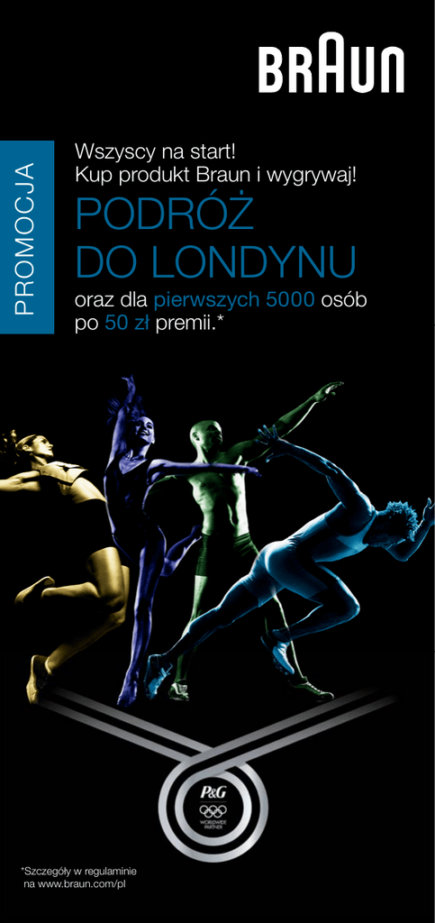 PROMOCJA Wszyscy na start! Kup produkt Braun i wygrywaj! PODRÓŻ DO LONDYNU oraz dla pierwszych 5000 osób po 50 zł premii.* *Szczegóły w regulaminie na www.braun.com/pl Kup produkt Braun i wygrywaj! Premia o wartości 50 zł dla każdego z 5000 pierwszych zgłoszeń. Nagroda Główna - podróż do Londynu. 1. Konkurs rozpoczyna się wraz z dniem 16.07.2012 r. i kończy z dniem 31.08.2012 r. 2. Do udziału w Konkursie upoważnia zakup jednego z produktów marki Braun za kwotę minimum 150 zł brutto, zwanych dalej: „Produktami Promocyjnymi”. 3. Aby wziąć udział w Konkursie Uczestnik zobowiązany jest w terminie do 7 dni kalendarzowych od daty zakupu Produktu Promocyjnego zgodnie z wymogami regulaminu wysłać listem poleconym na adres Avanti Agencja Reklamowa, ul. Reymonta 4A, 05-070 Sulejówek zgłoszenia do Konkursu zawierające: - dowód zakupu Produktu Promocyjnego w postaci oryginału paragonu fiskalnego albo kopii faktury VAT, - kod kreskowy wycięty z opakowania zakupionego na podstawie załączonego dowodu zakupu Produktu Promocyjnego, - dane osobowe i numer konta bankowego wyszczególnione na poniższym formularzu uczestnictwa w Konkursie, - wykonane Zadanie Konkursowe. Zadanie Konkursowe polega na uzupełnieniu w kreatywny, ciekawy i trafny sposób zdania „Produkty Braun, to produkty mistrzowskie ponieważ...”. 4. O przyznaniu Nagrody I Stopnia w postaci premii 50 zł decyduje kolejność wpłynięcia zgłoszeń do Organizatora. Zwycięzcę Nagrody Głównej wybierze Komisja Konkursowa. 5. Uczestnicy Konkursu mogą kontaktować się z Organizatorem w celu uzyskania informacji o Konkursie: - telefon: 22 783 03 70 (w godzinach 9.00 – 16.00) - droga elektroniczna: [email protected] Formularz uczestnictwa w Konkursie „BRAUN OLYMPICS” Pola oznaczone gwiazdką * są obowiązkowe. Prosimy o czytelne wypełnienie DRUKOWANYMI literami. Dane kontaktowe Uczestnika: Imię i nazwisko:*………………………………………………………….............................……………… Ulica, numer budynku i mieszkania:*……………………………………..........…………………………… Kod pocztowy:*…………….....…. Miejscowość:*…………………………..................................……… Telefon kontaktowy:*…………………………… E-mail:*…………………………………......…………… Nazwa i model zakupionego w związku z udziałem w Konkursie produktu Braun:* ……………………………………………………………………………………………......................…… Numer dołączonego do formularza dowodu zakupu i nazwa sklepu:* …………………………………………………………………………………………………...........……… Numer rachunku bankowego (do wpłaty ewentualnej wygranej Nagrody I Stopnia - premii):* ………………………………………………………………………………………………………...........… Nazwa banku*:…………………………………………………………………………………………......... Zadanie Konkursowe*: Produkty Braun, to produkty mistrzowskie ponieważ ...…………………… ........................................................................................................................................................... ........................................................................................................................................................... ........................................................................................................................................................... ........................................................................................................................................................... Oświadczenia Uczestnika Konkursu: Zgłaszam swój udział w konkursie „BRAUN OLYMPICS”. Zapoznałam (-em) się z Regulaminem Konkursu i akceptuję jego postanowienia. Wyrażam zgodę na przetwarzanie moich danych osobowych na zasadach opisanych w niniejszym Regulaminie zgodnie z postanowieniami ustawy o ochronie danych osobowych (tekst. jedn. Dz. U. z 2002 r., nr 101, poz. 926 ze zm.) w celu przeprowadzenia Konkursu objętego Regulaminem. Administratorem danych osobowych jest AVANTI z siedzibą w Sulejówku, ul. Reymonta 4a. Podanie danych jest dobrowolne, ale konieczne do wzięcia udziału w Konkursie. Uczestnikowi, który podał swoje dane, przysługuje prawo wglądu do swoich danych, ich poprawiania oraz żądania usunięcia. Data*…………………………. Podpis*………………………………………………………........……… WYPEŁNIONY FORMULARZ WRAZ Z DOWODEM ZAKUPU ORAZ KODEM KRESKOWYM WYCIĘTYM Z OPAKOWANIA PRODUKTU PROMOCYJNEGO NALEŻY WYSŁAĆ NA ADRES: Avanti Agencja Reklamowa, ul. Reymonta 4A, 05-070 Sulejówek z dopiskiem „BRAUN OLYMPICS” Szczegóły w regulaminie na www.braun.com/pl