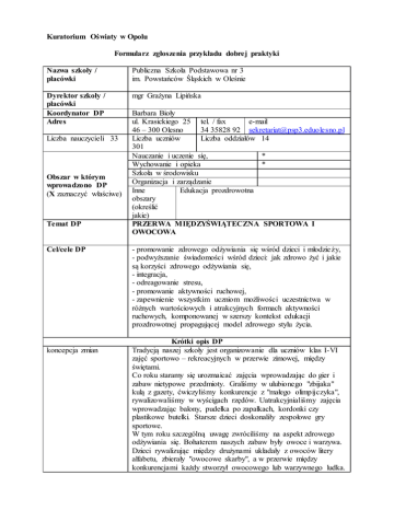 Kuratorium Oświaty w Opolu Formularz zgłoszenia przykładu dobrej praktyki Nazwa szkoły / placówki Publiczna Szkoła Podstawowa nr 3 im. Powstańców Śląskich w Oleśnie Dyrektor szkoły / placówki Koordynator DP Adres mgr Grażyna Lipińska Liczba nauczycieli 33 Obszar w którym wprowadzono DP (X zaznaczyć właściwe) Temat DP Cel/cele DP koncepcja zmian Barbara Bioły ul. Krasickiego 25 tel. / fax e-mail 46 – 300 Olesno 34 35828 92 [email protected] Liczba uczniów Liczba oddziałów 14 301 Nauczanie i uczenie się, * Wychowanie i opieka * Szkoła w środowisku Organizacja i zarządzanie Inne Edukacja prozdrowotna obszary (określić jakie) PRZERWA MIĘDZYŚWIĄTECZNA SPORTOWA I OWOCOWA - promowanie zdrowego odżywiania się wśród dzieci i młodzie ży, - podwyższanie świadomości wśród dzieci: jak zdrowo żyć i jakie są korzyści zdrowego odżywiania się, - integracja, - odreagowanie stresu, - promowanie aktywności ruchowej, - zapewnienie wszystkim uczniom możliwości uczestnictwa w różnych wartościowych i atrakcyjnych formach aktywności ruchowych, komponowanej w szerszy kontekst edukacji prozdrowotnej propagującej model zdrowego stylu życia. Krótki opis DP Tradycją naszej szkoły jest organizowanie dla uczniów klas I-VI zajęć sportowo – rekreacyjnych w przerwie zimowej, między świętami. Co roku staramy się urozmaicać zajęcia wprowadzając do gier i zabaw nietypowe przedmioty. Graliśmy w ulubionego "zbijaka" kulą z gazety, ćwiczyliśmy konkurencje z "małego olimpijczyka", rywalizowaliśmy w wyścigach rzędów. Uatrakcyjnialiśmy zajęcia wprowadzając balony, pudełka po zapałkach, kordonki czy plastikowe butelki. Starsze dzieci doskonaliły zespołowe gry sportowe. W tym roku szczególną uwagę zwróciliśmy na aspekt zdrowego odżywiania się. Bohaterem naszych zabaw były owoce i warzywa. Dzieci rywalizując między drużynami układały z owoców litery alfabetu, zbierały "owocowe skarby", a w przerwie między konkurencjami każdy stworzył owocowego lub warzywnego ludka. metody realizacji uczestnicy i ich rola w DP Zaangażowane środki a) osobowe b) materialne środki finansowe czas realizacji efekty wpływ na uczniów wpływ na pracę szkoły, wpływ na środowisko lokalne. formy monitorowania, metoda pomiaru W naszej szkole dzieci bardzo chętnie uczestniczą w zajęciach wychowania fizycznego, dlatego pamiętamy, aby również w czasie wolnym od zajęć zapewnić naszym podopiecznym różnorodne formy ruchu promując tym samym zdrowy styl życia. Metoda zabawowo – klasyczna, zabawowo – naśladowcza, metoda kreatywna – problemowa. Uczestnicy to uczniowie naszej szkoły i nauczyciele. Rola uczestników: zabawa, integracja, nawiązanie nowych znajomości, promowanie zdrowego stylu życia, zdrowego odżywiania się. Środki osobowe: - uczniowie klas I – IV, nauczyciele. Środki materialne: - sprzęt nagłaśniający, owoce, warzywa, przybory szkolne. Budżet szkoły. Rok szkolny – przerwa między świętami a nowym rokiem. Korzyści zastosowania DP: Efekty działań: - podwyższenie świadomości uczniów – jak żyć zdrowo, - integracja uczniów, - zwiększona sprawność ruchowa uczniów, - rozwijanie zainteresowań i uzdolnień, - radosna, beztroska zabawa, - chęć aktywnego spędzania czasu, - usprawnienie zdrowia, - profilaktyka przed zachowaniami ryzykownymi, - odreagowanie stresu, - kreatywność, twórczość, - dzieci odkrywają w sobie talenty, - rozwijają zdolności manualne, - poprzez zabawę – dzieci chętnie spożywają owoce i warzywa. - dzieci są radośniejsze, sprawniejsze ruchowo, - dzieci świadomie dbają o dietę bogatą w owoce i warzywa, - nawiązują nowe znajomości, - nabywają nowe doświadczenia, - poznają własne możliwości, - przeciwdziałanie agresji i przemocy wśród młodzieży i dzieci, - uczniowie przezwyciężają własne słabości, - rozwijają zdolności manualne, - dzieci poznają nowe smaki owoców (np. melon), warzyw. Dzieci aktywnie spędzają czas w przerwie między świętami, są radośniejsze. Poprzez popularyzację wszelkich form ruchu uczniowie osiągają lepsze wyniki w sporcie, są twórcze. Dzieci rozwijają talenty plastyczne, sportowe. Uczniowie wiedzą, jak bogate w witaminy i minerały owoce i warzywa, korzystnie wpływają na nasz organizm. Wszelka forma ruchu jednoczy środowisko szkolne, lokalne. Zajęcia dla dzieci w ramach wolontariatu podnoszą atrakcyjność placówki. Monitoring/ewaluacja - artykuły i galerie zdjęć na stronie internetowej szkoły, - opinie uczniów i nauczycieli, wyników DP działania które się sprawdziły wnioski, uwagi, trudności w realizacji DP: załączniki (np. prezentacja) - gazetka szkolna. Metoda pomiaru wyników: liczba uczestniczących dzieci. Udało nam się stworzyć radosną, beztroską atmosferę, dzieci chętnie uczestniczą zajęciach na sali gimnastycznej, są twórcze i otwarte, nawiązują znajomości, współdziałają w grupie. Dzieci pamiętają, że owoce i warzywa są głównym źródłem witamin i składników mineralnych oraz błonnika, które wpływają na prawidłowy rozwój organizmu. Zbieramy opinie dzieci i rodziców, podnosimy atrakcyjność zajęć. Zdjęcia, artykuły na stronie internetowej szkoły: http://psp3.mojeolesno.pl/index.php?limitstart=5 http://psp3.mojeolesno.pl/index.php?limitstart=90 Wyrażam zgodę na opublikowanie na stronie internetowej Kuratorium Oświaty w Opolu przedstawionego przykładu dobrej praktyki. Miejscowość , data Podpis dyrektora szkoły/placówki