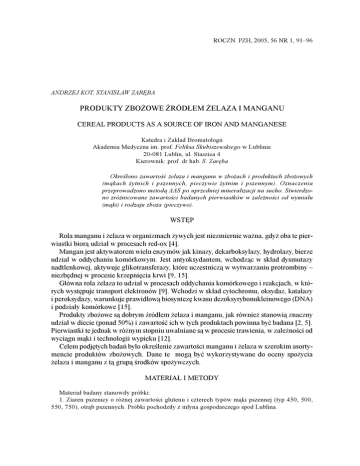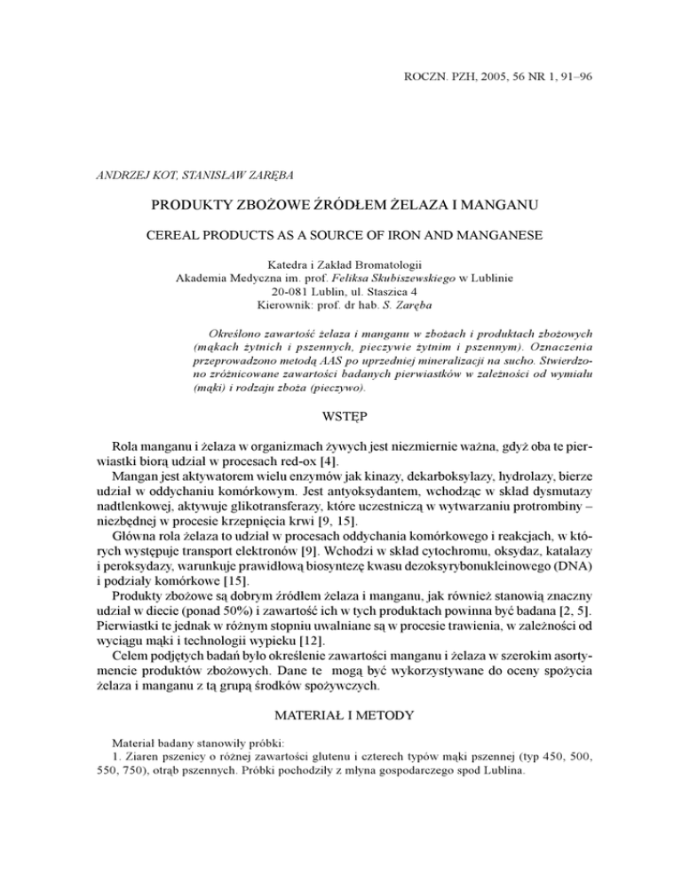 Nr 1 ¯elazo i mangan w produktach zbo¿owych ROCZN. PZH, 2005, 56 NR 1, 9196 91 ANDRZEJ KOT, STANIS£AW ZARÊBA PRODUKTY ZBO¯OWE RÓD£EM ¯ELAZA I MANGANU CEREAL PRODUCTS AS A SOURCE OF IRON AND MANGANESE Katedra i Zak³ad Bromatologii Akademia Medyczna im. prof. Feliksa Skubiszewskiego w Lublinie 20-081 Lublin, ul. Staszica 4 Kierownik: prof. dr hab. S. Zarêba Okrelono zawartoæ ¿elaza i manganu w zbo¿ach i produktach zbo¿owych (m¹kach ¿ytnich i pszennych, pieczywie ¿ytnim i pszennym). Oznaczenia przeprowadzono metod¹ AAS po uprzedniej mineralizacji na sucho. Stwierdzono zró¿nicowane zawartoci badanych pierwiastków w zale¿noci od wymia³u (m¹ki) i rodzaju zbo¿a (pieczywo). WSTÊP Rola manganu i ¿elaza w organizmach ¿ywych jest niezmiernie wa¿na, gdy¿ oba te pierwiastki bior¹ udzia³ w procesach red-ox [4]. Mangan jest aktywatorem wielu enzymów jak kinazy, dekarboksylazy, hydrolazy, bierze udzia³ w oddychaniu komórkowym. Jest antyoksydantem, wchodz¹c w sk³ad dysmutazy nadtlenkowej, aktywuje glikotransferazy, które uczestnicz¹ w wytwarzaniu protrombiny niezbêdnej w procesie krzepniêcia krwi [9, 15]. G³ówna rola ¿elaza to udzia³ w procesach oddychania komórkowego i reakcjach, w których wystêpuje transport elektronów [9]. Wchodzi w sk³ad cytochromu, oksydaz, katalazy i peroksydazy, warunkuje prawid³ow¹ biosyntezê kwasu dezoksyrybonukleinowego (DNA) i podzia³y komórkowe [15]. Produkty zbo¿owe s¹ dobrym ród³em ¿elaza i manganu, jak równie¿ stanowi¹ znaczny udzia³ w diecie (ponad 50%) i zawartoæ ich w tych produktach powinna byæ badana [2, 5]. Pierwiastki te jednak w ró¿nym stopniu uwalniane s¹ w procesie trawienia, w zale¿noci od wyci¹gu m¹ki i technologii wypieku [12]. Celem podjêtych badañ by³o okrelenie zawartoci manganu i ¿elaza w szerokim asortymencie produktów zbo¿owych. Dane te mog¹ byæ wykorzystywane do oceny spo¿ycia ¿elaza i manganu z t¹ grup¹ rodków spo¿ywczych. MATERIA£ I METODY Materia³ badany stanowi³y próbki: 1. Ziaren pszenicy o ró¿nej zawartoci glutenu i czterech typów m¹ki pszennej (typ 450, 500, 550, 750), otr¹b pszennych. Próbki pochodzi³y z m³yna gospodarczego spod Lublina. 92 A. Kot, S. Zarêba Nr 1 2. Czterech typów m¹k pszennych (typ 550, 650, 850, 1850), dwu typów m¹k ¿ytnich (typ 720, 2000), piêciu asortymentów chleba pszennego (regionalny, wiejski, mieszany, graham, górski), omiu asortymentów chleba ¿ytniego (s³onecznikowy, malany ze s³onecznikiem, sojowy, razowy, pe³noziarnisty, ¿ytnio-miodowy, liwkowy, firmowy), piêciu asortymentów pieczywa pszennego zwyk³ego oraz czterech asortymentów pieczywa pszennego pó³cukierniczego. Próbki pochodzi³y z du¿ej piekarni w Lublinie. 3. Trzech typów m¹k pszennych (typ 500, 750, graham 1850), dwu typów m¹k ¿ytnich (typ 720 i 2000), jednego asortymentu chleba pszennego (wiejski), trzech asortymentów chleba ¿ytniego (razowy z soj¹ i s³onecznikiem, zwyk³y, razowy), trzech asortymentów pieczywa pszennego zwyk³ego (bu³ka zwyk³a, bu³ka zwyk³a z makiem, bu³ka zwyk³a z kminkiem), pieczywa pszennego pó³cukierniczego (bu³ka malana, bu³ka malana z makiem, rogal malany, cha³ka, p¹czek). Próbki pochodzi³y z piekarni z Podkarpacia. Do badañ pobierano od 2 do 4 sztuk wyrobów jednostkowych, z których sporz¹dzano redni¹ próbkê wg ogólnie przyjêtych zasad. Odwa¿ano 10 równoleg³ych próbek po 20 g i do tygli kwarcowych i mineralizowano próbki na sucho w temperaturze 450°C. Popió³ roztwarzano w kwasie chlorowodorowym Suprapur o stê¿eniu 6 mol/l i przenoszono za pomoc¹ wody dejonizowanej do kolb miarowych o pojemnoci 50 ml. W przypadku niezupe³nej mineralizacji stosowano dodatkowo utlenienie 10% kwasem azotowym. Oznaczenia manganu i ¿elaza przeprowadzono z roztworu wodnego metod¹ p³omieniowej atomowej spektrometrii absorpcyjnej (FASA) [6, 10]. Przed przyst¹pieniem do badañ wykonano badania odzysku, dodaj¹c znane zawartoci manganu i ¿elaza do próbek przed mineralizacj¹. Uzyskany odzysk dla m¹k wynosi³ w przypadku manganu rednio 97,0 ± 3,2%, a w przypadku ¿elaza rednio 98,0 ± 2,5% przy RDS 2,5 i 3,8%. Dok³adnoæ i precyzjê metody sprawdzono poprzez wykonanie oznaczeñ zawartoci manganu i ¿elaza w materiale certyfikowanym Durum Wheat Flour RN 8436 dostêpnym z NIST. Zawartoæ manganu wg certyfikatu w m¹ce pszennej wynosi³a 16,0 ± 1,0 mg/kg a zawartoæ oznaczona 15,9 ± 1,1 mg/kg. Zawartoæ ¿elaza wg certyfikatu wynosi³a 41,5 ± 4,0 mg/kg a zawartoæ oznaczona 41,3 ± 3,5 mg/kg. Wspó³czynnik zmiennoci (RSD) dla tych oznaczeñ waha³ siê od 2,9% do 5,6%. WYNIKI I DYSKUSJA W tabelach I-V przedstawiono wyniki zawartoci manganu i ¿elaza w ziarnach pszenicy, otrêbach, m¹kach i pieczywie. Zawartoci manganu w pszenicy wynosi³y rednio od 24,6 ± 1,3 do 27,1 ± 0,7 mg/kg a w otrêbach 84,5 ± 1,0 mg/kg. Podobne proporcje wystêpowa³y w przypadku ¿elaza. Ziarna pszenicy zawiera³y ¿elazo w iloci od 24,2 ± 2,5 do 36,0 ± 1,6 mg/kg, a otrêby 87,9 ± 22,0 mg/kg. Nieco wy¿sze zawartoci ¿elaza w pszenicy i otrêbach stwierdza³ Sobiech i wsp. [13]. Podobne zawartoci stwierdzano w Finlandii [16] i na Wêgrzech [1]. Zawartoæ manganu w pszenicy by³a znacznie wy¿sza na terenach miedziononych [14]. Mangan i ¿elazo wystêpowa³y w wiêkszych ilociach w pszenicy niskoglutenowej. Zawartoæ manganu w m¹kach pszennych zawiera³a siê w granicach od 2,0 mg/kg do 46,9 mg/kg, rednio 11,9 ± 11,3 a w m¹kach ¿ytnich od 10,9 do 63,1, rednio 29,5 ± 19,0 i by³a skorelowana z wymia³em. rednia zawartoæ ¿elaza w m¹kach pszennych wynosi³a 18,8 ± 7,4 a w m¹kach ¿ytnich 28,6 ± 25,9 mg/kg. Chleby pszenne zawiera³y mangan w iloci od 6,2 do 20,0 mg/kg, rednio 10,9 ± 4,0 mg/kg, a ¿elaza od 6,2 do 29,1 mg/kg, rednio 15,1 ± 6,0 mg/kg. Iloci zarówno manganu jak i ¿elaza w chlebach by³y ni¿sze ni¿ w m¹kach, z której te chleby by³y wypiekane. rednia zawartoæ manganu w chlebach ¿ytn