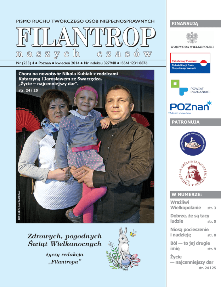 PISMO RUCHU TWÓRCZEGO OSÓB NIEPEŁNOSPRAWNYCH FINANSUJĄ Nr (233) 4 Poznań kwiecień 2014 Nr indeksu 327948 ISSN 1231-8876 Chora na nowotwór Nikola Kubiak z rodzicami Katarzyną i Jarosławem ze Swarzędza. „Życie – najcenniejszy dar”. str. 24 i 25 FOT. KAROLINA KASPRZAK PATRONUJĄ W NUMERZE: Wrażliwi Wielkopolanie str. 3 Dobrze, że są tacy str. 5 ludzie Zdrowych, pogodnych Świąt Wielkanocnych życzy redakcja „Filantropa” Niosą pocieszenie str. 8 i nadzieję Ból — to jej drugie str. 9 imię Życie — najcenniejszy dar str. 24 i 25 2 STRONA KWIECIEŃ 2014 Podstawą – działanie dla ludzi Z „N Protest w Warszawie rozpoczął się w środę 19 marca. Niepełnosprawni spędzili noce w gmachu Sejmu – na kocach. Ich rodzice najpierw agitowali przed Kancelarią Premiera, a później pod Sejmem. Najważniejszą sprawą, o którą walczyli, było uznanie 24-godzinnej opieki nad osobą z niepełnosprawnością za pracę zawodową. Opiekun, jeśli samodzielnie zajmuje się osobą z niepełnosprawnością, nie ma możliwości podjęcia zatrudnienia ani wzięcia kredytu. Kwoty zasiłków są tak niskie, że nie starcza nawet na podstawowe potrzeby. Ludzie nie mają gdzie pójść po pomoc. Koszty utrzymania wciąż rosną. Akcja protestacyjna przeprowadzona także w innych polskich miastach była odpowiedzią na dyskryminującą osoby z niepełnosprawnością i ich opiekunów politykę rządu. Stowarzyszenie „Dom Wszystkich Polska Poznań” w samo południe 19 marca zainicjowało protest przed gmachem Wielkopolskiego Urzędu Wojewódzkiego. Nie brakowało emocji uwidocznionych na transparentach. „Żądamy uzawodowienia opieki nad niepełnosprawnymi” – to jedno z haseł. Na ręce wojewody wielkopolskiego Piotra Florka rodzice osób z niepełnosprawnością złożyli pismo adresowane do Premiera RP. Domagali się w nim między innymi spełnienia złożonych obietnic. KAROLINA KASPRZAK ajważniejszy jest los pojedynczego człowieka” – tymi słowami podsumowała swoje wystąpienie Poseł na Sejm RP Krystyna Łybacka. Było to w piątek 7 marca w Pałacu Działyńskich na Starym Rynku w Poznaniu podczas prezentacji Komitetu Honorowego w wyborach do Parlamentu Europejskiego. Skład Komitetu Honorowego tworzy wiele znanych w Wielkopolsce postaci jak prorektor Uniwersytetu imienia Adama Mickiewicza w Poznaniu w latach 2002-2008 prof. dr hab. Kazimierz Przyszczypkowski, były zastępca dyrektora PKP S.A. Bogdan Waligórski czy członek Zarządu Województwa Wielkopolskiego w latach 1998-2002 Bogdan Zastawny. – Wybory do Parlamentu Europejskiego nie są wyborami, w których mobilizujemy się przeciwko komuś. To wybory z nadzieją na to, że razem będziemy mogli podejmować jak najlepsze decyzje. Każda zmiana powinna służyć człowiekowi. Podstawą jest dla nas zrównoważony rozwój, by wszystkie regiony miały równe szanse. Żadne unijne rozwiązania nie mogą wykluczać człowieka z życia. Długo wzbraniałam się przed kandydowaniem do Parlamentu Euro- Obecni na spotkaniu kandydaci do Parlamentu Europejskiego z ramienia SLD – okręg nr 7 Wielkopolska. Od lewej: Marek Niedbała, Elżbieta Streker-Dembińska, Vanessa Kaczmarek-Lekki, Tadeusz Tomaszewski, Katarzyna Kretkowska, Wiesław Szczepański i Krystyna Łybacka. zentuje w Radzie Miasta Poznania Klub Radnych SLD), Tadeusz Tomaszewski (członek Zarządu Polskiego Komitetu Olimpijskiego, założyciel Stowarzyszenia Młodych Wielkopolan), Vanessa Kaczmarek-Lekki (lekarz nefrolog z Ostrowa Wielkopolskiego), Romuald Ajchler (Poseł na Sejm RP II, III, IV i VI kadencji), Elżbieta Streker-Dembińska (polityk, samorządowiec, senator RP V kadencji), Marek Niedbała (radny województwa wielkopolskiego), Karolina Witkowska (przedstawicielka Unii Pracy) i Leszek Aleksandrzak (poseł na Sejm RP VII kadencji). pejskiego, bo uważałam, że będzie to oznaczało oddalenie się od ludzi. Doświadczenie parlamentarne może się jednak przydać we wdrażaniu europejskich rozwiązań. Zdecydowałam się kandydować i jest mi niezmiernie miło, że mogę dołączyć do tak znakomitego grona – mówiła Poseł Krystyna Łybacka. Prócz Krystyny Łybackiej na liście kandydatów do Parlamentu Europejskiego z ramienia Sojuszu Lewicy Demokratycznej (okręg nr 7 Wielkopolska) znalazł się Wiesław Szczepański (Poseł na Sejm RP V i VI kadencji, wiceprzewodniczący Rady Krajowej SLD w latach 2004-2007), Katarzyna Kretkowska (repre- KAROLINA KASPRZAK Maraton dobrych serc R ozkochane w tanecznych rytmach Zumby Pobiedziska ponownie były miejscem maratonu charytatywnego. Niezwykła Joanna Wolniewicz – licencjonowana instruktorka Zumby – zorganizowała 9 marca maraton lu- dzi dobrych serc, którzy w rytmie Zumby doskonale się bawili, ale również wspomogli akcję zbiórki żywności dla będącej w potrzebie rodziny z gminy Pobiedziska. Działania Asi wspomogły Stowarzyszenie „Światowid” FOT. ARCHIWUM OK POBIRDZISKA asiłek pielęgnacyjny wynosi 153 złote, renta socjalna 610 złotych, świadczenie dla opiekuna 620 złotych + 200 złotych ze specjalnego programu rządowego. To i tak zdecydowanie za mało na miesięczne utrzymanie osoby z niepełnosprawnością. Brakuje na lekarstwa, środki higieniczne i rehabilitację, ale przede wszystkim na chleb. Dlatego niepełnosprawni i ich opiekunowie zorganizowali pod Sejmem RP protest okupacyjny – o godne warunki do życia. FOT. KAROLINA KASPRZAK O godne warunki życia oraz Stowarzyszenie na Rzecz Dzieci i Młodzieży Niepełnosprawnej w Pobiedziskach. Gościny i pomocy udzielił Ośrodek Kultury, gdzie na deskach dużej sceny i sali blisko 50 uczestników tańczyło Zumbę. Kolejny już raz w Pobiedziskach z inicjatywy znanej i lubianej Joanny Wolniewicz dobro spłynęło wprost do tych, którzy potrzebują pomocy. Z całą pewnością nie jest to ostatnie tak miłe wydarzenie, na którym taneczna zabawa Zumbą przynosi tak pozytywne efekty. Tym razem efektem tańca 
