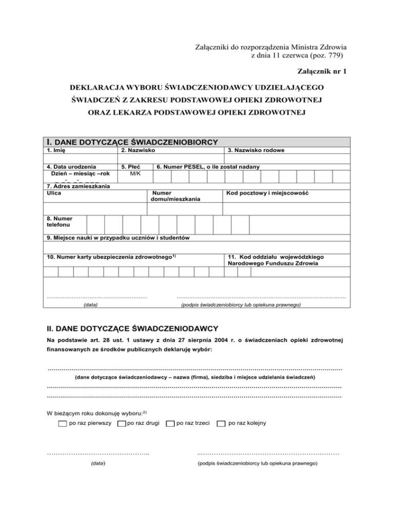 Załączniki do rozporządzenia Ministra Zdrowia z dnia 11 czerwca (poz. 779) Załącznik nr 1 DEKLARACJA WYBORU ŚWIADCZENIODAWCY UDZIELAJĄCEGO ŚWIADCZEŃ Z ZAKRESU PODSTAWOWEJ OPIEKI ZDROWOTNEJ ORAZ LEKARZA PODSTAWOWEJ OPIEKI ZDROWOTNEJ I. DANE DOTYCZĄCE ŚWIADCZENIOBIORCY 1. Imię 2. Nazwisko 4. Data urodzenia Dzień – miesiąc –rok _ _-_ _-_ _ _ _ 7. Adres zamieszkania Ulica 5. Płeć M/K 3. Nazwisko rodowe 6. Numer PESEL, o ile został nadany Numer domu/mieszkania Kod pocztowy i miejscowość 8. Numer telefonu 9. Miejsce nauki w przypadku uczniów i studentów 11. Kod oddziału wojewódzkiego Narodowego Funduszu Zdrowia 10. Numer karty ubezpieczenia zdrowotnego1) ………………………………………………… (data) …………………………………………………………………………………… (podpis świadczeniobiorcy lub opiekuna prawnego) II. DANE DOTYCZĄCE ŚWIADCZENIODAWCY Na podstawie art. 28 ust. 1 ustawy z dnia 27 sierpnia 2004 r. o świadczeniach opieki zdrowotnej finansowanych ze środków publicznych deklaruję wybór: ………………………………………………………………………………………………………………………………… (dane dotyczące świadczeniodawcy – nazwa (firma), siedziba i miejsce udzielania świadczeń) ………………………………………………………………………………………………………………………………… ………………………………………………………………………………………………………………………………… W bieżącym roku dokonuję wyboru:2) po raz pierwszy po raz drugi ……………………………………….. (data) po raz trzeci po raz kolejny ..……………………………………………………… (podpis świadczeniobiorcy lub opiekuna prawnego) III. DANE DOTYCZĄCE LEKARZA PODSTAWOWEJ OPIEKI ZDROWOTNEJ Na podstawie art. 28 ust. 1a ustawy z dnia 27 sierpnia 2004 r. o świadczeniach opieki zdrowotnej finansowanych ze środków publicznych deklaruję wybór:3) ………………………………………………………………………………………………………………………………… (imię i nazwisko lekarza podstawowej opieki zdrowotnej) ………………………………………………………………………………………………………………………………… W bieżącym roku dokonuję wyboru:2) po raz pierwszy po raz drugi ……………………………………….. (data) po raz trzeci po raz kolejny ..……………………………………………………… (podpis świadczeniobiorcy lub opiekuna prawnego) ……………………………………………………………………….. (podpis osoby przyjmującej deklarację wyboru) Objaśnienia: 1) Jeżeli świadczeniobiorcy została wydana karta ubezpieczenia zdrowotnego, a w przypadku osób uprawnionych na podstawie przepisów o koordynacji – numer poświadczenia potwierdzającego prawo do świadczeń opieki zdrowotnej w ramach ubezpieczenia zdrowotnego na terytorium Rzeczypospolitej Polskiej. 2) Świadczeniobiorca ma prawo bezpłatnego wyboru świadczeniodawcy, lekarza, pielęgniarki i położnej podstawowej opieki zdrowotnej nie częściej niż trzy razy w roku kalendarzowym, a w przypadku każdej kolejnej zmiany wnosi opłatę w wysokości 80 zł. Świadczeniobiorca nie ponosi opłaty w przypadku zmiany swojego miejsca zamieszkania lub w przypadku zaprzestania udzielania świadczeń opieki zdrowotnej przez wybranego świadczeniodawcę, lekarza, pielęgniarkę lub położną podstawowej opieki zdrowotnej u wybranego świadczeniodawcy lub z innych przyczyn powstałych po stronie świadczeniodawcy (art. 28 ust. 1c i 1d ustawy z dnia 27 sierpnia 2004 r. o świadczeniach opieki zdrowotnej finansowanych ze środków publicznych). 3) Świadczeniobiorca może wybrać lekarza, pielęgniarkę lub położną podstawowej opieki zdrowotnej u tego samego świadczeniodawcy, u różnych świadczeniodawców albo będących świadczeniodawcami (art. 28 ust. 1b ustawy z dnia 27 sierpnia 2004 r. o świadczeniach opieki zdrowotnej finansowanych ze środków publicznych). Załącznik nr 2 DEKLARACJA WYBORU ŚWIADCZENIODAWCY UDZIELAJĄCEGO ŚWIADCZEŃ Z ZAKRESU PODSTAWOWEJ OPIEKI ZDROWOTNEJ ORAZ PIELĘGNIARKI PODSTAWOWEJ OPIEKI ZDROWOTNEJ I. DANE DOTYCZĄCE ŚWIADCZENIOBIORCY 1. Imię 2. Nazwisko 4. Data urodzenia Dzień – miesiąc –rok _ _-_ _-_ _ _ _ 7. Adres zamieszkania Ulica 5. Płeć M/K 3. Nazwisko rodowe 6. Numer PESEL, o ile został nadany Numer domu/mieszkania Kod pocztowy i miejscowość 8. Numer telefonu 9. Miejsce nauki w przypadku uczniów i studentów 11. Kod oddziału wojewódzkiego Narodowego Funduszu Zdrowia 10. Numer karty ubezpieczenia zdrowotnego1) ………………………………………………… (data) …………………………………………………………………………………… (podpis świadczeniobiorcy lub opiekuna prawnego) II. DANE DOTYCZĄCE ŚWIADCZENIODAWCY Na podstawie art. 28 ust. 1 ustawy z dnia 27 sierpnia 2004 r. o świadczeniach opieki zdrowotnej finansowanych ze środków publicznych deklaruję wybór: ………………………………………………………………………………………………………………………………… (dane dotyczące świadczeniodawcy – nazwa (firma), siedziba i miejsce udzielania świadczeń) ………………………………………………………………………………………………………………………………… ………………………………………………………………………………………………………………………………… W bieżącym roku dokonuję wyboru: 2) po raz pierwszy po raz drugi ……………………………………….. (data) po raz trzeci po raz kolejny ..………………