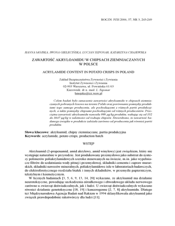 Nr 3 Akryloamid w chipsach ziemniaczanych ROCZN. PZH 2006, 57, NR 3, 243-249 243 HANNA MOJSKA, IWONA GIELECIÑSKA, LUCJAN SZPONAR, KATARZYNA CHAJEWSKA ZAWARTOÆ AKRYLOAMIDU W CHIPSACH ZIEMNIACZANYCH W POLSCE ACRYLAMIDE CONTENT IN POTATO CRISPS IN POLAND Zak³ad Bezpieczeñstwa ¯ywnoci i ¯ywienia Instytut ¯ywnoci i ¯ywienia 02-903 Warszawa, ul. Powsiñska 61/63 Kierownik: dr n. med. L. Szponar [email protected] Celem badañ by³o oznaczenie zawartoci akryloamidu w chipsach ziemniaczanych pobranych losowo na terenie Polski oraz porównanie pomiêdzy produktami tego samego producenta, ale pochodz¹cymi z ró¿nych partii produkcyjnych, a tak¿e pomiêdzy chipsami pochodz¹cymi od ró¿nych producentów. Przeciêtna zawartoæ akryloamidu wynosi³a 998 mg/kg produktu, wahaj¹c siê od 352 do 3647 mg/kg w zale¿noci od rodzaju chipsów. Stwierdzono, ¿e zawartoæ badanego zwi¹zku w produkcie zale¿a³a zarówno od producenta jak równie¿ partii produktu. S³owa kluczowe: akryloamid, chipsy ziemniaczane, partia produkcyjna Keywords: acrylamide, potato crisps, production batch WSTÊP Akryloamid (2-propenamid, amid akrylowy, amid winylowy) jest zwi¹zkiem, który nie wystêpuje naturalnie w przyrodzie. Jest produkowany przemys³owo jako substrat do syntezy polimerów poliakrylamidowych szeroko stosowanych na wiecie, m.in. jako wype³niacze filtrów do uzdatniania wody pitnej i przemys³owej, sk³adniki cementu i zapraw murarskich, sk³adniki nawozów mineralnych, poliakrylamidowe ¿ele w laboratoriach badawczych, do elektroforetycznego rozdzia³u bia³ek i innych sk³adników, w przemyle papierniczym, tekstylnym i kosmetycznym. W licznych badaniach [3, 5, 6, 9, 13, 14, 20] wykazano, ¿e akryloamid ma dzia³anie neurotoksyczne, powoduj¹c uszkodzenia orodkowego i obwodowego uk³adu nerwowego zarówno u zwierz¹t dowiadczalnych, jak i ludzi. U zwierz¹t dowiadczalnych wykazano równie¿ dzia³anie genotoksyczne [18, 19] i kancerogenne [2, 7, 8] akryloamidu. Dlatego te¿ Miêdzynarodowa Agencja Badañ nad Rakiem w 1994 sklasyfikowa³a akryloamid jako zwi¹zek prawdopodobnie rakotwórczy dla ludzi [11]. 244 H. Mojska i in. Nr 3 W kwietniu 2002 r. grupa naukowców z Uniwersytetu w Sztokholmie razem ze Szwedzk¹ Narodow¹ Agencj¹ ds. ¯ywnoci og³osi³a, ¿e akryloamid powstaje w czasie przetwarzania ¿ywnoci i jest obecny w ¿ywnoci poddanej sma¿eniu i pieczeniu [21]. Obecnie wiadomo, ¿e akryloamid powstaje przede wszystkim w produktach wysokowêglowodanowych, poddanych obróbce termicznej jako jeden z produktów reakcji Maillarda, zachodz¹cej pomiêdzy woln¹ asparagin¹ i cukrami redukuj¹cymi (najbardziej reaktywne s¹ glukoza i fruktoza). Wród czynników sprzyjaj¹cych powstawaniu akryloamidu w ¿ywnoci wymienia siê du¿¹ zawartoæ wolnej asparaginy, du¿¹ zawartoæ cukrów redukuj¹cych, wilgotnoæ poni¿ej 30%, temperaturê procesu przetwarzania ¿ywnoci w zakresie 120-170°C oraz relatywnie niereaktywn¹ matrycê przeszkadzaj¹c¹ w eliminacji zwi¹zku. G³ównym ród³em akryloamidu w diecie s¹ produkty wysoko wêglowodanowe poddane obróbce termicznej, przede wszystkim chipsy i frytki ziemniaczane, sma¿one i pieczone ziemniaki, a tak¿e przetwory zbo¿owe, m.in. chleb, p³atki niadaniowe, pieczywo cukiernicze. Istotnym ród³em akryloamidu w diecie mo¿e byæ równie¿ kawa oraz kakao i produkty czekoladowe. Przeciêtna zawartoæ akryloamidu w ¿ywnoci jak wynika z badañ prowadzonych w wielu krajach europejskich waha siê w granicach od poni¿ej 30 do ponad 3500 mg/kg produktu [17]. Z ogólnopolskich reprezentatywnych badañ sposobu ¿ywienia przeprowadzonych przez I¯¯ w 2000 roku wynika, i¿ spo¿ycie chipsów ziemniaczanych w Polsce nie jest wysokie, jednak szczegó³owa analiza w grupach wiekowych wykaza³a, ¿e wród spo¿ywaj¹cych ten produkt dzieci w wieku 7-15 lat przeciêtne dzienne spo¿ycie chipsów wynosi oko³o 65 g (Szponar i wsp. 2000, dane niepublikowane). Celem badañ by³a ocena zawartoci akryloamidu w losowo pobranych na terenie Polski próbkach chipsów ziemniaczanych. MATERIA£ I METODY Materia³ do badañ stanowi³y 24 próbki chipsów (14 rodzajów) pobrane w losowo dobranych sklepach na terenie Polski w marcu i lipcu 2004 r. przez pracowników Pañstwowej Inspekcji Sanitarnej. Produkty w oryginalnych opakowaniach handlowych, w iloci nie mniejszej ni¿ 250 g by³y niezw³ocznie dostarczane w warunkach podanych na opakowaniu przez producenta do Instytutu ¯ywnoci i ¯ywienia, gdzie wykonywano badania. Do homogenizowanej próbki chipsów ziemniaczanych (3 g) dodawano 100 ml roztworu wzorcowego akryloamidu deuterowanego (d3 akryloamidu) (Cambridge Isotope Laboratories) o stê¿eniu 100 mg/ml. Próbkê ekstrahowano 25 ml wody destylowanej, a nastêpnie ogrzewano przez 2 godziny w ³ani wodnej w temp. 60°C. Po sch³odzeniu do temperatury pokojowej próbkê poddawano wirowaniu przez 30 min (12 000 obr/min; MPW Med. Instruments, Polska), a nastêpnie wymra¿ano w temp. 20°C przez 20 min w celu usuniêcia t³uszczu. Do ekstraktu dodawano ~ 2,5 g bromku potasu, 0,1 ml kwasu bromowodorowego (48%; Fluka) oraz 2,5 ml nasyconego roztworu wody bromowej. Próbkê poddawano ca³onocnemu bromowaniu w temp. ~ 0°C. Nadmiar bromu zobojêtniano kilkoma kroplami 1 M roztworu tiosiarczanu sodu (Sigma-Aldrich). Próbkê przenoszono do kolby wirowej, dodawano ~1 g bezwodnego siarczanu sodu, a nastêpnie 2-krotnie ekstrahowano 3 ml mieszaniny heksanu i octanu etylu (4:1; v/v) przez wytrz¹sanie (5 min) i poddawano wirowaniu przez 10 min (10 000 obr/min). Po rozdzieleniu siê warstw, ka¿dorazowo pobierano warstwê organiczn¹ i przenoszono do ampu³ki szklanej. Po odparowaniu do sucha pod azotem (temp. bloku grzejnego 50°C), do próbki dodawano 100 ml octanu etylu (do HPLC) i przenoszono do wialek do autosamplera [4, 23]. Nr 3 Akryloamid w chipsach ziemniaczanych 245 Bromowaniu poddawano równie¿ mieszaninê 100 ml roztworów wzorcowych akryloamidu (Fluka) i d3 - akryloam