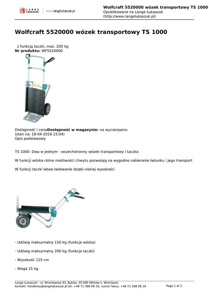Wolfcraft 5520000 wózek transportowy TS 1000 Opublikowane na Lange Łukaszuk (http://www.langelukaszuk.pl) Wolfcraft 5520000 wózek transportowy TS 1000 z funkcją taczki, max. 200 kg Nr produktu: WF5520000 Dostępność i cenaDostępność w magazynie: na wyczerpaniu (stan na: 18-04-2016 15:04) Opis podstawowy TS 1000- Dwa w jednym - wszechstronny wózek transportowy i taczka W funkcji wózka różne możliwości chwytu pozwalają na wygodne nabieranie ładunku i jego transport W funkcji taczki łatwe ładowanie dzięki niskiej wysokości - Udźwig maksymalny 150 kg (funkcja wózka) - Udźwig maksymalny 200 kg (funkcja taczki) - Wysokość 125 cm - Waga 15 kg Lange Łukaszuk - ul. Wrocławska 43, Byków, 55-095 Mirków k. Wrocławia kontakt: [email protected] tel: +48 71 398 08 18, numer faksu: +48 71 398 08 19 Page 1 of 2 Wolfcraft 5520000 wózek transportowy TS 1000 Opublikowane na Lange Łukaszuk (http://www.langelukaszuk.pl) możliwy transport po schodach- ustawianie bezpiecznego kąta pochyłu rękojeści zwiększa komfort i bezpieczeństwo rękojeść z nakładkami ochronnymi system szybkiego składania składana przednia łopata umożliwia przewożenie również długich ładunków zaokrąglona żerdź poprzeczna i płyta spodnia - idealne rozwiązanie do transportowania przedmiotów o kształtach owalnych ParametryNr katalogowy WF 5520000 Max. udźwig w funkcji wózka 150 kg Max. udźwig w funkcji taczki 200 kg Wymiary po rozłożeniu 610 x 1.260 x 550 mm Wymiary po złożeniu 610 x 800 x 520 mm Waga 15 kg Filmy Tagi: system transportowy, wolfcraft, wózek Lange Łukaszuk - ul. Wrocławska 43, Byków, 55-095 Mirków k. Wrocławia kontakt: [email protected] tel: +48 71 398 08 18, numer faksu: +48 71 398 08 19 Powered by TCPDF (www.tcpdf.org) Page 2 of 2