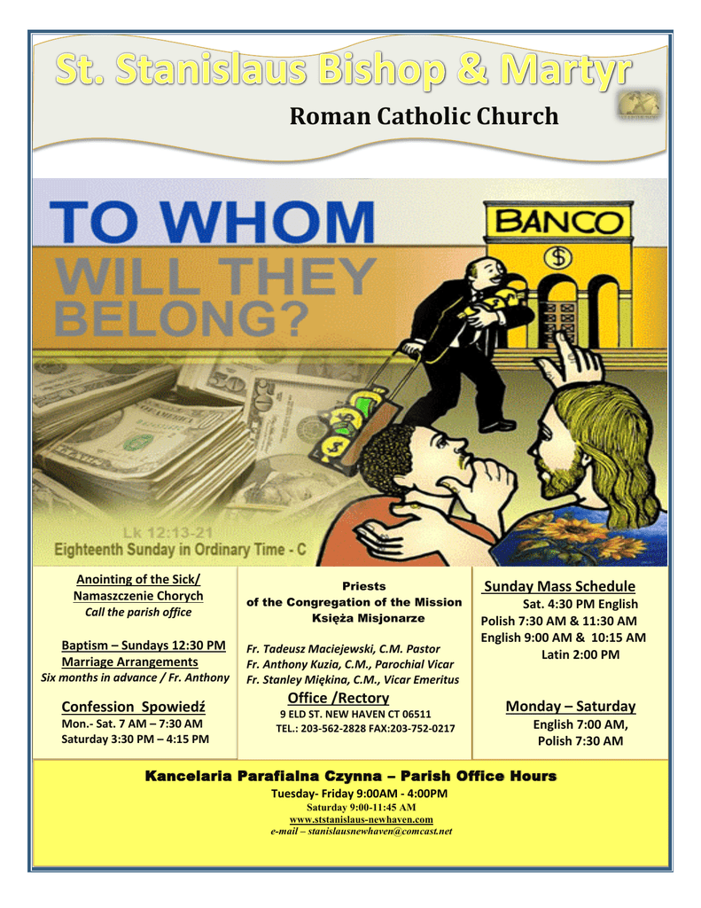 Roman Catholic Church Anointing of the Sick/ Namaszczenie Chorych Call the parish office Baptism – Sundays 12:30 PM Marriage Arrangements Six months in advance / Fr. Anthony Confession Spowiedź Mon.- Sat. 7 AM – 7:30 AM Saturday 3:30 PM – 4:15 PM Priests of the Congregation of the Mission Księża Misjonarze Fr. Tadeusz Maciejewski, C.M. Pastor Fr. Anthony Kuzia, C.M., Parochial Vicar Fr. Stanley Miękina, C.M., Vicar Emeritus Office /Rectory 9 ELD ST. NEW HAVEN CT 06511 TEL.: 203-562-2828 FAX:203-752-0217 Sunday Mass Schedule Sat. 4:30 PM English Polish 7:30 AM & 11:30 AM English 9:00 AM & 10:15 AM Latin 2:00 PM Monday – Saturday English 7:00 AM, Polish 7:30 AM Kancelaria Parafialna Czynna – Parish Office Hours Tuesday- Friday 9:00AM - 4:00PM Saturday 9:00-11:45 AM www.ststanislaus-newhaven.com e-mail – [email protected] † THE EIGHTEENTH SUNDAY IN ORDINARY TIME 4:30 PM ††Mattio & Mary Christoforo by Frank & Edwina O’Neill SUNDAY JULY 31ST THE EIGHTEENTH SUNDAY IN ORDINARY TIME 7:30 AM Za wszystkich zmarłych, int. od Silviji Visnakovi Greg 28 9:00 AM †Ray Hardisty, Jr. by Henry Sobolewski 10:15 AM Blessings for Frank & Donna Bzdyra by Sandra & Barbara Bzdyra 11:30 AM Za zmarłych z Rodzin Gwiazda i Rogalskich, int. od Zofii i Henryka Gwiazda 2:00 PM Pro filiis donata per Matrem . MONDAY AUGUST 1ST ST. ALPHONSUS LIGUORI, BISHOP AND DOCTOR OF THE CHURCH 7:00 AM For all who have died by Sylvija Visnakovi Greg. 29 7:30 AM ††Krystyna i Roman Brajtkopf, int. od Rodziny 6:30 PM Adoration of the Blessed Sacrament 7:00 PM Miraculous Medal Novena & Benediction TUESDAY AUGUST 2ND 7:00 AM For all who have died by Sylvija Visnakovi Greg. 30 7:30 AM †Edward Ernest Welborn, int. od Córki Marysi WEDNESDAY AUGUST 3RD 7:00 AM ††Maria Czudak, Maria Kida, Aniela Gąska 7:30 AM O zdrowie, błogosławieństwo Boże oraz potrzebne łaski dla Ks. Tadeusza Maciejewskiego, C.M. THURSDAY AUGUST 4TH ST. JOHN VIANNEY, PRIEST 7:00 AM For Parishioners 7:30 AM †Jadwiga Joka, int. od Siostry i Brata FRIDAY AUGUST 5TH FIRST FRIDAY/PIERWSZY PIĄTEK 7:00 AM †Zofia Zane by Husband Tom 8:00 AM Fidelium Animarum (St. Gregory Purgatorial Society) 7:00 P.M. O zdrowie i błogosławieństwo Boże dla Grażyny Matusiewicz, int. od Sabiny Kovalik SATURDAY AUGUST 6TH THE FEAST OF THE TRANSFIGURATION OF THE LORD 7:00 AM †Marci Ann Sypniewski by Ilona Sypniewski 7:30 AM O zdrowie i Boże Błogosławieństwo dla Alec i Adam Samsel, int. od Babci Anticipated Sunday Mass 4:30 PM ††Stella & John Romanowski by Daughter Romayne & Family SUNDAY AUGUST 7TH THE NINETEENTH SUNDAY IN ORDINARY TIME 7:30 AM ††Katarzyna i Jan Droźdź, int. od Wnuczki Teresy z Rodziną 9:00 AM †Bukofske Family by Henry Sobolewski 10:15 AM ††Lottie & Tom Kane & Joan Kane Gaudio by Carol Kane Gwilliam 11:30 AM ††Józefa, Franciszek oraz Andrzej Fekieta, int. od Dzieci 2:00 PM Pro parochianiis JULY 31, 2016 The Santuary Lamps Burn for the Rev. Tadeusz Maciejewski, C.M. July 23RD/24TH - Regular Offertory - $2821.00. Next Week’s Second Collection will be for the Maintenance and Repair of Church Buildings. Druga składka w przyszłą niedzielę przeznaczona będzie na naprawy budynków parafialnych. The following donations were made in the office this week: $150 – Paul Bujalski $100 – Alan P. Haesche & Sandra L. Rux in memory of Rose Rutushni $25 - N.N. for food card $100 - N.N. $ST. 20 STANISLAUS - Mr. & Mrs. John KuczynskiEDUCATION RELIGIOUS Religious Education Registration 2016-2017 The parish Religious Education Office is registering students for the 2016-2017 season. Registration forms were . mailed to the parents of all the children who participated in the program during the 2015-2016 season. Please fill out the forms and return them to the office by August 15, 2016. Registration forms for all new students are available in the parish office. First Day of Class All Religious Education classes for grades one through ten will begin on Saturday, September 10th. Classes will take place from 9:00 to 10:15 AM. Parent Meetings Parents with children in grade nine [The Confirmation Program] will meet with Father Anthony on August 27th from 9:00 to 10:15 AM in the school. At least one parent is to attend this meeting with their child. Parents with children in grades one through eight will meet with Father Anthony on September 17th from 9:00 to 10:15 AM in the school. At least one parent is to attend this meeting. Teachers’ Meeting A meeting for all teachers, teachers’ aides and volunteers with the Religious Education Program will take place on Saturday, August 20, 2016 from 9:00 to Noon. Please plan on attending. † XVIII NIEDZIELA ZWYKŁA GŁUPIEC Życie nie polega na gromadzeniu bogactwa. Wielu ludzi ulega jednak przekonaniu, że jest odwrotnie. Życiowa aktywność jest skoncentrowana na "mieć". Mieć spadek, pełne spichlerze lub wysoko oprocentowane konto. Jeżeli nawet nie jest to możliwe do osiągnięcia, to pozostaje przynajmniej w sferze marzeń. W przypadku bogacza z Ewangelii był to stan faktyczny. Zaczął on sam ze sobą rozmawiać, planując przyszłość. Wewnętrzny dialog pokazuje, że był zamknięty na Boga i drugiego człowieka, był zamknięty na miłość. Opływał we wszystko, ale nie w to, co najważniejsze. Dlatego nabył sobie jeszcze jedno - imię, które brzmi "Głupiec". Taki człowiek zawsze pozostanie z pustymi rękoma, zwłaszcza jak stanie na sądzie Bożym. Jezu, Ty mi przypominasz, że prawdziwym skarbem jest miłość Boża, którą objawiasz. Do gromadzenia takiego bogactwa jestem wezwany. Nie pytam, co mam zrobić, bo już wiem. 31 LIPIEC 2016 PARISH PICNIC We would like to let you know that our annual Parish Picnic/Harvest Festival will be held at PNA Park, 171 N. Plains Rd., Wallingford, CT., 06492 on Sunday, September 18, 2016 from 1 P.M. till 8 P.M. The event will include delicious PolishAmerican food, music by the Dennis Polisky Polka Band from 1-5 PM, and by a