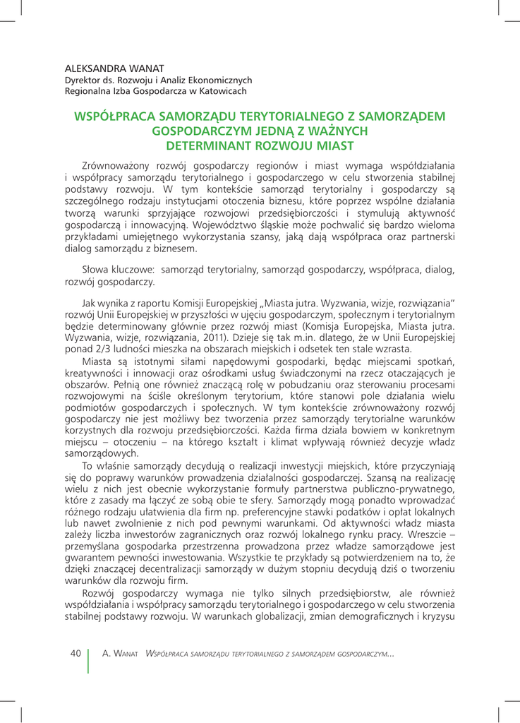ALEKSANDRA WANAT Dyrektor ds. Rozwoju i Analiz Ekonomicznych Regionalna Izba Gospodarcza w Katowicach WSPÓŁPRACA SAMORZĄDU TERYTORIALNEGO Z SAMORZĄDEM GOSPODARCZYM JEDNĄ Z WAŻNYCH DETERMINANT ROZWOJU MIAST Zrównoważony rozwój gospodarczy regionów i miast wymaga współdziałania i współpracy samorządu terytorialnego i gospodarczego w celu stworzenia stabilnej podstawy rozwoju. W tym kontekście samorząd terytorialny i gospodarczy są szczególnego rodzaju instytucjami otoczenia biznesu, które poprzez wspólne działania tworzą warunki sprzyjające rozwojowi przedsiębiorczości i stymulują aktywność gospodarczą i innowacyjną. Województwo śląskie może pochwalić się bardzo wieloma przykładami umiejętnego wykorzystania szansy, jaką dają współpraca oraz partnerski dialog samorządu z biznesem. Słowa kluczowe: samorząd terytorialny, samorząd gospodarczy, współpraca, dialog, rozwój gospodarczy. Jak wynika z raportu Komisji Europejskiej „Miasta jutra. Wyzwania, wizje, rozwiązania” rozwój Unii Europejskiej w przyszłości w ujęciu gospodarczym, społecznym i terytorialnym będzie determinowany głównie przez rozwój miast (Komisja Europejska, Miasta jutra. Wyzwania, wizje, rozwiązania, 2011). Dzieje się tak m.in. dlatego, że w Unii Europejskiej ponad 2/3 ludności mieszka na obszarach miejskich i odsetek ten stale wzrasta. Miasta są istotnymi siłami napędowymi gospodarki, będąc miejscami spotkań, kreatywności i innowacji oraz ośrodkami usług świadczonymi na rzecz otaczających je obszarów. Pełnią one również znaczącą rolę w pobudzaniu oraz sterowaniu procesami rozwojowymi na ściśle określonym terytorium, które stanowi pole działania wielu podmiotów gospodarczych i społecznych. W tym kontekście zrównoważony rozwój gospodarczy nie jest możliwy bez tworzenia przez samorządy terytorialne warunków korzystnych dla rozwoju przedsiębiorczości. Każda firma działa bowiem w konkretnym miejscu – otoczeniu – na którego kształt i klimat wpływają również decyzje władz samorządowych. To właśnie samorządy decydują o realizacji inwestycji miejskich, które przyczyniają się do poprawy warunków prowadzenia działalności gospodarczej. Szansą na realizację wielu z nich jest obecnie wykorzystanie formuły partnerstwa publiczno-prywatnego, które z zasady ma łączyć ze sobą obie te sfery. Samorządy mogą ponadto wprowadzać różnego rodzaju ułatwienia dla firm np. preferencyjne stawki podatków i opłat lokalnych lub nawet zwolnienie z nich pod pewnymi warunkami. Od aktywności władz miasta zależy liczba inwestorów zagranicznych oraz rozwój lokalnego rynku pracy. Wreszcie – przemyślana gospodarka przestrzenna prowadzona przez władze samorządowe jest gwarantem pewności inwestowania. Wszystkie te przykłady są potwierdzeniem na to, że dzięki znaczącej decentralizacji samorządy w dużym stopniu decydują dziś o tworzeniu warunków dla rozwoju firm. Rozwój gospodarczy wymaga nie tylko silnych przedsiębiorstw, ale również współdziałania i współpracy samorządu terytorialnego i gospodarczego w celu stworzenia stabilnej podstawy rozwoju. W warunkach globalizacji, zmian demograficznych i kryzysu 40 A. Wanat Współpraca samorządu terytorialnego z samorządem gospodarczym... ekonomicznego jedynie kooperacja różnych podmiotów na rzecz wspólnego celu może przynieść efekt synergii. W takim rozumieniu samorząd terytorialny i gospodarczy są szczególnego rodzaju instytucjami otoczenia biznesu, które poprzez wspólne działania tworzą warunki sprzyjające rozwojowi przedsiębiorczości i stymulują aktywność gospodarczą i innowacyjną. Wydaje się więc oczywistym, że kluczem do sukcesu jest dialog i aktywna współpraca samorządowców z przedsiębiorcami. Tylko w ten sposób można rozpoznać wzajemne potrzeby i oczekiwania, zidentyfikować problemy i lepiej dopasować lokalne prawo do potrzeb biznesu. Tymczasem nadal wielu samorządowców wystrzega się tego typu relacji, bądź nie dostrzegając w ogóle potrzeby dialogu, bądź obawiając się posądzenia o nadużycia lub wykorzystanie piastowanego stanowiska dla realizacji interesów konkretnych osób lub firm. Z tego powodu najwłaściwszym sposobem prowadzenia dialogu władz samorządowych z zorganizowanym środowiskiem biznesowym jest współpraca miasta z organizacjami samorządu gospodarczego. Izby gospodarcze i przemysłowo-handlowe reprezentują od lat lokalne środowiska biznesowe i doskonale znają ich potrzeby oraz problemy. Firmy zrzeszone w tego typu organizacjach mają zdecydowanie większe możliwości kształtowania korzystnych warunków dla prowadzenia biznesu w swym najbliższym otoczeniu niż pojedyncze przedsiębiorstwa. Tak prowadzony dialog ma jeszcze jedną ważną zaletę - jest transparentny i odbywa się przy tzw. „otwartej kurtynie”. Pozwala to w dużym stopniu zminimalizować obawy działaczy samorządowych wynikające z kontaktów z biznesem. W wielu miastach województwa śląskiego władze samorządowe zaangażowały się nawet w powołanie na swoim terenie oddziałów lub delegatur organizacji samorządu gospodarczego – reprezentanta lokalnej przedsiębiorczości. Przykładem takiej inicjatywy są delegatury Regionalnej Izby Gospodarczej w Katowicach z siedzibą w Bytomiu, Czechowicach-Dziedzicach i Pawłowicach skupiające firmy działające na terenie danego miasta czy gminy. Województwo śląskie możne pochwalić się bardzo wieloma przykładami umiejętnego wykorzystania szansy, jaką daje partnerski dialog samorządu z biznesem. Coraz chętniej wykorzystywaną formą dialogu jest powołanie rady gospodarczej lub konsultacyjnej przy prezydencie, burmistrzu, wójcie, staroście czy marszałku. Rada, składająca się z m. in. z przedstawicieli lokalnego biznesu, ma charakter głównie opiniotwórczo-doradczy, wspomagający samorządy we właściwym kształtowaniu polityki rozwoju gosp