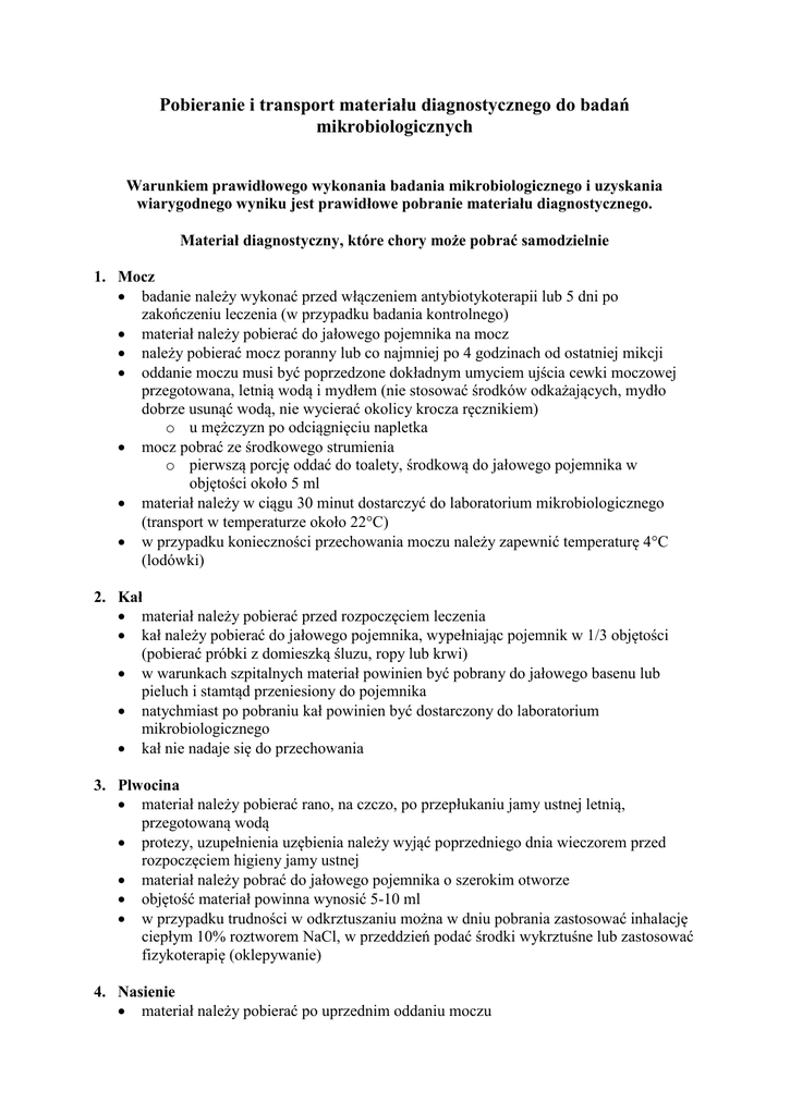 Pobieranie i transport materiału diagnostycznego do badań mikrobiologicznych Warunkiem prawidłowego wykonania badania mikrobiologicznego i uzyskania wiarygodnego wyniku jest prawidłowe pobranie materiału diagnostycznego. Materiał diagnostyczny, które chory może pobrać samodzielnie 1. Mocz badanie należy wykonać przed włączeniem antybiotykoterapii lub 5 dni po zakończeniu leczenia (w przypadku badania kontrolnego) materiał należy pobierać do jałowego pojemnika na mocz należy pobierać mocz poranny lub co najmniej po 4 godzinach od ostatniej mikcji oddanie moczu musi być poprzedzone dokładnym umyciem ujścia cewki moczowej przegotowana, letnią wodą i mydłem (nie stosować środków odkażających, mydło dobrze usunąć wodą, nie wycierać okolicy krocza ręcznikiem) o u mężczyzn po odciągnięciu napletka mocz pobrać ze środkowego strumienia o pierwszą porcję oddać do toalety, środkową do jałowego pojemnika w objętości około 5 ml materiał należy w ciągu 30 minut dostarczyć do laboratorium mikrobiologicznego (transport w temperaturze około 22C) w przypadku konieczności przechowania moczu należy zapewnić temperaturę 4C (lodówki) 2. Kał materiał należy pobierać przed rozpoczęciem leczenia kał należy pobierać do jałowego pojemnika, wypełniając pojemnik w 1/3 objętości (pobierać próbki z domieszką śluzu, ropy lub krwi) w warunkach szpitalnych materiał powinien być pobrany do jałowego basenu lub pieluch i stamtąd przeniesiony do pojemnika natychmiast po pobraniu kał powinien być dostarczony do laboratorium mikrobiologicznego kał nie nadaje się do przechowania 3. Plwocina materiał należy pobierać rano, na czczo, po przepłukaniu jamy ustnej letnią, przegotowaną wodą protezy, uzupełnienia uzębienia należy wyjąć poprzedniego dnia wieczorem przed rozpoczęciem higieny jamy ustnej materiał należy pobrać do jałowego pojemnika o szerokim otworze objętość materiał powinna wynosić 5-10 ml w przypadku trudności w odkrztuszaniu można w dniu pobrania zastosować inhalację ciepłym 10% roztworem NaCl, w przeddzień podać środki wykrztuśne lub zastosować fizykoterapię (oklepywanie) 4. Nasienie materiał należy pobierać po uprzednim oddaniu moczu ręce oraz prącie należy umyć przegotowaną, letnią wodą i mydłem (dobrze usunąć mydło wodą), osuszyć jednorazowym papierowym ręcznikiem materiał należy pobrać do jałowego pojemnika natychmiast po pobraniu próbkę nasienia należy dostarczyć do laboratorium mikrobiologicznego W przypadku wątpliwości i wskazań pobrania innego materiału diagnostycznego niż wyżej wymienione, prosimy o kontakt nr tel. - (52) 585 45 80