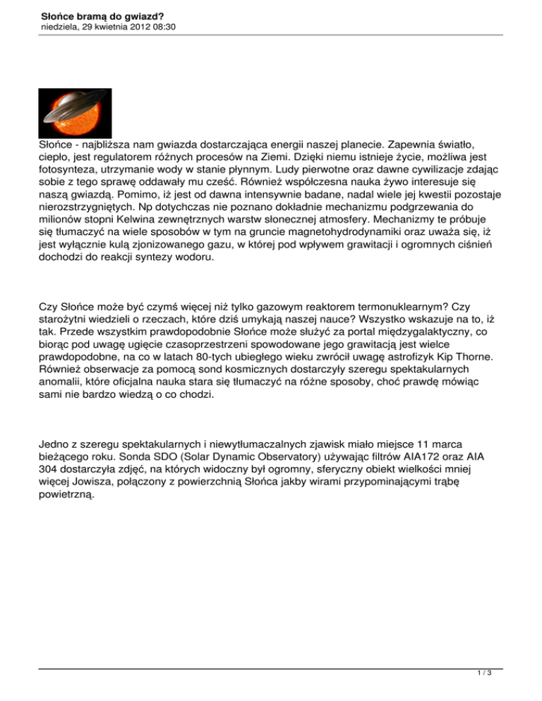 Słońce bramą do gwiazd? niedziela, 29 kwietnia 2012 08:30 Słońce - najbliższa nam gwiazda dostarczająca energii naszej planecie. Zapewnia światło, ciepło, jest regulatorem różnych procesów na Ziemi. Dzięki niemu istnieje życie, możliwa jest fotosynteza, utrzymanie wody w stanie płynnym. Ludy pierwotne oraz dawne cywilizacje zdając sobie z tego sprawę oddawały mu cześć. Również współczesna nauka żywo interesuje się naszą gwiazdą. Pomimo, iż jest od dawna intensywnie badane, nadal wiele jej kwestii pozostaje nierozstrzygniętych. Np dotychczas nie poznano dokładnie mechanizmu podgrzewania do milionów stopni Kelwina zewnętrznych warstw słonecznej atmosfery. Mechanizmy te próbuje się tłumaczyć na wiele sposobów w tym na gruncie magnetohydrodynamiki oraz uważa się, iż jest wyłącznie kulą zjonizowanego gazu, w której pod wpływem grawitacji i ogromnych ciśnień dochodzi do reakcji syntezy wodoru. Czy Słońce może być czymś więcej niż tylko gazowym reaktorem termonuklearnym? Czy starożytni wiedzieli o rzeczach, które dziś umykają naszej nauce? Wszystko wskazuje na to, iż tak. Przede wszystkim prawdopodobnie Słońce może służyć za portal międzygalaktyczny, co biorąc pod uwagę ugięcie czasoprzestrzeni spowodowane jego grawitacją jest wielce prawdopodobne, na co w latach 80-tych ubiegłego wieku zwrócił uwagę astrofizyk Kip Thorne. Również obserwacje za pomocą sond kosmicznych dostarczyły szeregu spektakularnych anomalii, które oficjalna nauka stara się tłumaczyć na różne sposoby, choć prawdę mówiąc sami nie bardzo wiedzą o co chodzi. Jedno z szeregu spektakularnych i niewytłumaczalnych zjawisk miało miejsce 11 marca bieżącego roku. Sonda SDO (Solar Dynamic Observatory) używając filtrów AIA172 oraz AIA 304 dostarczyła zdjęć, na których widoczny był ogromny, sferyczny obiekt wielkości mniej więcej Jowisza, połączony z powierzchnią Słońca jakby wirami przypominającymi trąbę powietrzną. 1/3 Słońce bramą do gwiazd? niedziela, 29 kwietnia 2012 08:30 Każdemu, tankowanie typu jest plazma okrągły znana zjawisko (kolor obiekt kto jednak plazmy. obserwowane ciemny). widział jest uważa końcem stosunku Widoczne zdjęcia, się, lejka, jest iżdym, za regularnie do który bliżej wiry najlepiej tego noszą sprawia niejasnych zjawiska ifilm nosi miano wrażenie -pewne na nazwę stanowisko powodów "kanałów myśl "uwydatnienia". obiektu przychodzi znajduje żarnikowych" NASA sferycznego. tylko było siębyle Natura tam jednoznaczne jedno Wg. tej Alexa skojarzenie anomalii Younga -w tego nie -i protuberancję Tłumaczenie okolicznościach. zachowuje samodzielnie co gwałtowne wyraźnie się przyśpieszenie widać mogłoby to plazmy. identycznie sprawdzić). Przede naWte udostępnionych być Czy wszystkim rozsądne, jak (oderwanie NASA Po za uważa tym wyraźnie w gdyby którego fotografiach. się), obiekt nas anie widać, zerwane za nie strumieniu idiotów, zmieniał Zakończeniu iż plazma kanały "ale", którym umieścimy swego które żarnikowe słoneczna można "tankowania" kształtu, zawsze kulisty powodują "omywa" był występują obiekt kitchłodniejsza solidny towarzyszy wcisnąć? (każdy ten ogromną w (twardy), obiekt takich może Dzień zdumienie. później Uformowała zaobserwowano się dziura jeszcze koronalna inny rodzaj w kształcie anomalii, trójkąta który równoramiennego. wprowadził wszystkich 2/3 Słońce bramą do gwiazd? niedziela, 29 kwietnia 2012 08:30 Według współczesną oczekiwanym przodkowie w przedstawicielami tym roku Nassima podczas oraz techniką znakiem mędrcy. Harameina cywilizacji premiery posiadały zapowiadanych pozaziemskich. dawne filmu wiedzę okultury, mają kontaktach przemian, naowe ten tym zwłaszcza temat. artefakty, mieszkańców w czasie Majowie, jakie których prekolumbijskiej rząd dziura mimo, mają Meksyku oiżtym przybyć niekształcie dysponowały obiecał Ameryki dawni jest ujawnić z przyjrzeć Zresztą... się podobny sposobowi symbolizm wŚwiadczyć jaki jest symbolizuje obecny się wszystkich Boga wPodobno katolicyzmie kulturach na i religiach całym globie. pochodnych. Wystarczy Jednak koronalny w słoneczny powrócił usunięto Jedynie zjawiskiem. przestrzeń na dzięki od wszystkie (CME). zachował tym "ciemnej" kosmiczną. filmowi nieNie kończą bazy się strony byłoby nawod Po YT sposób się 9wyrzucie Ziemi. jest wdo fenomeny. tym 20 możliwość wyjątkowy, Zdarzenie nic marca plazma dziwnego, Powstaniu br, zapoznania tak, zmierza było a zawierające gdyby jakby tak dziury od nietypowe, odbił się nie Słońca. towarzyszył zzachowanie informacje się tymod Jednak jakże iż niewidzialnej wkrótce gigantyczny fascynującym na się 13 temat plazmy po marca tym tej przeszkody br wyrzut wydarzeniu anomalii. wyrzuconej wiatr i 3/3