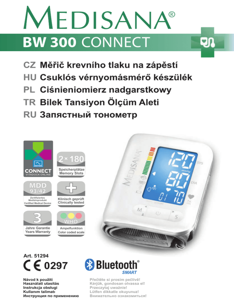 BW 300 CONNECT CZ HU PL TR RU Měřič krevního tlaku na zápěstí Csuklós vérnyomásmérő készülék Ciśnieniomierz nadgarstkowy Bilek Tansiyon Ölçüm Aleti Запястный тонометр VITADOCK ONLINE Art. 51294 0297 Návod k použití Használati utasítás Instrukcja obsługi Kullanım talimatı Инструкция по применению ® Přečtěte si prosím pečlivě! Kérjük, gondosan olvassa el! Przeczytaj uważnie! Lütfen dikkatle okuyunuz! Внимательно ознакомиться! CZ Návod k použití 1 Bezpečnostní pokyny ............................. 1 2 Užitečné informace ................................ 5 3 Uvedení do provozu ............................... 7 4 Použití .................................................... 9 5 Paměť .................................................... 10 6 Různé ..................................................... 11 7 Záruka .................................................... 14 HU Használati utasítás 1 Biztonsági utasítások ............................. 15 2 Tudnivalók.............................................. 19 3 Üzembe helyezés................................... 21 4 Használat ............................................... 23 5 Memória ................................................. 24 6 Egyéb..................................................... 25 7 Jótállás................................................... 28 PL Instrukcja obsługi 1 Wskazówki dotyczące bezpieczeństwa . 29 2 Warto wiedzieć....................................... 33 3 Uruchamianie......................................... 35 4 Stosowanie ............................................ 37 5 Pamięć ................................................... 38 6 Informacje różne .................................... 39 7 Gwarancja.............................................. 42 TR Kullanım talimatı 1 Güvenlik bilgileri..................................... 43 2 Bilinmesi gerekenler............................... 47 3 Devreye alma......................................... 49 4 Kullanım ................................................. 51 5 Hafıza..................................................... 52 6 Çeşitli bilgiler.......................................... 53 7 Garanti ................................................... 56 RU Инструкция по применению 1 Указания по безопасности ................... 57 2 Полезные сведения.............................. 61 3 Ввод в действие ................................... 63 4 Применение .......................................... 65 5 Память .................................................. 66 6 Разное ................................................... 67 7 Гарантия................................................ 70 Otevřete prosím tuto stranu a nechte ji k rychlé orientaci otevřenou! Hajtsa ki ezt az oldalt és hagyja kihajtva a gyors tájékozódás érdekében! Otwórz tę stronę i dla szybszej orientacji zostaw zawsze otwartą! Lütfen bu sayfayı açınız ve hızlı uyum için bu sayfayı açık bırakınız. Přístroj a ovládací prvky A készülék és a kezelőelemek Urządzenie i elementy obsługi Cihaz ve Kullanma Elemanları Прибор и органы управления SYS DIA D M Pul. min. DATE / MEMORY CZ HU Spínač "LOCK" USB přípojka LCD displej Manžeta na zápěstní kloub Tlačítko "M" (Memory / paměť) Tlačítko Start / Stop Tlačítko "S" (Set / zadání) Indikace systolického tlaku Indikace diastolického tlaku Uživatelská paměť Indikátor tepové frekvence Indikátor paměti / času / data Slabý akumulátor Symbol Bluetooth Indikátor tepu / arytmie Symbol „Nehýbat se“ Symbol nafukování / vypouštění vzduchu Indikátor tlaku krve (zelený - žlutý - oranžový - červený) "LOCK" - kapcsoló USB - csatlakozó LCD - kijelző Csuklómandzsetta "M" - gomb (memória / tárolás) Start / stop - gomb "S" - gomb (beállítás / bevitel) Szisztolés nyomás kijelzése Diasztolés nyomás kijelzése Felhasználói memória Pulzusfrekvencia kijelzése Tároló- / idő- / dátumkijelző Akkumulátor gyenge Bluetooth - szimbólum Pulzus- / aritmia-kijelző "Do not move" symbol Felpumpálás - / leengedés-szimbólum Vérnyomásjelző (zöld - sárga - narancs - piros) PL TR Przełącznik „LOCK“ Port USB Wyświetlacz LCD Mankiet na nadgarstek Przycisk „M“ (memory / pamięć) Przycisk start / stop Przycisk „S“ (set) Wskaźnik ciśnienia tętniczego skurczowego Wskaźnik ciśnienia tętniczego rozkurczowego Pamięć użytkownika Wskaźnik częstości tętna Wyświetlacz pamięci / godziny / daty Słaba bateria Symbol Bluetooth Wskaźnik tętna / arytmii Symbol: Nie poruszać Symbol nadmuchiwania / wypuszczania powietrza Wskaźnik ciśnienia tętniczego krwi (zielony - żółty -pomarańczowy - czerwony) “LOCK” - Düğmesi USB Bağlantı Noktası LCD Ekran Bilek manşet “M” - Tuşu (Bellek/Kayıt) Başlatma / Durdurma Tuşu “S” - Tuşu (Ayar / Girdi) Sistolik basınç göstergesi Diastolik basınç göstergesi Kullanıcı Belleği Nabız frekansı göstergesi Bellek / Saat / Tarih Göstergesi Pil zayıf Bluetooth Simgesi Darbe / Ritim Bozukluğu Göstergesi Hareket ettirme simgesi Şişirme / Hava Basma Simgesi Tansiyon İndikatörü (yeşil - sarı - portakal rengi - kırmızı) RU Переключатель блокировки «LOCK» Разъем USB ЖК-экран Манжета Кнопка «М» (память/накопитель памяти) Кнопка Start - / Stop Кнопка «S» (ввод данных) Индикация систолического давления Индикация диастолического давления Сохранение данных пользователя Индикация частоты пульса Индикация памяти/ врем
